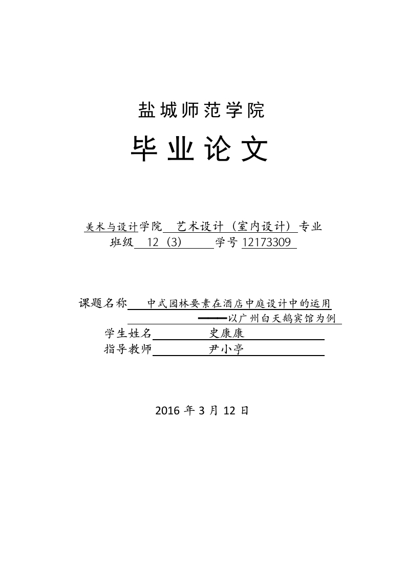 盐城师范学院毕业论文美术与设计学院艺术设计(室内设计)专业班级12(3)学号12173309课题名称中式园林要素在酒店中庭设计中的运用—一以广州白天鹅宾馆为例学生姓名史康康指导教师尹小亭2016年3月12日中式园林要素在酒店中庭设计中的运用一以广州白天鹅宾馆为例摘要本文第一部分先对中式古典园林及其要素进行分析,了解中式园林构成因素:第二部分对中式园林要素在现代酒店中庭空间绿化的运用分析,并了解中式园林在酒店中庭设计中的应用原则:最后以广州白天鹅酒店为案例,详细分析中式园林要素在广州白天鹅酒店中庭的运用方法。通过具体案例的分析,得出中式园林要素在现在酒店中庭空间的具体运用方法,为以后在酒店中庭设计中运用中式园林要素提供一些建议。将中式园林的造景手法与元素运用到现代几何空间中,与现代中庭空间的融合,标志着酒店中庭景观设计发展的必然趋势。【关键词】中式园林:中式园林要素:中庭景观设计:应用原则:The application of Chinese landscape elements in the hotelatrium design--The white swan hotel in guangzhou as an exampleAbstractThe first part of this paper to analyze the Chinese classical garden and its elements,learn Chinese landscape factors.The second part for Chinese garden elements in modernhotel atrium space greening of analytical,and understand Chinese garden in theapplication of the hotel atrium design principles.The white swan hotel in guangzhou as acase,a detailed analysis of Chinese style garden elements using the method of the atriumin guangzhou white swan hotel.Through the analysis of specific case,it is concluded thatChinese garden elements in hotel now concrete application method of the atrium space forlater in the hotel atrium design with Chinese landscape to provide some Suggestions.To use Chinese style garden landscape and elements to modern geometry space,and thefusion of modern atrium space,marked the hotel atrium landscape design developmentinevitable trend.Key words:Chinese garden;Chinese landscape;The atrium landscape design;application of the principles