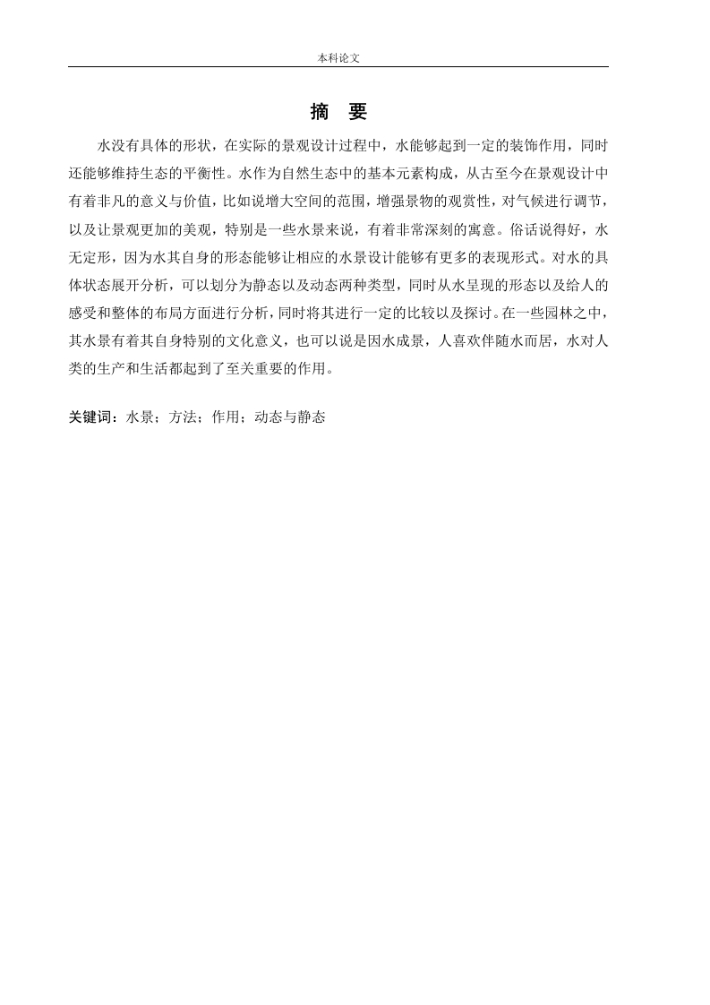 本科论文摘要水没有具体的形状,在实际的景观设计过程中,水能够起到一定的装饰作用,同时还能够维持生态的平衡性。水作为自然生态中的基本元素构成,从古至今在景观设计中有着非凡的意义与价值,比如说增大空间的范围,增强景物的观赏性,对气候进行调节,以及让景观更加的美观,特别是一些水景来说,有着非常深刻的寓意。俗话说得好,水无定形,因为水其自身的形态能够让相应的水景设计能够有更多的表现形式。对水的具体状态展开分析,可以划分为静态以及动态两种类型,同时从水呈现的形态以及给人的感受和整体的布局方面进行分析,同时将其进行一定的比较以及探讨。在一些园林之中,其水景有着其自身特别的文化意义,也可以说是因水成景,人喜欢伴随水而居,水对人类的生产和生活都起到了至关重要的作用。关键词:水景:方法:作用:动态与静态本科论文AbstractThere is no specific shape for water.In the actual landscape design process,water canplay a certain decorative role,while also maintaining ecological balance.Water,as thebasic element of natural ecology,has been of extraordinary significance and value inlandscape design since ancient times,such as increasing the range of space,enhancing theornamental of the scenery,regulating the climate,and making the landscape more beautiful,Especially for some water features,it has a very profound meaning.As the saying goes,water is amorphous,because the shape of water itself allows the corresponding waterscapedesign to have more expressions.The analysis of the specific state of water can be dividedinto static and dynamic types.At the same time,it analyzes the form of water and thefeelings and overall layout of the water.At the same time,it is compared and discussed.Insome gardens,the waterscape has its own special cultural significance.It can also be saidthat because of the waterscape,people like to live with water.Water plays a vital role inhuman production and life.Key words:Waterscape;Method;Function;Dynamic and Static本科论文目录第1章绪论,1.1选题背景和意义…21.2国内外研究现状21.2.1ASLA住宅景观设计类荣誉奖:瑞士苏黎世生态泳池花园21.2.2ASLA专业奖:多伦多SherbourneCommon社区公园..1.2.3中国北京丰台区世华水岸景观设计31.2.4城市里的坡地别墅:中国北京中体奥林匹克花园…31.2.5中国无锡天安曼哈顿景观设计…第2章水体景观自身的形态…42.1园林景观设计基本概述…2.2园林景观设计中水景设计的作用2.2.1衬托作用.42.2.2焦点作用…2.2.3点缀作用第3章静态水景与动态水景观的形态特征3.1园林景观设计中营造水景….63.1.1提高园林景观的柔化性.63.1.2满足园林景观的多元化需求63.1.3凸显东方美学的特点3.2园林景观设计中水景的营造方法3.2.1动态与静态的有机结合3.2.2水景与植物的相互融合.…3.2.3山石与水景的搭配83.2.4实现动植物搭配合理性83.3园林水景设计原则…3.3.1宜“活”不宜“死的原则.…9