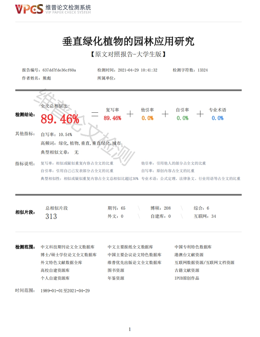 维普论文检测系统VIP PAPER CHECK SYSTEM垂直绿化植物的园林应用研究【原文对照报告-大学生版】报告编号:637dd7fde36cf60a检测时间:2021-04-2910:41:32检测字符数:13324作者姓名:熊彪所属单位:全文总相似比复写率他引率自引率专业术语检测结论:89.46%89.46%0.0%0.0%0.0%其他指标:自写率:10.54%高频词:绿化,植物,垂直,垂直绿化,城市典型相似文章:无指标说明:复写率:相似或疑似重复内容占全文的比重他引率:引用他人的部分占全文的比重自引率:引用自己已发表部分占全文的比重自写率:原创内容占全文的比重典型相似性:相似或疑似重复内容占全文总相似比超过30%专业术语:公式定理、法律条文、行业用语等占全文的比重总相似片段期刊:65博硕:208综合:6相似片段:313外文:0自建库:0互联网:34检测范围:中文科技期刊论文全文数据库中文主要报纸全文数据库中国专利特色数据库博士/硕士学位论文全文数据库中国主要会议论文特色数据库港澳台文献资源外文特色文献数据全库维普优先出版论文全文数据库互联网数据资源/互联网文档资源高校自建资源库图书资源古籍文献资源个人自建资源库年鉴资源IPUB原创作品时间范围:1989-01-01至2021-04-29维普论文检测系统VIP PAPER CHECK SYSTEM原文对照颜色标注说明:■自写片段■复写片段(相似或疑似重复)引用片段(引用)■专业术语(公式定理、法律条文、行业用语等)上海应用技术大学继续教育学院理工类本科毕业论文论文题目垂直绿化植物园林应用研究专业园林班级191151学号191151017检测学生熊彪指导教师周玉梅日期2021年4月制垂直绿化植物园林应用研究摘要随着城市化进程的不断加剧,城市用地日益紧张、绿地面积不断缩小,城市生态环境也随之不断恶化。垂直绿化不仅能够弥补地面绿化的不足,丰富绿化层次,有助于恢复生态,还可以增加城市及园林建筑的艺术效果,在城市绿化中具有极大的发展和应用前途。本文主要就垂直绿化植物在城市园林的应用进行了探讨,通过对垂直绿化植物概念、生态习性、观赏特点、应用方式、园林用途等方面进行了归纳,分析了垂直绿化植物在城市园林建设中的生态特性、观赏特性等相关功能,总结出垂直绿化植物在不同性质和功能的园林绿地中的配置原则和方式。同时,对垂直绿化植物与山石、水体和园林建筑等造园要素相结合的应用方式进行了分析,以期为垂直绿化植物在城市绿地中的应用提供理论依据。关键词:园林绿化:垂直绿化:绿化覆盖AbstractWith the development of urbanization,urban land is increasingly tense,green space area isshrinking,and urban ecological environment is deteriorating.Vertical greening can not only make upfor the lack of ground greening,enrich the greening level,help to restore ecology,but alsoincrease the artistic effect of city and landscape architecture,which has great development andapplication prospects in urban greening.This paper mainly discusses the application of verticalgreening plants in urban gardens,and analyzes the ecological characteristics,ornamentalcharacteristics and other related functions of vertical greening plants in urban garden constructionby summarizing the concept,ecological habits,ornamental characteristics,application methods andgarden uses of vertical greening plants,The configuration principles and methods of verticalgreening plants in different properties and functions of green space were summarized.At the same2维普论文检测系统VIP PAPER CHECK SYSTEMtime,the application of vertical greening plants combined with landscape elements such as rocks,water and landscape architecture was analyzed,in order to provide a theoretical basis for theapplication of vertical greening plants in urban green space.Key words:Landscape greening:vertical greening:green coverage目录1绪论11.1研究背景11.2研究意义11.3研究现状11.4研究方法32垂直绿化的相关概述32.1垂直绿化的定义42.2垂直绿化植物42.3植物配置40以2.4园林垂直绿化植物的功2.4.1生态功能52.4.2美化功能52.4.3防护功能52.4.4生产功能52.5.1攀缘植物62.5.2悬垂植物7论文检测2.5城市园林垂直绿化植物资源分类62.5.3矮生植物73园林垂直绿化植物的应用基础83.1垂直绿化植物的适用性83.2垂直绿化植物的景观性83.3园林绿化植物的配置方法104城市园林垂直绿化植物的应用104.1墙面绿化104.2廊架绿化114.3立柱绿化114.4篱垣绿化124.5立交桥绿化124.6建筑阳台、窗台绿化124.7护坡绿化125城市垂直绿化植物选择应用建议135.1提高植物种类多样性135.2丰富垂直绿化新形式135.3同步建筑设计与绿化135.4建立综合的节能体系135.5发挥政策推动力作用14结论14致谢153参考文献1531绪论1.1研究背景我国城市绿化建设取得了一些成绩,但对照国外的一些花园城市,仍然存在较大差距,为了进一步提高城市绿3