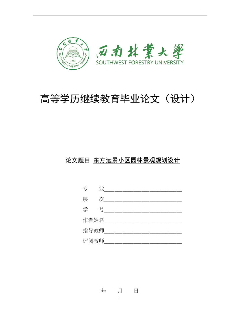 138SOUTHWEST FORESTRY UNIVERSITY高等学历继续教育毕业论文((设计)论文题目东方远景小区园林景观规划设计专业层次学号作者姓名指导教师评阅教师年月日诚信承诺我承诺在毕业论文(设计)过程中遵守学校有关规定,格守学术规范,论文(设计)中所使用的相关资料、数据、观点等真实可靠,对引用的他人材料、数据、观点均已注释说明来源,不存在剽窃、抄袭他人的学术观点、思想和成果,不存在伪造、篡改实验数据。如有违规行为发生,我承担一切责任,接受学校的处理,并承担相应的法律责任。学生(签名):年月日东方远景小区园林景观规划设计摘要摘要随着我国经济水平的提高,人们原来越重视居住区环境建设,居住区是城市构成细胞,这个组成单位应充分体现城市的建筑文化传统、居住环境文脉、城市景观环境等要素。东方远景小区设计前期通过查阅相关资料进行实践研究总结经验与教训,并对小区周围人群进行特征分析,将市民的需求和南方文化融入设计中。以及后期基质现状的调查和设计方案的落实,力求将以人为本的原则贯穿整个设计方案中,为市民打造一个一个融生态、科学、艺术与文化为一体的理想空间环境。关键词:东方远景:园林景观;南方园林:以人为本
