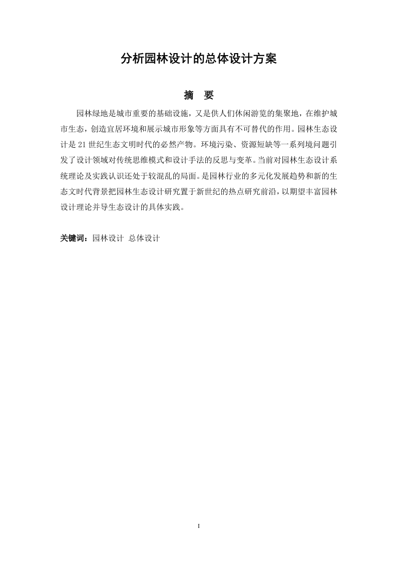 分析园林设计的总体设计方案摘要园林绿地是城市重要的基础设施,又是供人们休闲游览的集聚地,在维护城市生态,创造宜居环境和展示城市形象等方面具有不可替代的作用。园林生态设计是21世纪生态文明时代的必然产物。环境污染、资源短缺等一系列境问题引发了设计领域对传统思维模式和设计手法的反思与变革。当前对园林生态设计系统理论及实践认识还处于较混乱的局面。是园林行业的多元化发展趋势和新的生态文时代背景把园林生态设计研究置于新世纪的热点研究前沿,以期望丰富园林设计理论并导生态设计的具体实践。关键词:园林设计总体设计AbstractGarden green space is the important infrastructure of city,it is for people to relaxand visit the place,in the maintenance of city ecosystem,creating a livableenvironment and shows the city image plays an irreplaceable role.Ecologicallandscape design is the inevitable product of the twenty-first Century era of ecologicalcivilization.Environmental pollution,shortage of resources and a series ofenvironmental problems caused by the design of the traditional mode of thinking anddesign methods of the reflection and reform.On the theory and practice of ecologicalgarden design system is still in chaos.Garden industry is the development trend ofdiversification and new ecological culture era background to landscape ecologicaldesign research in the new century the hot research frontiers,in the hope of enrichingthe landscape design theory and practice of ecological design guide.Key words landscape design,overall design目录前一、现代园林设计的概况..·1(一)园林设计的概念.....(二)我国园林设计的发展状况.2二、以北京市龙潭湖公园为例分析总设计方案…2(二)设计中要遵守的原则.1、营造适地景观原则..22、人工与自然结合原则..3、水景与绿化结合原则..3三、总体规划分区的设计...345