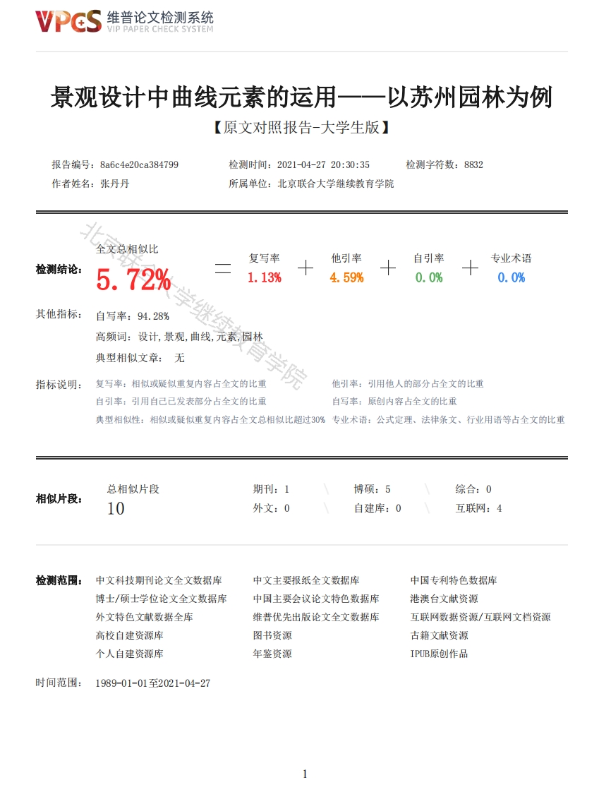 维普论文检测系统/IP PAPER CHECK SYSTEM景观设计中曲线元素的运用一一以苏州园林为例【原文对照报告-大学生版】报告编号:8a6c4e20ca384799检测时间:2021-04-2720:30:35检测字符数:8832作者姓名:张丹丹所属单位:北京联合大学继续教育学院全文总相似比复写率他引率自引率专业术语检测结论:5.72%1.13%4.59%0.0%0.0%其他指标:自写率:94.28%高频词:设计,景观,曲线,元素,园林典型相似文章:无指标说明:复写率:相似或疑似重复内容占全文的比重他引率:引用他人的部分占全文的比重自引率:引用自己已发表部分占全文的比重自写率:原创内容占全文的比重典型相似性:相似或疑似重复内容占全文总相似比超过30%专业术语:公式定理、法律条文、行业用语等占全文的比重总相似片段期刊:1博硕:5综合:0相似片段:10外文:0自建库:0互联网:4检测范围:中文科技期刊论文全文数据库中文主要报纸全文数据库中国专利特色数据库博士/硕士学位论文全文数据库中国主要会议论文特色数据库港澳台文献资源外文特色文献数据全库维普优先出版论文全文数据库互联网数据资源/互联网文档资源高校自建资源库图书资源古籍文献资源个人自建资源库年鉴资源IPUB原创作品时间范围:1989-01-01至2021-04-27维普论文检测系统VIP PAPER CHECK SYSTEM原文对照颜色标注说明:■自写片段■复写片段(相似或疑似重复)口引用片段(引用)■专业术语(公式定理、法律条文、行业用语等)北京联合大学继续教育学院专科毕业论文(设计)题目:景观设计中曲线元素的运用一以苏州园林为例姓名:张丹丹学号:2019071072006校区:北四环校专业:广告设计与制作指导教师:车雅军2021年04月26日摘要在当今的景观设计中,曲线元素常以多种形式出现在大众视野。而景观设计作为一个重视空间和美感的设计领域,其中的“曲线”元素不仅可以更有效的利用空间,而且也可以作为一种景观语言来表达作品。如果说20世纪之前的设计,追求的是“曲线”的辅助作用,那么今天随着科技的发展,多元化的设计表达式在现代和当代艺术,“曲线”开始发挥作用,广泛应用于景观设计。故而,为了能够深入了解“曲线”在当今景观设计中的设计和应用,本文首先总结了20世纪出现的现代景观设计中的“曲线”元素,然后以苏州园林为例进行分析。目的是探讨景观作品中曲线的元素和造型语言,研究曲线元素的各种结构体系和结构,即研究作为创作作品的“曲线”元素,希望为景观发展提供研究基础。关键词:曲线:景观设计:空间:苏州园林AbstractIn today's landscape design,curviline elements exist in a variety of forms.Landscape design isa design field that attaches importance to space and beauty.The element of "curve"can not only2维普论文检测系统VIP PAPER CHECK SYSTEMmake more effective use of space,but also be used as a landscape language to express works.If wesay that in the design before the 20th century,"curve"plays an auxiliary role in design creation,then with the development of science and technology today,with the diversification of designexpressions in modern and contemporary art,"curve"begins to play its role and is widely used inlandscape design.In order to understand the design and application of "curve"in current landscapedesign,this paper first summarizes the "curve"element in the modern landscape design that emergedin the 20th century,and then takes Suzhou gardens as a case for analysis.The purpose is to discussthe elements and modeling language of curves in landscape works,and to study the various structuralsystems and structures of curve elements,that is,to study the "curve"elements as the creationworks,hoping to provide a research foundation for landscape development.Key Words:Curve;Landscape design:Space;Suzhou gardens目录引言141景观设计中“曲线元素”的概述21.1景观设计“曲线元素”的概念认知21.2曲线元素在景观设计中的发展21.3创作中“曲线”元素的表现方式22“曲线元素”在苏州园林景观设计中的运用32.1“曲线”与建筑物的结合32.2“曲线”与山水的结合32.3“曲线”与行道相结合42.4整体布局中的曲线元素5教育学院3“曲线元素”在现代景观设计应用中的策略73.1现代景观设计的原则73.2用“曲线元素”拓展景观空间73.3用“曲线元素”强化虚实的对比手法7结论9参考文献10致谢11引言在当今这个物质生活极大丰富的社会里,现代的人们对于景观设计风格中千篇一律的形象已经没有了新鲜感、在人们心中更渴望多样化、复杂性、新鲜感的精神世界的追求。为了实现人们的渴望,现代景观设计师们也在不断得在实践中探索着新的方案,希望可以从不同视觉角度对现代景观设计进行理解和概括,各种流行景观设计思维如潮水般的冲击着传统景观的设计风格,从而表达出了人们对个性化的追求。在人们追求个性化的过程中最好的媒介就是曲线元素。它的形态、抽象和随机性等特征非常符合现代人们对景观设计的追求,于是人们的视野中就出现了各种形式的曲线元素设计景观。当代景观设计师当然不会满足过于简单的曲线元素的景观设计,他们更加努力的寻求多元化的创作思维,将这种思维融入到景观设计中,创造非线性形态,人们在现代设计师不断的创作中刷新了对现代景观的认知和感悟,景观设计师们推崇着曲线元素的原因不仅是因为它独有的特征更是为了兼顾地域性、文化性体验需求。1景观设计中“曲线元素”的概述1.1景观设计“曲线元素”的概念认知在数学定义中,曲线是由一个动点运动时