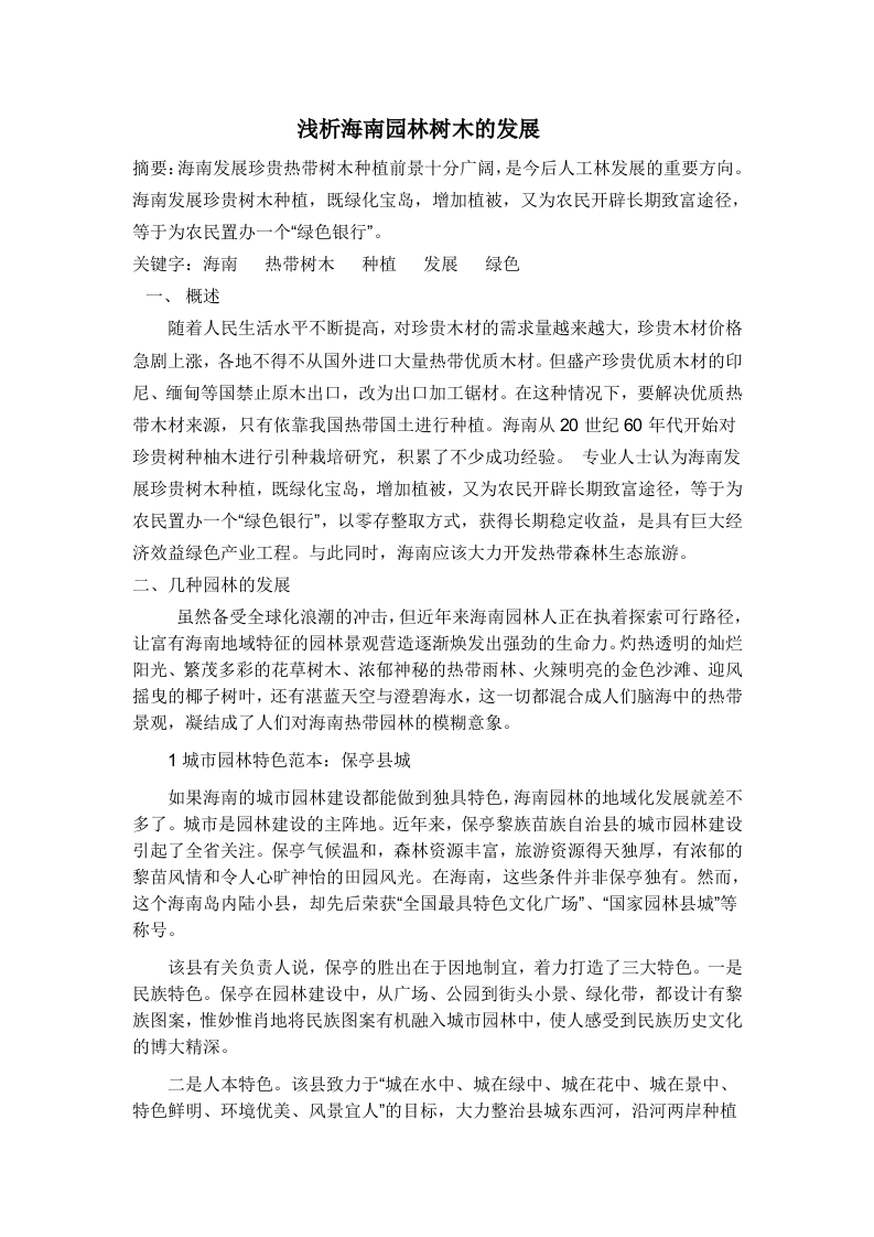 浅析海南园林树木的发展摘要:海南发展珍贵热带树木种植前景十分广阔,是今后人工林发展的重要方向。海南发展珍贵树木种植,既绿化宝岛,增加植被,又为农民开辟长期致富途径,等于为农民置办一个“绿色银行”。关键字:海南热带树木种植发展绿色一、概述随着人民生活水平不断提高,对珍贵木材的需求量越来越大,珍贵木材价格急剧上涨,各地不得不从国外进口大量热带优质木材。但盛产珍贵优质木材的印尼、缅甸等国禁止原木出口,改为出口加工锯材。在这种情况下,要解决优质热带木材来源,只有依靠我国热带国土进行种植。海南从20世纪60年代开始对珍贵树种柚木进行引种栽培研究,积累了不少成功经验。专业人士认为海南发展珍贵树木种植,既绿化宝岛,增加植被,又为农民开辟长期致富途径,等于为农民置办一个“绿色银行”,以零存整取方式,获得长期稳定收益,是具有巨大经济效益绿色产业工程。与此同时,海南应该大力开发热带森林生态旅游。二、几种园林的发展虽然备受全球化浪潮的冲击,但近年来海南园林人正在执着探索可行路径,让富有海南地域特征的园林景观营造逐渐焕发出强劲的生命力。灼热透明的灿烂阳光、繁茂多彩的花草树木、浓郁神秘的热带雨林、火辣明亮的金色沙滩、迎风摇曳的椰子树叶,还有湛蓝天空与澄碧海水,这一切都混合成人们脑海中的热带景观,凝结成了人们对海南热带园林的模糊意象。1城市园林特色范本:保亭县城如果海南的城市园林建设都能做到独具特色,海南园林的地域化发展就差不多了。城市是园林建设的主阵地。近年来,保亭黎族苗族自治县的城市园林建设引起了全省关注。保亭气候温和,森林资源丰富,旅游资源得天独厚,有浓郁的黎苗风情和令人心旷神怡的田园风光。在海南,这些条件并非保亭独有。然而,这个海南岛内陆小县,却先后荣获“全国最具特色文化广场”、“国家园林县城”等称号。该县有关负责人说,保亭的胜出在于因地制宜,着力打造了三大特色。一是民族特色。保亭在园林建设中,从广场、公园到街头小景、绿化带,都设计有黎族图案,惟妙惟肖地将民族图案有机融入城市园林中,使人感受到民族历史文化的博大精深。二是人本特色。该县致力于“城在水中、城在绿中、城在花中、城在景中、特色鲜明、环境优美、风景宜人”的目标,大力整治县城东西河,沿河两岸种植鲜花绿草:建成七仙公园等一批公园,园内乡土植物众多,大树摇曳、绿草萋萋、鲜花盛开,成为市民游客健身、休闲、娱乐的好去处。三是大园林特色。将七仙岭温泉国家森林公园划入县城城区。在森林公园连接县城主城区8公里长的七仙大道两旁各建10米宽的绿化带,营造了一条绿色长廊。碧水绿草相辉映的保城东西河,把主城区环抱其中,形成山、水、林、草、园一体的大山水特色。保亭为什么能够评上国家园林县城,就是因为对当地园林资源进行了充分挖掘,将黎族图腾、黎锦符号等结合到园林景观、小品雕塑中,将乡土树种、热带雨林景观糅合到景观建设中。如果要从海南城市园林中寻找一个范本,保亭胜出的可能性比较大。城市园林的建造要从自然环境、地域文化和历史文脉挖掘出地域景观的表达素材与表达方法。而热带城市园林景观的营造,还必须顺应热带特有的生态环境营造,考虑城市景观构成要素、布局、空间位置及互相联系,做到热带城市景观的生态优化再设计。如今,细心的人会发现,走到各市县看到的市政树种有很多雷同的地方。比如这几年海口种细叶榄仁效果不错,其他市县就纷纷效仿,新建街道上都是细叶榄仁。如果追溯到更早期,海口种大叶榕,各个市县也都跟着种大叶榕。要发展地域性园林,就必须避免这种抄袭的懒政思维。虽然热带、雨林、海洋、民族等特色在海南具有一定的普遍性,但是如果详加研究,海南各城市还是能够创造出自己的特色来。例如,树木在园林中所占分量很重,海南岛不大,但气候还是有不小的差异,相应的植物分布也有所区别。针对地域特色,海南可以做一个树种区划乃至绿地系统规划指导意见,来指导市县园林的差异化发展。2景区园林特色范本:呀诺达随着国际旅游岛建设的展开,旅游景区的规划建设已成为极为重要的一个环节。作为地域文化重要承载体,景区园林建设担负着以差异化吸引游客的重要职责。海南从古到今,众多景区的园林建设,正在日益体现地域性、差异化的原则。五公祠是海南古典园林的典范。其中,琼园是园林主景区,内有一池一岛二桥一亭,桥为石拱式,栏杆用码头泊船柱的形式,亭用连体窗顶的形式,均是中国传统园林的手法。即使是建于明代,这座园林中依然掺杂了不少海南元素。例如,假山是以海南特有的珊瑚石堆砌而成,而且园中含有大量乡土树种。如果要论海南的大型城市景区,万绿园无法回避。这座建于1990年代中期的公园,总面积千余亩,绿化率达84%以上。园内栽种近万棵以椰树为主的热带树木,还种植国内外热带、亚热带观赏植物300-500种,将蓝天、绿水、原野、现代化高楼融为一体,充分体现热带风光、海滨特色、国际性旅游城市的特点。万绿园的确名实相副。唯一不足的地方在于,没有如广州越秀山公园的五羊雕塑一样的标志性景观,使之无法成为令海口市骄傲的城市名片。近年来受到广泛赞誉的呀诺达热带雨林景区,被视