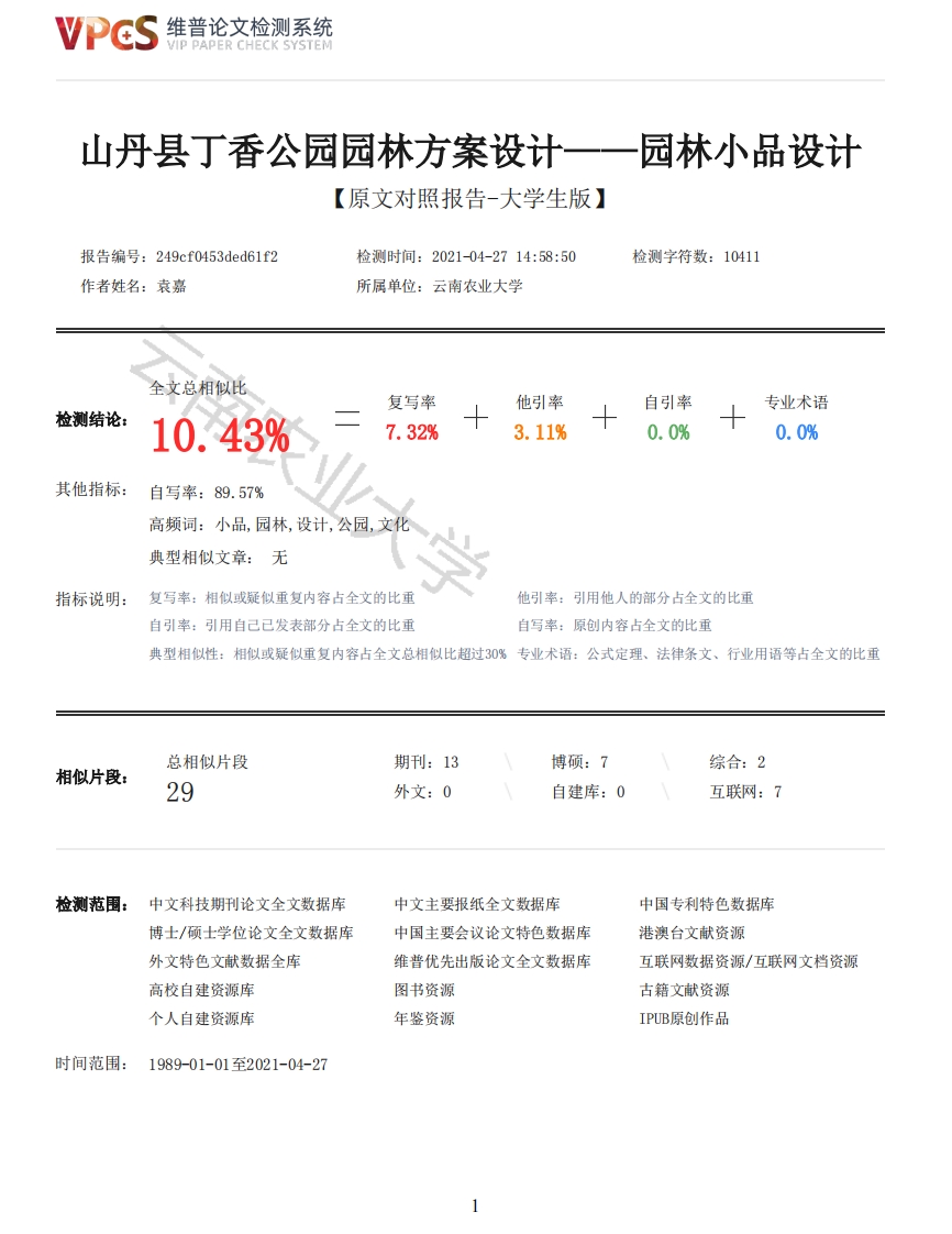 维普论文检测系统/IP PAPER CHECK SYSTEM山丹县丁香公园园林方案设计一一园林小品设计【原文对照报告-大学生版】报告编号:249cf0453ded61f2检测时间:2021-04-2714:58:50检测字符数:10411作者姓名:袁嘉所属单位:云南农业大学全文总相似比复写率他引率自引率专业术语检测结论:10.43%7.32%3.11%0.0%0.0%其他指标:自写率:89.57%高频词:小品,园林,设计,公园,文化典型相似文章:无指标说明:复写率:相似或疑似重复内容占全文的比重他引率:引用他人的部分占全文的比重自引率:引用自己已发表部分占全文的比重自写率:原创内容占全文的比重典型相似性:相似或疑似重复内容占全文总相似比超过30%专业术语:公式定理、法律条文、行业用语等占全文的比重总相似片段期刊:13博硕:7综合:2相似片段:29外文:0自建库:0互联网:7检测范围:中文科技期刊论文全文数据库中文主要报纸全文数据库中国专利特色数据库博士/硕士学位论文全文数据库中国主要会议论文特色数据库港澳台文献资源外文特色文献数据全库维普优先出版论文全文数据库互联网数据资源/互联网文档资源高校自建资源库图书资源古籍文献资源个人自建资源库年鉴资源IPUB原创作品时间范围:1989-01-01至2021-04-27维普论文检测系统VIP PAPER CHECK SYSTEM原文对照颜色标注说明:■自写片段■复写片段(相似或疑似重复)口引用片段(引用)■专业术语(公式定理、法律条文、行业用语等)山丹县丁香公园园林方案设计一园林小品设计袁嘉(云南农业大学园林园艺学院,昆明650201)摘要从古至今,园林小品都是城市公园设计中必不可少的要素,随着时代的快速发展,人们对于园林小品的要求越来越高,早已不满足于其实用性,越来越注重小品的观赏性以及其所具有的内在含蕴。园林小品在园林设计中也从一开始的以实用性为主的小型园林建筑发展为集生态性、服务性、功能性、艺术性、文化性等多种特性为一体的人性化景观构筑物。本文从园林小品的概念出发,分析了园林小品作用以及其设计原则,然后以山丹县丁香公园为例,详细的讲述了丁香公园中的饰景类小品、休息类小品、灯光照明类小品、服务类小品以及展示类小品这五类小品的设计原则,介绍了丁香公园中每一类具有代表性的小品的设计理念并给出其具体的尺寸和材质。在分析丁香公园的园林小品设计案例的基础上,也提出了自己对小品设计的思考,希望可以对之后的城市公园小品设计有一定的参考价值。关键字:城市公园;园林小品;园林小品分类:园林小品设计原则Shandan County,Lilac Park landscape design一Garden sketch designYuan Jia(Garden school of horticulture,Yunnan Agricultural University,Kunming,650201)ABSTRACTFrom ancient times to the present,garden sketches have been an essential element in the designof urban parks.With the rapid development of the times,people's requirements for garden sketcheshave become higher and higher.They have long been not satisfied with their practicality and arepaying more and more attention to sketches.Appreciation and its inherent implications.In thegarden design,garden sketches have also developed from the small-scale garden architecture withpracticality at the beginning to a humanized landscape structure elogical,service,functional,artistic,cultural and other characteristics.Starting from the concept of garden sketches,this article analyzes the role of garden sketchesand their design principles.Then,taking Dingxiang Park in Shandan County as an example,itdescribes in detail the decoration sketches,resting sketches,lighting sketches,and lightingsketches in Dingxiang Park.The design principles of the five types of sketches,service sketchesand display sketches,introduce the design concepts of each type of representative sketches inDingxiang Park and give their specific sizes and materials.Based on the analysis of the gardensketch design case of Lilac Park,I also put forward my own thoughts on sketch design,hoping to2维普论文检测系统VIP PAPER CHECK SYSTEMhave a certain reference value for the design of urban park sketches in the future.Key words:City park;garden sketches;sketch classification;sketch design principle山丹县丁香公园园林方案设计一园林小品设计1引言中国园林小品历史悠久,主要起源于园林建筑及石文化,即早期的台、榭、亭等园林建筑到后来的假山、置石。早期的园林小品功能单一,大多作为稍作休憩的场所和起观景点景之用。随着社会物质生活水平的提高,人们对园林精神方面的需求也不断增加,园林的内涵、类型、特点以及功能等都发生了较大变化。在传统园林中,大部分的园林是隶属于私人的,而现代园林主要服务于所有大众的,故园林小品也在园林设计中也从一开始的以观赏性为主发展为集生态性、服务性、功能性、艺术性、文化性等多种特性为一体的人性化景观构筑物。园林小品是城市公园造景的一个关键要素,良好的景观小品设计对于美化公园环境,点明公园主题,创造公园意境具有促进作用。它们往往是以单体或群体的形式出现,作为单体出现时,一般是以观赏性为主,独成一景,成为某个节点的主景观,美化周围环境的同时又与周围环境融为一体:以群体的形式出现时则更多的是为了展示公园的地域特色和文化特色,增强公园的视觉冲击力以及记忆点。2园林小品探析12.1园林小品概述小品一词最早出现在佛家教义中,一般指篇幅短小的教义,在文学中,也将短小精干的文章称为小品。结合两者可得知,小品有规模小、分布广、精致等特点。同济大学李铮生主编的