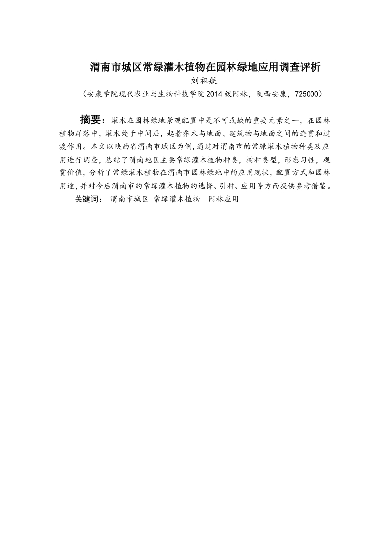 渭南市城区常绿灌木植物在园林绿地应用调查评析刘祖航(安康学院现代农业与生物科技学院2014级园林,陕西安康,725000)摘要:灌木在园林绿地景观配置中是不可或缺的重要元素之一,在园林植物群落中,灌木处于中间层,起着乔木与地面、建筑物与地面之间的连贯和过渡作用。本文以陕西省渭南市城区为例,通过对渭南市的常绿灌木植物种类及应用进行调查,总结了渭南地区主要常绿灌木植物种类,树种类型,形态习性,观赏价值,分析了常绿灌木植物在渭南市园林绿地中的应用现状,配置方式和园林用途,并对今后渭南市的常绿灌木植物的选择、引种、应用等方面提供参考借鉴。关键词:渭南市城区常绿灌木植物园林应用An investigation and analysis on the application of evergreenshrubs in the urban area of weinan city.Liu Zuhang(school of modern agriculture and biotechnology,ankang college,2014,ankang,shaanxi,725000)Abstract:the bushes in the garden green space landscape configuration is one ofindispensable important elements,in the garden plant community,shrubs in themiddle layer,plays a tree with the ground,buildings and ground between coherent andtransition effects.Taking shaanxi weinan city as an example,through to the evergreenshrub species and application of weinan,weinan region are summarized mainevergreen shrub species,tree type,form,ornamental value,analyzes the evergreenshrubs plants in weinan garden green space,the application of the status quo,theconfiguration way and garden use,and the evergreen shrubs of the weinan plantselection,introduction and application to provide a reference.Key words:weinan city,urban area,evergreen shrub plant garden application.目录1、灌木植物以及园林应用的理论基础21.1灌木植物的概念21.2灌木植物的基本分类…21.2.1根据观赏角度将灌木植物分类1.2.2根据大小将灌木植物分类1.2.3根据外形将灌木植物分类1.3灌木植物的生长习性以及在园林绿地应用的意义2、常绿灌木植物在园林中的应用理论基础…2.1常绿灌木植物应用的原则.32.1.1在城区园林绿地中应遵循生态性原则…2.1.2在城区园林绿地中应遵循美观性原则42.13在城区园林绿地中应遵循坚持因地制宜原则2.14在城区园林绿地中应遵循以乡土树种为主的原则.…42.2常绿灌木植物应用的配置方式…52.2.1对植52.2.3丛植53、渭南市城区常绿灌木植物的调查63.1渭南市自然概况.…3.2材料与方法8.83.2.2调查方法和内容4、调查结果与分析…