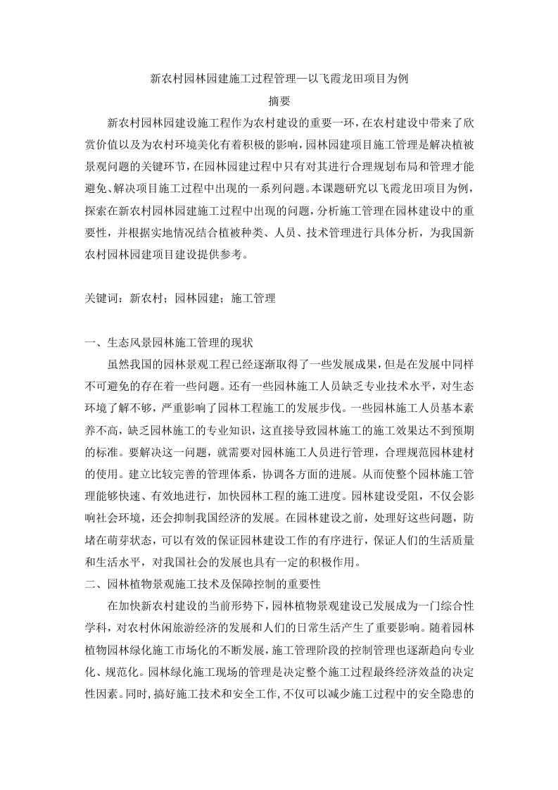 新农村园林园建施工过程管理一以飞霞龙田项目为例摘要新农村园林园建设施工程作为农村建设的重要一环,在农村建设中带来了欣赏价值以及为农村环境美化有着积极的影响,园林园建项目施工管理是解决植被景观问题的关键环节,在园林园建过程中只有对其进行合理规划布局和管理才能避免、解决项目施工过程中出现的一系列问题。本课题研究以飞霞龙田项目为例,探索在新农村园林园建施工过程中出现的问题,分析施工管理在园林建设中的重要性,并根据实地情况结合植被种类、人员、技术管理进行具体分析,为我国新农村园林园建项目建设提供参考。关键词:新农村:园林园建;施工管理一、生态风景园林施工管理的现状虽然我国的园林景观工程已经逐渐取得了一些发展成果,但是在发展中同样不可避免的存在着一些问题。还有一些园林施工人员缺乏专业技术水平,对生态环境了解不够,严重影响了园林工程施工的发展步伐。一些园林施工人员基本素养不高,缺乏园林施工的专业知识,这直接导致园林施工的施工效果达不到预期的标准。要解决这一问题,就需要对园林施工人员进行管理,合理规范园林建材的使用。建立比较完善的管理体系,协调各方面的进展。从而使整个园林施工管理能够快速、有效地进行,加快园林工程的施工进度。园林建设受阻,不仅会影响社会环境,还会抑制我国经济的发展。在园林建设之前,处理好这些问题,防堵在萌芽状态,可以有效的保证园林建设工作的有序进行,保证人们的生活质量和生活水平,对我国社会的发展也具有一定的积极作用。二、园林植物景观施工技术及保障控制的重要性在加快新农村建设的当前形势下,园林植物景观建设已发展成为一门综合性学科,对农村休闲旅游经济的发展和人们的日常生活产生了重要影响。随着园林植物园林绿化施工市场化的不断发展,施工管理阶段的控制管理也逐渐趋向专业化、规范化。园林绿化施工现场的管理是决定整个施工过程最终经济效益的决定性因素。同时,搞好施工技术和安全工作,不仅可以减少施工过程中的安全隐患的园林植物景观绿化,但也会使建筑施工企业建立良好的形象,增强其在园林植物景观市场的竞争力。因此,有必要加强对园林植物园林绿化施工现场的管理和监督,逐步规范园林植物园林绿化施工技术,保证秩序。三、新农村园林施工的过程中存在的问题2.1园林植物景观建设体系有待完善园林植物园林施工已经成为一门综合性学科,涉及到大量的专业技术人员和多学科知识,在实际施工中,需要处理很多问题。在当前美丽乡村建设中,大量各种类型的园林植物景观,成为其美丽乡村建设和发展的重要组成部分,无论哪个环节或过程出现问题,都会直接降低园林植物景观建设的质量和水平,因此,完善园林景观建设体系迫在眉睫。2.2苗木栽植的质量问题在园林园建过程中,苗木的质量问题是园林建设的主要问题,园林建设的主要植被多以花草树木为主,花木在园林建设中是最常运用的苗木,对于花木的质量以及成活率在园林建设错是需要解决的关键问题。在园林苗木的培育过程中要对苗木进行细致的检查,避免出现质量问题,导致后期返工。在选择乔木花卉时,应选择根冠完整的植物,在苗木种植过程中,应注意根冠修复,需要进行合理的扦插,然后再种植,才能有较高的成活率。种苗的栽培位置也需要科学调查,结合种苗的类型,分析其喜好,再调查光照、湿度,合理完成植物的栽培。植物栽培的高效率也提高了园林的整体观赏价值。2.3施工技术有待提升在施工过程中,相关技术人员的施工技术还有待提高。对于储备超前的工艺来说,施工质量决定着整个园林景观的质量。目前我国园林植被施工工艺还存在许多问题。对景观植被的施工工艺还需要进一步改善。在项目施工前,首先需要对地区植被进行实地考察,了解地区的土壤以及水的性质,找到适合地区种植的植被。在新农村园林景观建设过程中应该选取因地制宜的景观植被,一旦出现植被不适宜地区环境会导致种植之后存在幼苗大量死亡的情况,就会增加后期的景观维护成本和管理成本。在园林景观建设中出现大面积相同的植被时,可以对植被的特色进行突出设计。首先,如果在施工前对园林植物园林绿化施工方案的审核不够严格,最合适的园林植物园林绿化施工方案不是选定的施工项目,就会影响后续施工的运行和质量:其次,由于考虑不足,园林植物景观预算与实际成本偏差较大,导致成本超支,不仅影响园林植物景观工程后续成本控制,而且影响施工企业的整体收入。2.4管理工作有待加强园林建设从植被的施工管理工作还有待加强,影响园林植被的重要因素是施工人员的现场管理能力和协调能力还不够强。在我国目前园林景观施工过程中,施工管理还存在着很大的问题,在园林软件施工过程中存在施工人员操作不规范,植被下土时没有将土壤踩平,给植被浇水时没有浇透等等问题时常出现。当一些大型的景观植被被运往建筑现场时,施工人员没有与设备人员进行协调,导致没有人处理幼苗而错过幼苗最佳种植时间,这不仅降低了幼苗的存活率,也存在一定的安全风险。2.5园林施工中的定点放线问题园林园建施工过程中的前期定点放线也是重要的施工内容,在项目施工前应该对植被的布局进行合理划分,只有将点定