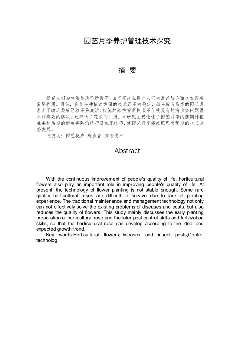 园艺月季养护管理技术探究摘要随着人们的生活品质不断提高,园艺花卉在提升人们生活品质方面也发挥着重要作用。目前,在花卉种植这方面的技术还不够稳定,部分稀有品质的园艺月季由于缺乏栽植经验不易成活。传统的养护管理技术不仅使现有的病虫害问题得不到有效的解决,还降低了花朵的品质。本研究主要论述了园艺月季的前期种植准备和后期的病虫害防治技巧及施肥技巧,使园艺月季能按照理想预期的生长趋势发展。关键词:园艺花卉病虫害防治技术AbstractWith the continuous improvement of people's quality of life,horticulturalflowers also play an important role in improving people's quality of life.Atpresent,the technology of flower planting is not stable enough.Some rarequality horticultural roses are difficult to survive due to lack of plantingexperience.The traditional maintenance and management technology not onlycan not effectively solve the existing problems of diseases and pests,but alsoreduces the quality of flowers.This study mainly discusses the early plantingpreparation of horticultural rose and the later pest control skills and fertilizationskills,so that the horticultural rose can develop according to the ideal andexpected growth trend.Key words:Horticultural flowers;Diseases and insect pests;Controltechnolog目录Abstract.....1前言32园艺月季定义及功能概述32.1园艺月季的定义…32.2园艺月季的功能33我国园艺月季的养护现状及问题3.1养护现状3.2养护问题…4园艺月季的养护策略4.1前期准备…54.2品种挑选74.3常见病虫害及治理措施…84.4园艺月季生长过程中所需营养元素及施肥方式104.5园艺月季冬季清园工作石硫合剂的用法5结语参考文献…1前言月季作为园艺市场上的主要花卉品质,已经深受众多爱慕者的青睐,特别是这几年,月季在园艺界的地位逐步上升,已经占了园艺花卉中的30%总量。对于月季,国内外爱好者数量有添无减,品种也在不断更新。在养护月季这个漫长的过程中,各种各样的问题层出不穷,但我们可用已经掌握的经验,结合科学的方法解决它。本文分享了园艺月季种植前的准备工作、市场上现有的月季品种以及园艺月季病虫害如何预防的多方面知识,为园艺月季的养护工作提供科学的参考方式。2园艺月季定义及功能概述2.1园艺月季的定义花中皇后美誉的它也被称为月月红,是常绿、半常绿低矮灌木,一年四季开花,花朵主要以红色或粉色为主,偶尔有白色和黄色,可以作为观赏植物栽植,也可作为药用植物,所称为月季。2.2园艺月季的功能2.2.1观赏功能月季是一种花期绵长、芬芳色艳的观赏花卉,在园林绿化中有着不可或缺的价值,可用于园林布置花坛、花境、庭院花材,可制作月季盆景,作切花、花篮、花束等。2.2.2美化功能月季花在园林街景、美化环境中具有独特的作用。可以做成延绵不断的花篱、花屏、花墙等,用于机关、学校、居民小区、城区广场等地方,不仅能净化