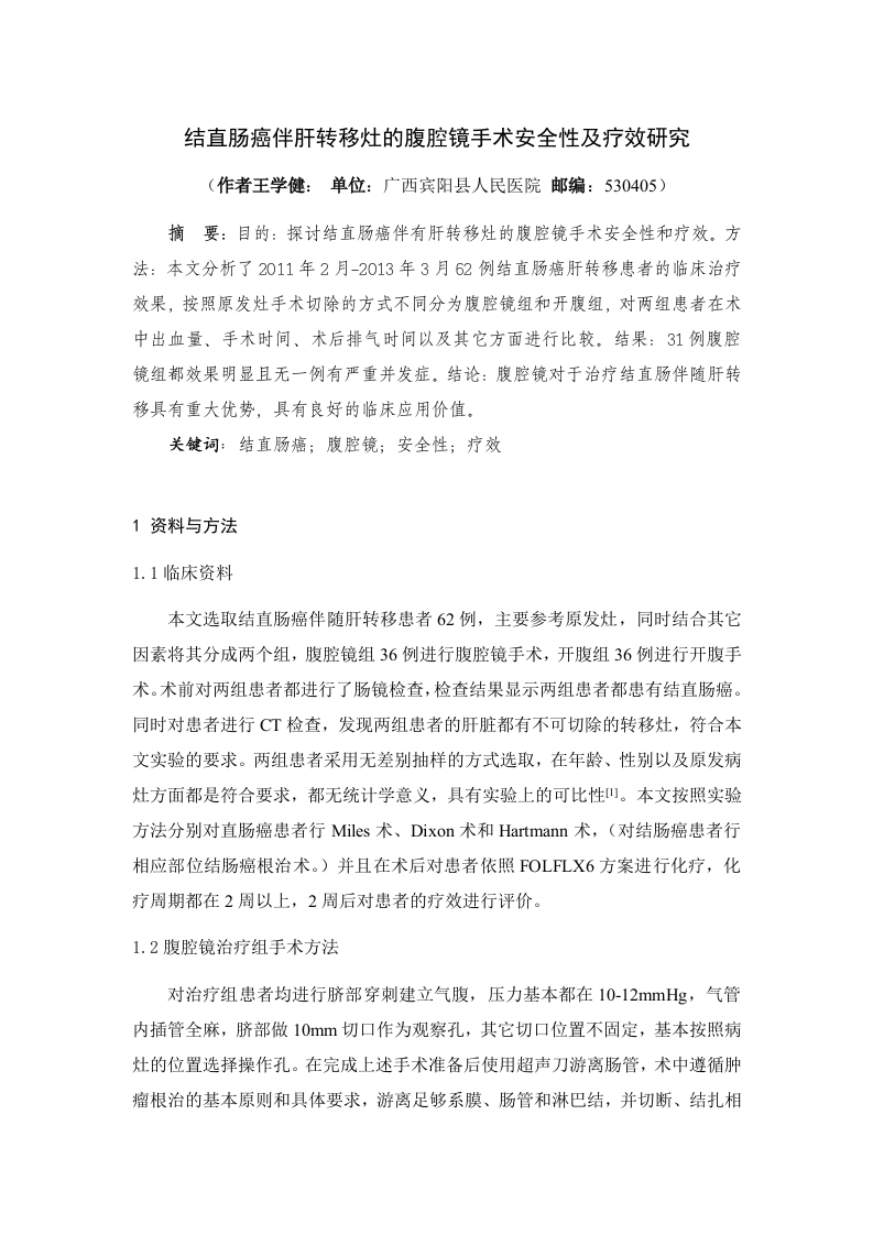 结直肠癌伴肝转移灶的腹腔镜手术安全性及疗效研究(作者王学健:单位:广西宾阳县人民医院邮编:530405)摘要:目的:探讨结直肠癌伴有肝转移灶的腹腔镜手术安全性和疗效。方法:本文分析了2011年2月-2013年3月62例结直肠癌肝转移患者的临床治疗效果,按照原发灶手术切除的方式不同分为腹腔镜组和开腹组,对两组患者在术中出血量、手术时间、术后排气时间以及其它方面进行比较。结果:31例腹腔镜组都效果明显且无一例有严重并发症。结论:腹腔镜对于治疗结直肠伴随肝转移具有重大优势,具有良好的临床应用价值。关健词:结直肠癌;腹腔镜;安全性;疗效1资料与方法1.1临床资料本文选取结直肠癌伴随肝转移患者62例,主要参考原发灶,同时结合其它因素将其分成两个组,腹腔镜组36例进行腹腔镜手术,开腹组36例进行开腹手术。术前对两组患者都进行了肠镜检查,检查结果显示两组患者都患有结直肠癌。同时对患者进行CT检查,发现两组患者的肝脏都有不可切除的转移灶,符合本文实验的要求。两组患者采用无差别抽样的方式选取,在年龄、性别以及原发病灶方面都是符合要求,都无统计学意义,具有实验上的可比性山。本文按照实验方法分别对直肠癌患者行Miles术、Dixon术和Hartmann术,(对结肠癌患者行相应部位结肠癌根治术。)并且在术后对患者依照FOLFLX6方案进行化疗,化疗周期都在2周以上,2周后对患者的疗效进行评价。1.2腹腔镜治疗组手术方法对治疗组患者均进行脐部穿刺建立气腹,压力基本都在10-12mmHg,气管内插管全麻,脐部做10m切口作为观察孔,其它切口位置不固定,基本按照病灶的位置选择操作孔。在完成上述手术准备后使用超声刀游离肠管,术中遵循肿瘤根治的基本原则和具体要求,游离足够系膜、肠管和淋巴结,并切断、结扎相应的血管,同时,根据肿瘤的位置可延长附近切口至5-8cm,应用吻合器、闭合器完成肠吻合。其中(对结肠癌患者行相应部位结肠癌根治术。)直肠手术中完全按照全肠系膜切除(total mesorectal excision,TME)原则,根据患者的身体状况和肿瘤的位置决定行Dixon手术或Miles手术;当患者发生肝转移时,低蛋白血症发生的可能性较大,此时患者的肝脏功能存在异常,当患者身体不允许进行Mils术时,为了防止手术后发生一些高风险事件,此时应该对患者行Hartmann术,同时,在术后要冲洗患者腹腔,同时放置引流管]。1.3观察标准手术出血量、手术时间、术后排气时间、术后接受首次化疗时间、术后住院时间。2结果62例均成功完成结直肠癌姑息性切除,腹腔镜组患者都得到了较好的治疗,无一例病情恶化或者围手术期死亡。我们对治疗结果进行统计,腹腔镜组手术出血(P<0.01)减少明显,术后住院时间(P<0.05)减少明显,术后排气时间(P<0.05)缩短明显。患者手术后都进行了FOLFLX6方案化疗,基本都在两个周期以上,两个周期之后,患者治疗效果的差异不具有统计学意义(P>0.05),见表1。表1两组患者手术结果的比较x±s组别例数手术时间出血量(Vml)术后排气时间术后住院时间术后首次化疗时间(n)(t/min (Vml)(t/h)(t/d)(d)腹腔镜组36176.11±19.4483.88±20.0485.83±5.8613.94±2.7120.50±3.72开腹组26188.46±18.1859.23±10.3880.31±5.3311.69±3.0122.61±4.993讨论治疗结直肠癌肝转移患者必须考虑多种因素,其最佳策略的选择比较复杂,包括原发灶、患者的身体状况、患者症状和肝转移灶的位置、肝肿瘤浸润范围、潜在合并症等都是必须考虑因素阿。目前的医学界主要采用切除原发灶与肝转移灶来治疗结直肠癌,当结直肠癌伴有不可切除的肝转移时,需要采取个体化治疗和以手术为中心的综合治疗。进入新世纪以来,随着医学理论和实践的发展以及医学设备的更新,腹腔镜技术已经在外科手术中被广泛运用,同时腹腔镜手术的优势也逐渐发挥出来,本文主要就腹腔镜手术作为结直肠癌肝转移的外科治疗手段的安全性和疗效进行探讨。腹腔镜手术对结直肠癌肝转移患者原发灶切除的优势明显。腹腔镜手术具有疼痛轻、康复快、住院时间短、创面感染少、术后早期活动优越等特征,与开腹手术相比优势具有明显的优势。本文的研究结果显示腹腔镜切除原发灶治疗结直肠癌肝转移时,具手术中出血量少、术后住院时间短、术后排气时间短等重要优势,比开腹手术效果更好,患者的疼痛感也大为减少。两种方式在手术时间方面无统计学意义,其中一些因素还与术者腹腔镜技术和经验有关山。另外,根据实验结果,腹腔镜技术临床价值良好,可取得与开腹手术相同的治疗效果,在一些方面甚至比开腹手术效果更好2。腹腔镜切除直肠癌肝转移患者原发灶的长期疗效。经过大量的临床与基础研究证实,腹腔镜治疗结直肠癌疗效显著)]。通过上述论述我们可以发现发现腹腔镜在治疗结直肠癌肝转移方面和开腹手术有相同效果,且长期疗效更为显著,是治疗结直肠癌肝转移的首选方法。参考文献[1]谈高,柳学国,李占军,张晋听,王颖,熊大蒂,张翠运,关小东,何艳丽.结肠癌肝转移的螺旋CT特征及临床价值[U.中国医学影像技术.2003(09)[②]张海增,董淑晓,周志祥,邵永孚,赵平,结肠癌肝转移术后复发的再次肝切除4例分析[叮.中国实用外科杂志.2011(06)[3]刘凯,李哲,段纪成,黄耀,杨家和,沈锋,吴孟超.结肠癌伴肝转移同期切除影响预后相关因素分析[U.中国实用外科杂志.2009(08)[4]Armin Thelen,Sven Jonas,Christoph Benckert,AntoninoSpinelli,EnricoLopez-Hanninen,Birgi