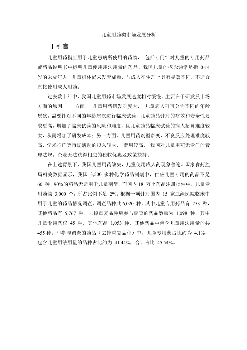儿童用药类市场发展分析1引言儿童用药指应用于儿童患病所使用的药物,包括专门针对儿童的专用药品或药品说明书中标明儿童使用用法用量的药品。我国儿童的概念通常是指0-14岁的未成年人。儿童机体尚未发育成熟,与成人在生理上具有显著不同,不适合直接使用成人用药。过去数十年中,我国儿童用药市场发展速度相对缓慢。主要在于研发及市场方面的原因。一方面,儿童用药研发难度大,儿童病人群可分为不同的年龄层次,需要针对不同的年龄层次进行临床试验,儿童药品针对的疗效和安全性要求更高,增加了临床试验的风险和难度,且儿童药品临床试验的病人招募难度较大,从而增加了研发成本:另一方面,儿童用药剂型多变、不良反应处理难度较高,学术推广等市场活动的投入较大,费用较高,我国对儿童用药无专门的管理法规,企业无法获得相应的税收优惠及政策扶持。在上述背景下,我国儿童用药缺失,儿童使用成人药现象普遍。国家食药监局相关数据显示,我国3,500多种化学药品制剂中,供应儿童专用的药品不足60种,90%的药品无适用于儿童剂型。而国内18万个药品注册批件中,儿童专用药物3,000个,所占比例不足2%。根据一项针对国内15家三级医院临床中用于儿童的药品情况调查,调查品种共6,020种,其中儿童专用药品有253种,其他药品有5,767种。去掉重复品种后参与调查的药品数量为1,098种,其中儿童专用药仅45种,其他药品1,053种,其他药品中包含儿童用法用量的共455种。即参与调查的药品(去掉重复品种)中,儿童专用药占比约为4.1%,包含儿童用法用量的品种占比约为41.44%,合计占比45.54%。140012131200110810111000921837800750676670607596005514975345448443940034200hco20052006200720082009201020112012201320142015■仅药品说明书标明儿童用药■包括医生处方时药品减半部分从市场规模上看,国内儿童用药市场规模将超过千亿元。随着我国二胎政策的全面落地,儿童人口基数将进一步扩大,且环境污染等社会问题造成儿童发病率上升,国家日益重视儿童用药问题,连续出台了多项政策,支持儿童药物的研发创新,加快儿童用药注册申请的审批速度,加强儿童用药的政策扶持,优先将儿童用药纳入医保。在政策扶持力度增强和医疗投入加大的背景下,我国儿童用药将迎来新的市场机遇。根据南方医药经济研究所的预测,未来我国儿童药销售规模继续保持年均两位数以上的增长速度。140012131200110810111000921837800750676607551596004544975344483940034302220020052006200720082009201020112012201320142015■仅药品说明书标明儿壁用药■包括医生处方时药品减半部分2儿童用药类市场发展分析2019年儿童用药行业市场规模是通过大量的一手调研和覆盖主要行业的数据监测(包括目标产品或行业在指定时间内的产量、产值等,具体根据人口数量、人们的需求、年龄分布、地区的贫富度调查)的基础数据信息,并通过自主研发的多个市场规模和发展前景估算模型,为客户提供可靠地市场和细分市场规模数据以及趋势判断,协助客户判断目标市场规模及发展前景,为市场开发和市场份额估算提供可靠、持续的数据支持。市场规模不仅仅只是儿童用药产品在某个范围内的市场销售额,也涵盖了是用户量规模或者销售量规模。我们根据儿童用药所集中的区域、发展的阶段、用户数量进行现有市场的估算:其次,再根据儿童用药潜在用户及发展趋势对未来市场进行估算。最终,可获知儿童用药产品市场的总体规模。2.1人口政策推动新生儿数量增长加快全面二胎政策实施,新生儿数量增长符合预期我国的人口政策大致经历了以下几个阶段:1)独生子女政策(1980s-2013):计划生育被确定为基本国策;2)单独二胎(2013-2015):一方是独生子女的夫妇可生育两个孩子:3)全面二胎(2016起):全面实施一对夫妇可生育两个孩子政策。有专家预测,中国或将在2020年后实现完全放开生育政策,甚至鼓励生育。(1)单独二胎:新生儿数量增长不及预期在单独二胎实施前(2007-2012年),我国每年新生婴儿约1600万,出生率约12.05%。单独二胎政策出台后,2014年我国出生人口1687万人,出生率达到12.37%,创近十年新高。尽管如此,按照之前的预计,单独二胎启动后每年新增人口应该在200万左右,但2014年仅同比新增47万新生儿:截止2015年5月底,全国1100多万单独夫妇中有145万申请再生育,生育意愿仅占比10%-15%,由此说明,“单独二胎政策仅带来一波人口小高峰。(2)全面二胎:持续推动新生儿数量增长自2016年1月1日“全面二孩政策的落实,我国已育有一个、还在生育年龄的目标育龄妇女约1亿,远高于单独二胎的目标人口基数。根据艾瑞咨询的调查,有生育意愿的比例高达34.2%,预计未来每年新生儿数约为1780-1950