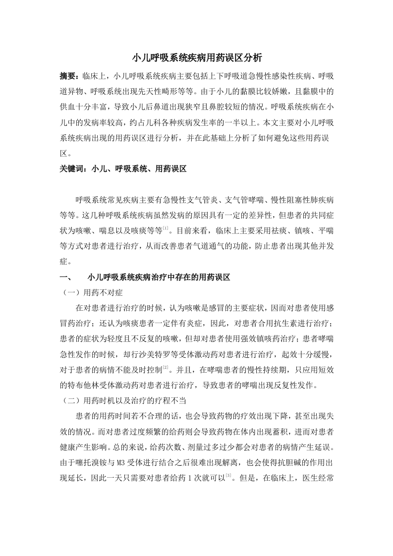 小儿呼吸系统疾病用药误区分析摘要:临床上,小儿呼吸系统疾病主要包括上下呼吸道急慢性感染性疾病、呼吸道异物、呼吸系统出现先天性畸形等等。由于小儿的黏膜比较娇嫩,且黏膜中的供血十分丰富,导致小儿后鼻道出现狭窄且鼻腔较短的情况。呼吸系统疾病在小儿中的发病率较高,约占儿科各种疾病发生率的一半以上。本文主要对小儿呼吸系统疾病出现的用药误区进行分析,并在此基础上分析了如何避免这些用药误区。关键词:小儿、呼吸系统、用药误区呼吸系统常见疾病主要有急慢性支气管炎、支气管哮喘、慢性阻塞性肺疾病等等。这几种呼吸系统疾病虽然发病的原因具有一定的差异性,但患者的共同症状为咳嗽、喘息以及咳痰等等。目前来看,临床上主要采用祛痰、镇咳、平喘等方式对患者进行治疗,从而改善患者气道通气的功能,防止患者出现其他并发症。一、小儿呼吸系统疾病治疗中存在的用药误区(一)用药不对症在对患者进行治疗的时候,认为咳嗽是感冒的主要症状,因而对患者使用感冒药治疗:还认为咳痰患者一定伴有炎症,因此,对患者合用抗生素进行治疗:患者的症状为轻度且不反复的咳嗽,但却对患者使用强效镇咳药治疗:患者哮喘急性发作的时候,却行沙美特罗等受体激动药对患者进行治疗,起效十分缓慢,对于患者的病情不能及时控制②。并且,在哮喘患者的慢性持续期,只应用短效的特布他林受体激动药对患者进行治疗,导致患者的哮喘出现反复性发作。(二)用药时机以及治疗的疗程不当患者的用药时间若不合理的话,也会导致药物的疗效出现下降,甚至出现失效的情况。而对患者过度频繁的给药则会导致药物在体内出现蓄积,进而对患者健康产生影响。总的来说,给药次数、剂量过多过少都会对患者的病情产生延误。由于噻托溴铵与M3受体进行结合之后很难出现解离,也会使得抗胆碱的作用出现延长,因此一天只需要对患者给药1次就可以国。但是,在临床上,医生经常对患者给药2次或者更多,产生不良影响。沙丁胺醇以及异丙托溴铵等短效药、速效药,每天只需要给药3至4次,但在临床上医生却经常只给药1至2次。(三)对特殊人群的安全用药问题重视不够驾驶员或一些高空作业者在服用感冒药之后很容易出现嗜睡症状,进而对患者安全造成影响。哮喘患者大多是老年人,临床上常伴有心脑血管疾病,多种药物联合使用的时候应该对老年人的机体器官功能进行充分考虑,避免出现器官功能衰竭的情况。对于妊娠期的哮喘患者来说,很多医生在进行治疗的时候,没有考虑到既需要对患者的病情进行有效控制,又需要对胎儿不产生影响。(四)患者用药的依从性不高患者在治疗期间,依从度不高,主要表现为哮喘等呼吸道症状得到减轻,就不按照医嘱进行服药,擅自停药或者无规律、不按照疗程进行用药。如嗜酸性粒细胞性支气管炎需要使用糖皮质素治疗1周,但若患者的临床症状得到改善就马上停药,很容易导致患者的病情出现反复。(五)不良反应重视不够部分含有阿片成分的镇咳药,若患者长期进行服用,就很容易导致对药物产生一定的依赖性或对药物成瘾。糖皮质激素类药物在用药剂量以及用药方法上需要掌握恰当,若不对其进行有效掌握,就很容易导致小儿的发育受到影响。二、小儿呼吸系统疾病合理用药策略(一)药物种类选择患者的症状若为轻度咳嗽,则一般不需要使用镇咳药物对患者进行治疗。剧烈咳嗽或频繁咳嗽,不仅会对患者的生活质量产生影响,也会导致患者的病情加重,进而导致患者发生其他的并发症,这时,就应该适当对患者使用一些镇咳药物。一般会选择苯丙哌林对患者进行治疗,该种药物起效较为迅速,且镇咳效果比较可待因来说要强很多。其次,选择右美沙芬,该种药物的镇咳强度与可待因镇咳效果相当。若患者的咳嗽症状不太明显,就应该使用喷托维林,镇咳作用较可待因较弱。痰多且出现咳嗽的患者,应该使用祛痰药如氯化铵、溴己新以及乙酰半胱氨酸等药物进行联合使用,利于患者排痰,并对患者的咳嗽症状进行有效控制,保证患者的睡眠同。若患者哮喘为轻度,则应该使用B2受体激动药联合氨茶碱进行使用,如利用沙丁胺醇气雾吸入联合特布他林片、氨茶碱缓释片进行口服。(二)药物的相互作用很多药物联合使用就会导致出现一系列不良的后果。首先,祛痰药的联合使用。氯化铵联合阿司匹林使用,导致患者的排泄功能出现减慢,并对疗效进行增加。而氯化铵则不应该和排钾利尿药物进行联合使用,很容易导致出现一些其他的并发症。溴己新与阿莫西林抗生素进行联合使用,还会对阿莫西林的抗菌效果进行增强。其次,镇咳药的联合使用。镇咳药与乙酰氨基酚、阿司匹林等药物进行合用,会对阿司匹林等药物的镇痛作用进行增强。但将镇咳药与阿托品等抗胆碱药物进行联合使用,就会导致患者出现便秘或其他症状。与地西泮等中枢抑制药物进行联合使用,就会导致患者中枢性呼吸抑制作用得到加重。最后,平喘药物的联合使用。沙丁氨醇、沙美特罗、茶碱或多索茶碱等支气管扩张药物的使用与洋地黄类药物进行联合使用,可导致患者心动过速的危险性增加。而与单胺氧化酶抑制药、抗组胺药、三环抗抑郁药等合用,就会导致患者的不良反应增加。平喘药如倍氯米松、氟替卡松以及孟鲁司特等与克拉霉素、红霉素等
