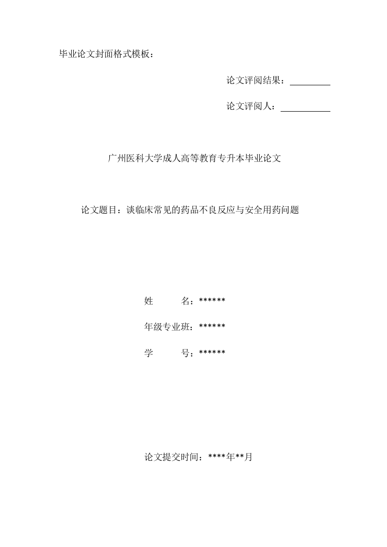 毕业论文封面格式模板:论文评阅结果:论文评阅人:广州医科大学成人高等教育专升本毕业论文论文题目:谈临床常见的药品不良反应与安全用药问题姓年级专业班:***学论文提交时间:***年**月目录1第一章资料与方法..2.................3.1引起药品不良反应的原因..453.3提高安全合理用药的途径...63.4如何做到安全合理用药..9【摘要】目的分析广州医科大学第一附属医院药品不良反应与安全用药。方法选取2014年10月-2016年1月广州医科大学第一附属医院发生药品不良反应患者100例,统计分析发生不良反应患者的年龄段、引发的系统损害或者是组织损害、引发不良反应药品。结果各个年龄段患者均发生药品不良反应,差异无统计学意义(P>0.05)。在使用药品时,使用抗生素引起的不良反应最多,与其他药物比较,差异有统计学意义(P<0.05)。累及器官最多的为皮肤与附件损害,其次为消化系统、全身损害等。结论通过药学监护理念监护临床使用药品,减少不良反应,避免给患者带来伤害,提高药品使用的安全性。【关键词】药物毒性;抗菌药:安全用药