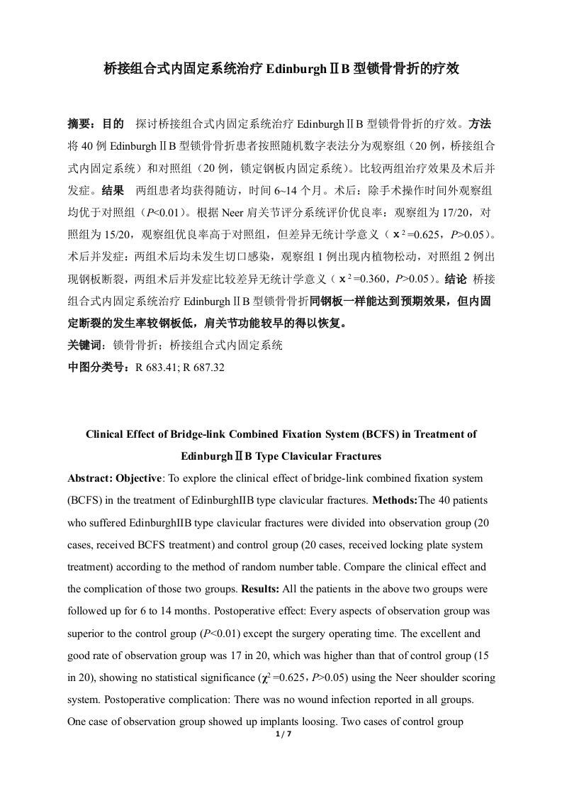 桥接组合式内固定系统治疗EdinburghⅡB型锁骨骨折的疗效摘要:目的探讨桥接组合式内固定系统治疗Edinburgh IⅡB型锁骨骨折的疗效。方法将40例Edinburgh IⅡB型锁骨骨折患者按照随机数字表法分为观察组(20例,桥接组合式内固定系统)和对照组(20例,锁定钢板内固定系统)。比较两组治疗效果及术后并发症。结果两组患者均获得随访,时间614个月。术后:除手术操作时间外观察组均优于对照组(P≈0.01)。根据Neer肩关节评分系统评价优良率:观察组为17/20,对照组为1520,观察组优良率高于对照组,但差异无统计学意义(x20.625,P>0.05)。术后并发症:两组术后均未发生切口感染,观察组1例出现内植物松动,对照组2例出现钢板断裂,两组术后并发症比较差异无统计学意义(x20.360,P>0.05)。结论桥接组合式内固定系统治疗Edinburgh IⅡB型锁骨骨折同钢板一样能达到预期效果,但内固定断裂的发生率较钢板低,肩关节功能较早的得以恢复。关键词:锁骨骨折:桥接组合式内固定系统中图分类号:R683.41;R687.32Clinical Effect of Bridge-link Combined Fixation System (BCFS)in Treatment ofEdinburgh II B Type Clavicular FracturesAbstract:Objective:To explore the clinical effect of bridge-link combined fixation system(BCFS)in the treatment of EdinburghIIB type clavicular fractures.Methods:The 40 patientscases,received BCFS treatment)and control group (20 cases,received locking plate systemtreatment)according to the method of random number table.Compare the clinical effect andthe complication of those two groups.Results:All the patients in the above two groups werefollowed up for 6 to 14 months.Postoperative effect:Every aspects of observation group wassuperior to the control group (P<0.01)except the surgery operating time.The excellent andgood rate of observation group was 17 in 20,which was higher than that of control group(15in 20),showing no statistical significance (x2=0.625,P>0.05)using the Neer shoulder scoringsystem.Postoperative complication:There was no wound infection reported in all groups.One case of observation group showed up implants loosing.Two cases of control group1/7reported plate fracture.There was no statistical significance in postoperative complicationsbetween two groups (x2=0.360,P>0.05).Conclusion:Bridge-link Combined FixationSystem (BCFS)could achieve the same anticipate effect as the locking plate system in thetreatment of EdinburghIIB type clavicular fractures.But the inner fixing fracture incidencerate reduced in the patients received BCFS whose function of should joint recovery earlier.Key words:clavicular fracture;bridge-link combined fixation systemEdinburghⅡB型锁骨骨折临床上最为多见,治疗方式多种多样,精准恢复锁骨正常的解剖形态以及减少并发症是治疗的目的。传统治疗常采取保守治疗,可导致锁骨畸形愈合及继发性肩关节僵硬等并发症的发生,严重者影响远期的生活质量,而锁定钢板治疗有一定的断板发生率。桥接组合式内固定系统具有创伤小、操作简单、治疗确切等优点。本研究对2016年11月2018年3月合肥市第一人民医院创伤骨科收治的40例锁骨骨折患者资料进行回顾性分析,比较两种内固定方式的疗效及并发症发生率,探讨桥接组合式内固定系统治疗Edinburgh IⅡB型锁骨骨折的临床效果,报道如下。1材料与方法1.1病例资料纳入标准:X线检查符合Edinburgh IⅡB型锁骨闭合骨折,骨折线位移锁骨中13部,伴或不伴游离骨折块。排除标准:开放骨折,合并其他部位骨折,病理骨折,心脑血管方面疾病、糖尿病、免疫系统疾病、长期吸烟史等。本组40例,采用随机数字表法分为观察组(桥接组合式内固定系统)和对照组(锁定钢板内固定系统)。①观察组:20例,男13例,女7例,年龄18~66(38.9±13.7)岁:EdinburghIⅡB1型12例,EdinburghⅡIB2型8例。②对照组:20例,男15例,女5例,年龄18-~62(34.1士13.4)岁;EdinburghⅡB1型11例,Edinburgh IⅡB2型9例。两组术前资料比较差异无统计学意义(P>0.05)。入院后对患者的发病原因、受伤机制、合并基础疾病等全面评估,均完成肩关节的正位X线检查,必要时进行CT平扫及三维重建,进一步了解骨折粉碎程度、骨折移位情况及是否合并游离骨折块。患者术前均采取8字绷带或肩肘吊带固定制动,必要时局部予以冰敷处理,待软组织肿胀消退后进行手术。伤后至手术时间平均3~5d。2/71.2手术方法臂丛麻醉。患者沙滩卧位,患侧肩部垫软枕抬高。常规消毒、铺巾。两组患者均采取锁骨部横切口,以骨折断端为中心逐层切开,暴露骨折断端,清除断端间血肿及嵌插软组织,注意包括骨膜特别是游离骨折块附着部骨膜。直视下复位,使用1.0mm-1.5mm克氏针多针临时固定,从前向后垂直骨折线打入1-2枚普通拉力螺钉。观察组选用桥接组合式内固定系统(天津威曼),首先使用模棒根据复位后的锁骨形态进行取样、塑型,选取合适固定块,远近端依次使用3-4枚螺钉固定,在骨折远端螺钉锁定前可使用特殊加压器械对骨折断端进行加压。对照组使用锁定钢板内固定系统,根据骨折线长度及跨度选取合适的钢板,远近端一般使用34枚螺钉骨折。术中C臂机证实锁骨的长度、移位成角均复位后关闭切口。1.3术后处理术后辅助8字绷带或肩肘吊带继续固定2-3周。术前0.5h及术后24h内规范应用抗生素预防感染并予以消肿等对症治疗。术后2448h即指导患者行肩关节功能锻炼,拆线后指导患者行肩关节钟摆运动及肩关节上举活动(爬墙),12~14周后根据复查结果指导患者完全负重。术后即刻及门诊复查时摄肩关节X线片。采用Neer肩关节评分系统评价疗效,90-100分为优,80-89分为良,70-7