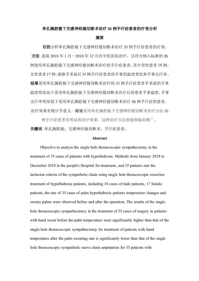 单孔胸腔镜下交感神经链切断术治疗35例手汗症患者的疗效分析摘要目的分析单孔胸腔镜下交感神经链切断术治疗35例手汗症患者的疗效。方法选取2018年1月一2018年12月在中医医院治疗,且符合纳入标准的35例使用单孔胸腔镜下交感神经链切断术治疗的手汗症患者,其中男性患者18例,女性患者17例,观察手术前后35例手汗症患者的手掌的温度变化和手掌出汗率。结果采用单孔胸腔镜下交感神经链切断术治疗的35例手汗症患者手术前的手掌温度明显高于采用单孔胸腔镜下交感神经链切断术治疗后的患者手掌温度,手掌出汗率明显低于采用单孔胸腔镜下交感神经链切断术治疗35例手汗症的患者,治疗效果有统计学意义。结论采用单孔胸腔镜下交感神经链切断术治疗方法35例手汗症患者有明显的治疗效果,这种治疗方法很值得临床推广。关键词单孔胸腔镜:交感神经链切断术;手汗症患者:AbstractObjective to analyze the single hole thoracoscopic sympathectomy in thetreatment of 35 cases of patients with hyperhidrosis.Methods from January 2018 toDecember 2018 in the people's Hospital for treatment,and 35 patients met theinclusion criteria of the sympathetic chain using single hole thoracoscopic resectiontreatment of hyperhidrosis patients,including 18 cases of male patients,17 femalepatients,the rate of 35 cases of palm hyperhidrosis patients temperature changes andsweaty palms were observed before and after the operation.The results of the singlehole thoracoscopic sympathectomy in the treatment of 35 cases of surgery in patientswith hand sweat before the palm temperature were significantly higher than that of thesingle hole thoracoscopic sympathectomy for treatment of patients with handtemperature after the palm sweating rate is significantly lower than that of the singlehole thoracoscopic sympathetic nerve chain amputation for 35 patients withhyperhidrosis patients had significant treatment effect.Conclusion the single holethoracoscopic sympathectomy for the treatment method has obvious therapeutic effecton 35 cases of palmar hyperhidrosis patients,this treatment method is very effectiveand feasible than the traditional method of treatment with smaller incision.which isworthy of clinical promotion.Keywords single port thoracoscopy;sympathectomy;patients with hyperhidrosis;引言我国手汗症疾病是青少年常见的一种疾病,且近年患病年龄段有下降的的趋势,但大部份病人仍以青少年居多。随着人们对手汗症患者的发病规律、病理、生物学特性、转移规律的了解,采用单孔胸腔镜下交感神经链切断术治疗手汗症患者的病例越来越多。在采用单孔胸腔镜下交感神经链切断术治疗手汗症患者的治疗疗效有重要的研究意义。2018年1月~2018年12月,我院对35例手汗症患者采用单孔胸腔镜下交感神经链切断术治疗,取得较好疗效,现将治疗体会报导1资料与方法1.1一般资料选取2018年1月~2018年12月在中医医院治疗,且符合纳入标准的35例使用单孔胸腔镜下交感神经链切断术治疗的手汗症患者,其中男性患者18例,女性患者17例,观察手术前后35例手汗症患者的手掌的温度变化和手掌出汗率。1.2治疗方法本次研究对35例手汗症患者均采用单孔胸腔镜下交感神经链切断术治疗方法,首先在患者在进入手术室之后,医护人员需要在患者的双腔气管内插入管,插管时需要注意的是,在插管之前需要对患者的全身先进行麻醉。其次,在医护人员做好准备工作之后,在手术进行之前和之后,也就是整个手术过程中密切关注患者的各项生命体征的变化,例如血压,心率等,同时也需及时测量患者两个手掌的温度,且随时记录患者两手掌的温度变化。最后,需要注意的是在对患者麻醉完成之后,医护人员督促和指导患者持半卧的姿势,且身体稍微抬高30度,患者的胳膊向外展并且固定住,使患者的两腋下暴露出来,并且在患者的腋下手术区域做好标记,同时对患者的腋下皮肤做好消毒手术,其手术顺序是先做患者的右侧腋下,再做患者的左侧腋下,手术中需要注意的是,手术中在患者的标记部位切一个一零米的的接口,并且主治医师嘱咐医护人员,在患者胸肺塌陷之后,在切口处插入1.0厘米,再放入到胸腔下观察,手术后6一24小时之内,要不断的复查患者的胸部x线片,观察手术疗效4。1.3统计学处理该活动中的任何数据均采取SPSS22.0软件进行整理分析,计数资料处理:F检验,技术资料处理:p检验。若p<0.05表示差别有统计学意义。1.4纳入标准(1)年龄45岁以下的患有不同程度的手汗症患者:(2)已经在医院确诊为手汗症患者一期和二期手汗症患者:(3)手汗症患者的文化程度为初中以上文化程度:(4)手汗症患者没有吸毒或其他的药物依赖以及酒精依赖等历史。(5)患有手汗症患者的手汗症患者能够有清醒的意识,并且能正确的表达自己的意愿:(6)经过手汗症患者的知情同意后,尊重手汗症患者患者家属的意愿,自愿参与活动研究,做到让每位参与者都有知情权。(7)手汗症患者必须拥有智能手机,并且会使用微信等社交软件。1.5观测指标(1)一般资料:详细记录病人的一般情况(性别、年龄、病程等)。(2)患者手掌温度。(3)患者手掌出汗率。1.6疗效评定标准根据参照2012年《中医病证诊断疗效标准》,结合单孔胸腔镜下交感神经链