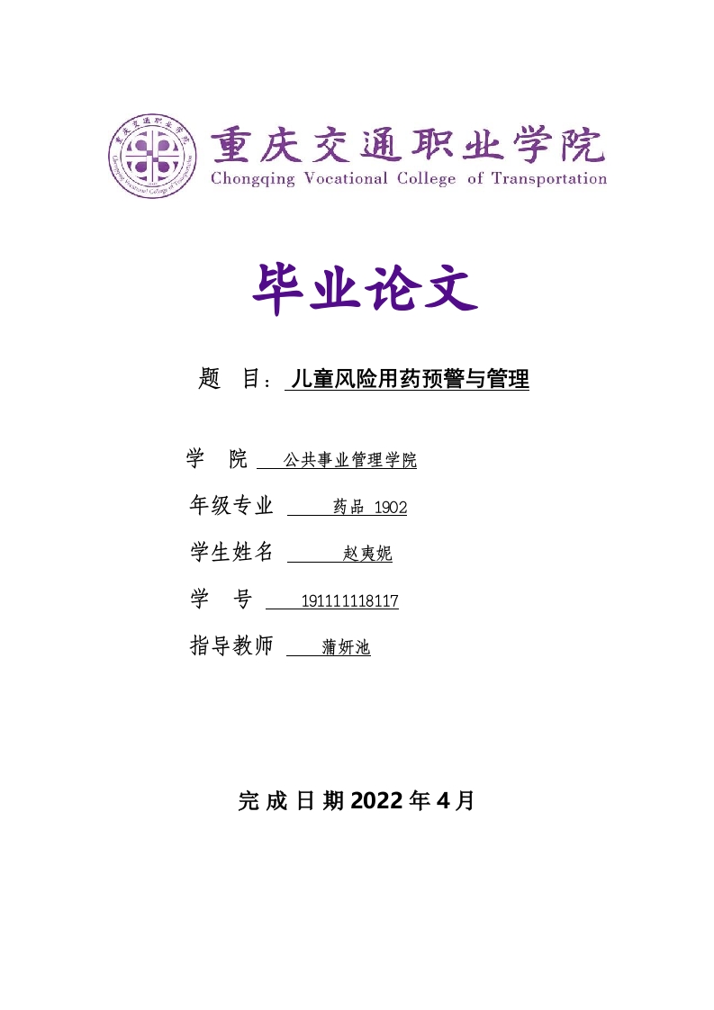 重庆交通职业学院Chongqing Vocational College of Transportation毕业论文题目:儿童风险用药预警与管理学院公共事业管理学院年级专业药品1902学生姓名赵夷妮学号191111118117指导教师蒲妍池完成日期2022年4月重庆交通职业学院毕业论文诚信声明重庆交通职业学院毕业论文诚信声明本人郑重声明:所呈交的毕业论文,题目《儿童风险用药预警与管理》是本人在指导教师的指导下,进行研究工作所取得的成果。对本文的研究作出重要贡献的个人和集体,均已在文中以明确方式注明。除此之外,本论文不包含任何其他个人或集体已经发表或撰写过的作品成果。本人完全意识到本声明应承担的法律责任。作者签名:赵夷妮日期:2022年3月20日重庆交通职业学院毕业论文任务书重庆交通职业学院毕业论文任务书一、毕业论文的题目和简介1.题目:儿童风险用药预警与管理2.题目简介:儿童的用药安全一直以来是国家卫生事业发展关注的重点,儿童的生命健康一定程度上反映了未来国家的发展潜力。第七次全国人口普查数据中表明,我国0-14岁儿童人数约占国家总人口的17.95%。药物治疗是治愈儿童疾病的主要方法,也是最有效的治疗方法,是保障儿童健康的主要手段。我国人口基数大,儿童的数量也远超他国,因此对儿童药品需求量大,儿童药品的是否安全、有效和持续可及直接关系到我国儿童整体健康状况。二、毕业论文应完成的主要内容1.内容要求综述:儿童处在生长发育期,其生理特点不同于成人,不能将其看作缩小版的成人,且在同一疾病的同一药物治疗中可能具有独特的反应性和敏感性。同时由于伦理学和相关法规的原因,在一般药品进行临床试验时通常不纳入儿童,作为临床试验对象。因此类药品在儿童用药方面的临床研究资料相对较少,但当药品上市后这些药品有可能用于儿科用药,增加了儿童用药的安全性风险,因此迫切的需要合适的制度体系来保障我国儿童用药的安全。2.分项内容要求:(不低于200字)从儿童的特殊性出发,提出完善我国儿童这一特殊用药群体的药物警戒提供参考。主要从儿童用药的特殊性、儿童用药不良反应