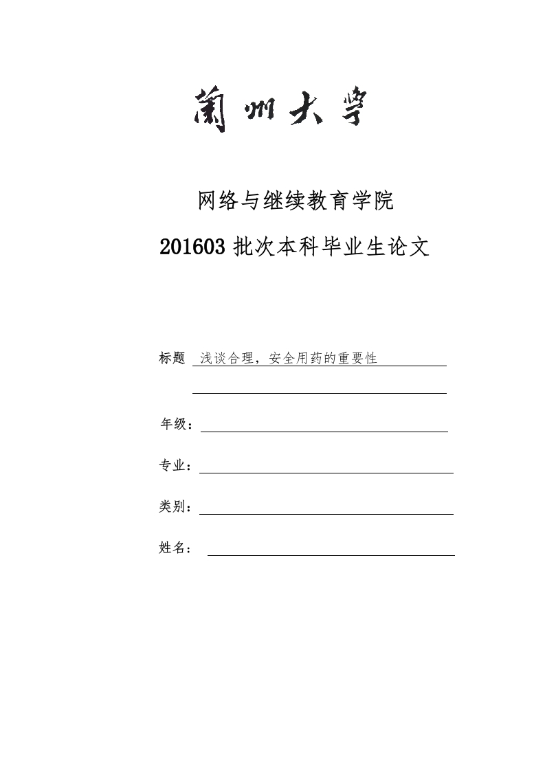 网络与继续教育学院201603批次本科毕业生论文标题浅谈合理,安全用药的重要性年级:专业:类别:姓名:诚信责任书本人郑重声明:本人所呈交的毕业论文(设计),是在导师的指导下独立进行研究所取得的成果。毕业论文(设计)中凡引用他人已经发表或未发表的成果、数据、观点等,均已明确注明出处。除文中已经注明引用的内容外,不包含任何其他个人或集体已经发表或在网上发表的论文。本人郑重承诺:因个人原因,未按照毕业论文工作的时限规定完成,本人自愿承担因此影响正常毕业的后果。特此声明。论文作者签名:(本人手签)日期:年月浅谈合理,安全用药的重要性姓名文章摘要:近年来,我国医疗事业的发展越来越迅速,但是同样的,不合理不安全用药现象也是随之增多。这些现象的存在,对医疗的质量与安全产生了严重的影响,甚至对医疗行业的可持续发展和其整体形象都产生了不良的影响。所以,积极推动合理安全用药,是医疗机构保障医疗安全、提高临床药物治疗水准、保证医疗质量的重要工作,可以降低药源性疾病与药品不良反应的发生率。同时在公众方面,能够有效的保证其的身体健康,也可以预防医疗费用过快增长,以此可以为民众与国家减轻经济负担。四关键词:安全;合理;用药目录1、安全合理用药的重要性…42、我国用药现状及存在的问题…52.1处方不合理.….52.2盲目使用抗菌药…2.3不合理联合用药、重复用药.62.4其他方面不安全合理用药…3、提升合理安全用药的对策…3.1提升安全用药认识.…73.2加强合理用药培训.…73.3发挥药师在促进合理安全用药中的作用3.4制定《处方管理办法》83.5借鉴国际经验,制定国家药物政策结论8