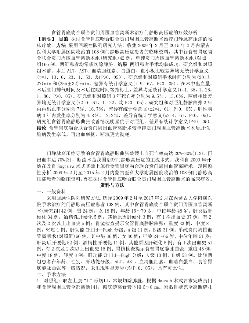 食管胃底吻合联合贲门周围血管离断术治疗门静脉高压症的疗效分析【摘要】目的探讨食管胃底吻合联合贲门周围血管离断术治疗门静脉高压症的临床疗效。方法采用回顾性队列研究方法。收集2009年2月至2015年2月内蒙古医科大学附属医院收治的108例门静脉高压症患者的临床资料,其中行食管胃底吻合联合责门周围血管离断术组(研究组)42例,单纯贲门周围血管离断术组(对照组)66例,两组患者均常规切除脾脏。结果两组患者手术均获成功。研究组和对照组术前、术后ALT、AST、血清胆红素、白蛋白、血小板比较差异均无统计学意义(t=1.13、0.23、1.53,均P>0.05),研究组和对照组手术时间分别为(201±27)min和(255±32)rain,差异有统计学意义(t=9.67,P<0.05)。在术中出血量、术后肛门排气时间及术后住院时间等指标上,差异均无统计学意义(t=1.35,1.26,1.86,P>0.05)。研究组和对照组3年死亡率分别为9.5%、13.6%,两组相比差异均无统计学意义(X2=0.61、1.22,均P>0.05)。研究组和对照组静脉曲张3年内再出血率分别为7%、16.7%,差异有统计学意义(x2=4.61,P<0.05)。肝性脑病3年内发生率分别为4.8%、12.2%,差异有统计学意义(x2=4.61,P<0.05)。研究组食管胃底静脉曲张改善情况明显优于对照组,差异有统计学意义(P<0.05)结论食管胃底吻合联合贲门周围血管离断术较单纯贲门周围血管离断术术后肝性脑病发生率低、再出血率低,断流更为彻底。门静脉高压症导致的食管胃底静脉曲张破裂出血死亡率高达20%-30%{1.2},再出血率达70%3},断流术是我国治疗门静脉高压症的主流术式。我科自2009年开始在改良Sugiura术式基础上施行食管胃底吻合联合贲门周围血管离断术,现回顾性分析2009年2月至2015年2月内蒙古医科大学附属医院收治的108例门静脉高压症患者的临床资料,旨在探讨食管胃底吻合联合贲门周围血管离断术的临床疗效。资料与方法一、一般资料采用回顾性队列研究方法,选择2009年2月至2017年2月在内蒙古大学附属医院手术治疗的门静脉高压症患者108例,其中食管胃底吻合联合贲门周围血管离断术(研究组)42例,男24例,女18例:年龄15~70岁,中位年龄48岁:肝炎后肝硬化34例,酒精性肝硬化5例,其他原因肝硬化3例:有1次出血史37例,有2次及2次以上出血史5例:胃镜检查提示食管胃底静脉曲张:重度33例,中度8例,轻度1例:肝功能Chi1d一Pugh分级:A级11例,B级31例。单纯责门周围血管离断术(对照组)66例,其中男36例,女30例:年龄24~66岁,中位年龄51岁:肝炎后肝硬化52例,酒精性肝硬化11例,其他原因肝硬化8例:有1次出血史51例,有2次及2次以上出血史15例:胃镜检查提示食管胃底静脉曲张:重度45例,中度18例,轻度3例:肝功能Chi1d一Pugh分级:A级13例,B级53例。比较两组患者在年龄、性别、肝功能分级、ALT、AST、血清胆红素、血清白蛋白、食管胃底静脉曲张等一般情况,未出现明显差异(均P>0.05),具有可比性。二、手术方法l.对照组:取左上腹“L”形切口,常规切除脾脏,根据Hassab术式要求完成贲门和食管周围血管全部离断[4],彻底游离食管下段6~8cm。紧贴胃壁完全离断缝扎胃冠状静脉及其食管支和高位食管支、胃短静脉、胃后静脉、左隔下静脉及其相伴的动脉分支。常规切断迷走神经,并打开食管裂孔处的膈肌角,以显露高位食管支和异位高位食管支。检查脾床、脾蒂、血管离断处有无明显出血及食管胃游离区的色泽和血液循环。于左膈下置引流管,逐层关腹。2.研究组:在对照组手术的基础上应用吻合器行食管胃底吻合。应用荷包钳于贵门上方3~4Cm处夹闭并切断食管,将吻合器头端置入食管近端,行荷包缝合后备用。再由远端食管的断端插入吻合器,于胃底的后壁穿出,结合吻合器头部后旋紧至适当位置,完成食管下端和胃底的吻合。退出吻合器,检查切除的两个环行组织断端是否完整,闭合器闭合远端食管断端,适当浆肌层缝合加固吻合口周围。三、术后处理术后给予抗感染、抑酸、止血、营养支持等对症支持治疗,并严密监测肝功能情况,根据血浆白蛋白情况和有无腹水给予血浆或白蛋白,并给予利尿剂,防治肝性脑病。监测血小板情况,如血小板≥600×10/L则给予抗凝治疗,直至血小板降至正常范围(100×10/L~300×10),以防止门静脉血栓形成[5]o。术后3个月行胃镜检查以了解食管胃底静脉曲张情况。四、统计学处理应用SPSS统计软件包(21.0版)分析数据。采用t检验对计量资料进行分析,采用x2检验对计数资料进行分析,用非参数秩和检验对等级资料进行分析,P<0.05为差异具有统计学意义。结果两组患者手术均取得成功。研究组和对照组手术前后ALT、AST、血清胆红素、白蛋白水平和血小板等指标对比差异无统计学意义(P>0.05)详见表1。在术中出血量、术后肛门排气时间及术后住院时间等指标上,差异均无统计学意义(t=1.35,1.26,1.86,P>0.05)详见表2。两组术后随访时间为3年以上部分达6年。研究组和对照组肝性脑病发生率、3年死亡率及再出血率的情况详见表3。术后3个月接受胃镜检查,两组食管胃底静脉曲张改善情况详见表4。表1参数实验组(42例)对照组(66例)P值年龄(中位)48岁51岁性别男2436女1830肝硬化病因乙肝性肝硬化2336丙肝性肝硬化1114酒精性肝硬化511其他原因35Child分级A级1113B级3153参数实验组(42例)对照组(66例)P值术前ALT (U/L)26.4±18.727.9±17.5AST (U/L)33.7±23.628.5±16.0TB24.5±13.222.3±9.5白蛋白(g/L)36.9±4.636.5±5.0PLT(×109/L)62.1±27.861.7±21.5术后ALT (U/L)28.6±12.330±14.5AST (U