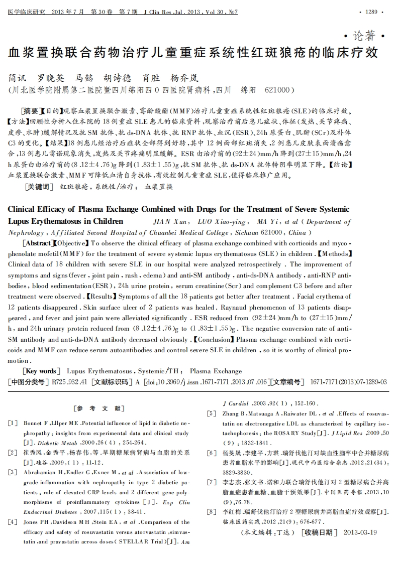 论著・血浆置换联合药物治疗儿童重症系统性红斑狼疮的临床疗效简讯罗晓英马懿胡诗德肖胜杨乔岚(川北医学院附属第二医院暨四川绵阳四0四医院肾病科,四川绵阳621000)[摘要【目的】观察血浆置换联合激素、霉酚酸酯(MMF)治疗儿童重症系统性红斑狼疮(SLE)的临床疗效。【方法】回顾性分析入住本院的18例重症SLE患儿的临床资料,观察治疗前后患儿症状、体征(发热、关节疼痛、皮疹、水肿)缓解情况及抗SM抗体、抗ds-DNA抗体、抗RNP抗体、血沉(ESR、24h尿蛋白、肌酐(SC)及补体C3的变化。【结果】18例患儿经治疗后症状全部得到好转,其中12例面部红斑消失,2例患儿皮肤表面资疡愈合,13例患儿雷诺现象消失,发热及关节疼痛明显缓解。ESR由治疗前的(92士24)mm/h降到(27士15)mmh,24h尿蛋白由治疗前的(812士4.76)g降到(1.83士155)g,抗SM抗体、抗ds-DNA抗体转阴率明显下降。【结论】血浆置换联合激素、MMF可降低血清自身抗体,有效控制儿童重症SLE,值得临床推广应用。[关键词]红斑狼疮,系统性/治疗;血浆置换Clinical Efficacy of Plasma Exchange Combined with Drugs for the Treatment of Severe SystemicLupus Erythematosus in Children JIA N Xun,LUO Xiao-ying,MA Yi,et al Department ofNephrology,Affiliated Second Hospital of Chuanbei Medical College,Sichuan 621000,China)[Abstract Objectivel To observe the dlinical efficacy of plasma exchange combined with corticoids and myco-phenolate mofetil(M MF)for the treatment of severe systemic lupus ery thematosus (SLE)in children.[Methods]Clinical data of 18 children with severe SLE in our hospital were analyzed retrospectively.The improvement ofsymptoms and signs(fever,joint pain,rash,edema)and anti-SM antibody,anti-ds-DNA antibody,anti-RNP anti-bodies,blood sedimentation(ESR),24h urine protein,serum creatinine(Scr)and complement C3 before and aftertreatment were observed.[Results]Symptoms of all the 18 patients got better after treatment.Facial erythema of12 patients disappeared.Skin surface ulcer of 2 patients was healed.Raynaud phenomenon of 13 patients disap-peared,and fever and joint pain were alleviated significantly ESR reduced from (92+24 )mm/h to (27+15)mm/h,and 24h urinary protein reduced from (8.12+4.76)g to (1.83+1.55)g.The negative conversion rate of anti-SM antibody and anti-ds-DNA antibody decreased obviously.[Conclusion]Plasma exchange combined with corti-coids and MMF can reduce serum autoantibodies and control severe SLE in children so it is worthy of clinical pro-motion.[Key words]Lupus Erythematosus,Systemic/TH;Plasma Exchange[中图分类号]R725.932.41[文献标识码]A[doi:10.39691issn.1671-7171.2013.07.016][文章编号]1671-7171(201307-1289-03I Cardiol,2003,92(1):152-160.[参考文献][5]Zhang B,Matsuaga A,Raiwater DL,et al .Effects of rosuvas-[1]Bonnet F,Lllper ME .Potential influence of lipid in diabetic ne-tatin on electronegative LDL as characterized by capillary iso-phropathy:insights from experimental data and clinical studytachophoresis:the ROSARY Study [J].J Lipid Res 2009,50[J].Diabetic Metab,2000,26(4):254-264.(9):1832-1841.[2]崔秀凤,金秀平,杨春伟,等.早期糖尿病肾病与血脂的关系[6]杨旻最,李建平,方琪.瑞舒伐他汀对缺血性脑卒中合并糖尿病[J].硅谷,2009,(1):11-12.患者血脂水平的影响[J].现代中西医结合杂志,2012,21(34):[3]Abrahamian H,Endler G,Exner M,et al.A ssociation of low-3829-3830grade inflammation with nephropathy in type 2 diabetic pa-[7]李志杰,张文书.诺和力联合瑞舒伐他汀对2型糖尿病合并高tients role of elevated CRP-levels and 2 different gene-poly-脂血症患者血糖、血脂干预效果[J].中国医药导报,2013,10morphisms of proinflammatory cytokines [J ]Exp Clin(9):76-78.Endocrinol Diabetes 2007,115(1)38-41.[8]李红梅.瑞舒伐他汀治疗2型糖尿病并高脂血症疗效观察[J].[4]Jones PH,Davidson MH ,Stein EA,et al .Comparison of the临床医药实践,2012,21(9):676-677.efficacy and safety of rosuvastatin versus atorvastatin ,simvas-(本文编辑:丁达)[收稿日期]2013-03-19tatin ,and prav astatin across doses STELLA R Trial )[J].Am系统性红斑狼疮(systemic lupus erythemato-行23次PE。sus,SLE)是儿童常见的自身免疫性疾病,可致肾1.3.2药物治疗PE治疗结束后给予正规糖皮质脏、心血管、神经等多个器官和组织受累。重症SLE激素治疗。甲强龙(剂量为0.5g/d)冲击治疗3d又叫狼疮危象,指的是危及生命的急性SLE,包括急后,给予口服泼尼松1mg/(kg·d)治疗6个月,之进性狼疮肾炎、狼疮肺炎、粒细胞缺乏症、严重中枢后逐渐减量,最后维持治疗(10~15mg/d)。神经系统损害等,狼疮危象以儿童发病多见叮。本同时应用MMF治疗(1.5~2.0g/A)约10~15院从2006年6月至今采用血浆置换(PE)联合激d,临床症状缓解后逐渐减少剂量至1.0g/A维持半素、霉酚酸酯(MMF)治疗18例重症SLE患儿,近年左右,之后以0.75g/d维持治疗。疗程以1.52远期疗效均比较满意,现报道如下。年为宜。10例狼疮性肾炎患儿加用雷公藤(20mg,3次/日)。1临床资料1.4观察指标观察置换前后一般情况如发热、关1.1一般资料18例重症SLE患儿均符合美国风节疼痛、皮疹、水肿的改善情况,监测血、尿常规及肝湿病协会(ARA)1982年修订的重症SLE诊断标肾功能的变化以及雷诺症的出现频率及程度。PE准。其中男3例,年龄10.2(5一14)岁:女15例,年时密切关注生命体征的变化。龄9.4(4一15)岁,男女比例为1:5.18例患儿中合观察治疗前后抗SM抗体、抗ds-DNA抗体、抗并狼疮性肾炎10例,狼疮性肺炎3例,粒细胞缺乏RNP抗体、血沉(ESR)、补体C3的表达情况。24h症3例,ADA阳性7例,抗ds-DNA抗体阳性9例,尿蛋白、肌酐(SCr)治疗前后的变化。尿蛋白(十一H)14例。病程1个月至3年。所有1.5统计学方法应用SPSS13.0统