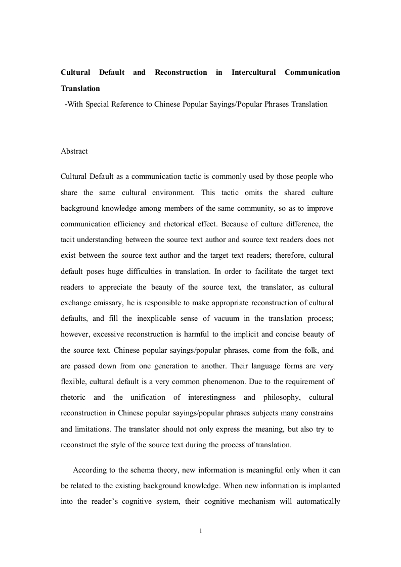 Cultural Default andReconstruction in Intercultural CommunicationTranslation-With Special Reference to Chinese Popular Sayings/Popular Phrases TranslationAbstractCultural Default as a communication tactic is commonly used by those people whoshare the same cultural environment.This tactic omits the shared culturebackground knowledge among members of the same community,so as to improvecommunication efficiency and rhetorical effect.Because of culture difference,thetacit understanding between the source text author and source text readers does notexist between the source text author and the target text readers;therefore,culturaldefault poses huge difficulties in translation.In order to facilitate the target textreaders to appreciate the beauty of the source text,the translator,as culturalexchange emissary,he is responsible to make appropriate reconstruction of culturaldefaults,and fill the inexplicable sense of vacuum in the translation process;however,excessive reconstruction is harmful to the implicit and concise beauty ofthe source text.Chinese popular sayings/popular phrases,come from the folk,andare passed down from one generation to another.Their language forms are veryflexible,cultural default is a very common phenomenon.Due to the requirement ofrhetoric and the unification of interestingness and philosophy,culturalreconstruction in Chinese popular sayings/popular phrases subjects many constrainsand limitations.The translator should not only express the meaning,but also try toreconstruct the style of the source text during the process of translation.According to the schema theory,new information is meaningful only when it canbe related to the existing background knowledge.When new information is implantedinto the reader's cognitive system,their cognitive mechanism will automaticallysearch for the mapping schema to fill its slots so as to activate that schema.Thetranslator can reconstruct the cultural background information to help the target textreaders activate their corresponding cultural schema,so as to realize cross-culturalcommunication.In this paper,the author will study several aspects of cultural reconstructionmethod according to the characteristics of Chinese popular sayings/popular phrases,and at the same time,put forward some suitable reconstruction method of culturaldefault in Chinese popular sayings/popular phrases translation according to theworking mechanism of cultural schema.At the end,the author points out that when reconstructing cultural default inChinese popular sayings/popular phrases,the translator should considerate bothimplicitness and concise beauty of these phrases,and try his best to reconstruct theircharacteristics.However,that is under one condition,that's when the culturalinformation is fully translated,if the translator can not do both,priority should begiven to the reconstruction of cultural information,because the cultural exchange isan important purpose of translation,it's also the cooperation basis between thosecountries who share distinctive cultures.Key words:cultural default,cognitive mechanism,cultural schema theory,culturalreconstruction,the translator's cultural awareness,popular sayings/popularphrases translation2摘要文化缺省作为一种交际策略,在日常生活中,同一文化环境的人们在交流时比较普遍地使用。这一策略省略了同一文化成员之间一些共有的文化背景知识,从而提高交流的效率和修辞效果。但由于文化的差异,原作者与原文读者之间的这种默契不可能天然的存在于原作者与目的语读者之间,这就使得文化省略在翻译中变得非常棘手。为了使目的语读者也能充分的欣赏到原文作品的优美,译者作为文化交流的使者,就有必要对其作出适当的重构,填补那些莫名的意义真空:然而过度的重构又会使得原文的含蓄性和简洁美遭受损坏。中国俗语,来自民间,广泛流传,其语言形式非常灵活,涉及到文化缺省的情况非常多。由于俗语讲究修辞手法,讲究趣味性与哲理性的统一,所以,文化的重构受到很多的限制和阻碍。翻译时不仅要把意思表达出来,还要尽量追求文体风格的统一。根据图式理论,只有把新信息和已有信息联系起来,才能产生意义。当新信息被植入读者的认知体系中,他们的认知机制就会自动去搜索相关联或相应的图式,并把新信息放入图式的空位以激活此图式。译者可把原文省略的文化背景信息在译文中重构出来,为目的语读者提供填充项填补原文中文化缺省词的图式,以帮助他们成功激活相应的文化图式,达到跨文化交流的目的。在此论文中,作者会根据中国俗语的特点,从几个方面去研究文化重构的方法,并根据文化图式的工作理论提出中国俗语翻译中文化缺省部分合适的重构方法。最后,作者提出译者在重构俗语中文化缺省时,应该考虑到俗语的含蓄性和简洁美,尽量重构俗语的这些特征。但这是在文化信息得到充分翻译的前提下提出来的,如果译者无法做到两者兼顾,只能优先考虑重构俗语的文化信息,因为文化的交流是翻译的一个重要目的,是当今世界有着不同文化的国家间合作的前期。关键词:文化缺省,认知机制,文化图式理论,文化重构,译者的跨文化意识,俗语翻译3