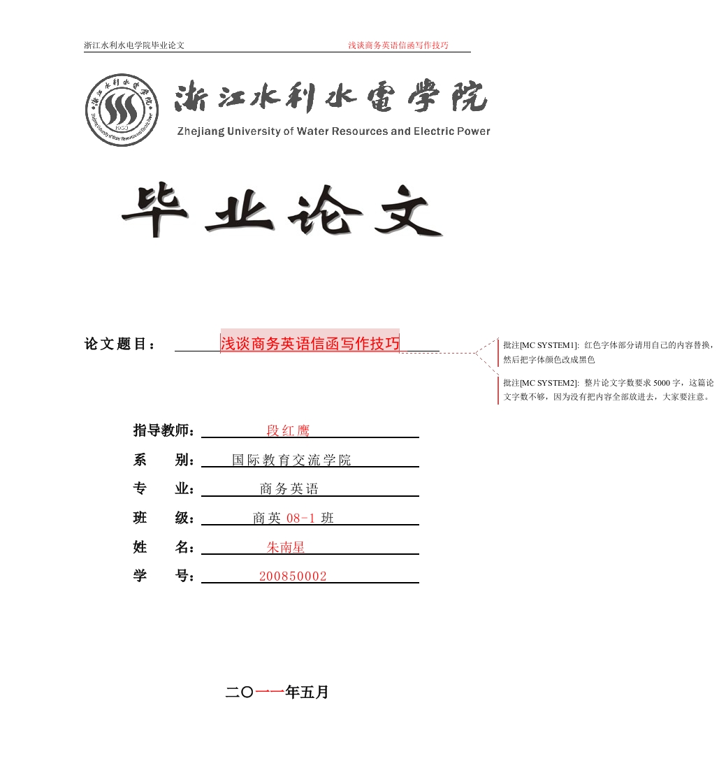 浙江水利水电学院毕业论文浅谈商务英语信函写作技巧Zhejiang University of Water Resources and Electric Power毕业论文论文题目:浅谈商务英语信函写作技巧批注MC SYSTEMI]:小红色字体部分请用自己的内容替换,然后把字体颜色改成黑色批注MC SYSTEM2:整片论文字数要求5000字,这篇论文字数不够,因为没有把内容全部放进去,大家要注意。指导教师:段红鹰系国际教育交流学院专商务英语班级:商英08-1班姓名:朱南星学号:200850002二O一一年五月浙江水利水电学院毕业论文浅谈商务英语信函写作技巧摘要批注MC SYSTEM3]:摘要字数要求200以上,这篇偏少。本文通过对网络护肤品牌芳草集网络营销策略的分析,分析内容包括芳草集的品牌介绍和芳草集的发展历程,目前的芳草集网络销售现状,产品策略管理,渠道价格政策,渠道策略和促销策略等方面存在的问题等。并以这些内容为研究对象,对芳草集护肤品牌网络营销现状进行了分析,总结了目前策略上的不足,并提出了相应的改进建议。希望能给芳草集网络营销策略管理上有一定的参考借鉴作用。关键词:芳草集;网络营销策略:问题;建议浙江水利水电学院毕业论文浅谈商务英语信函写作技巧Abstract批注MC SYSTEM4]:这部分绝不允许机器翻译!Based on the Grass Set skincare brand network marketing批注MC SYSTEM5]:英文部分要特别注意避免语言错误。系统提示的红色和绿色波浪线说明语言需要修改。交上来strategy network analysis,including analysis of grass and set之前至少要保证没有这种提示。the current status of Internet sales,herb collection ofconsumer groups,product strategy,management,marketingchannels,pricing policies and the existence of problems suchas.And to the conent anaysis,skin-care brand on the Grass Set批注len6]:红色波浪线说明有拼写错误,上交之前回避此类错误。status of network marketing is analyzed,summarized the currentshortage of strategy and putforward appropriaterecommendations for improvement.Grass hope that I can set thenetwork marketing strategy has some reference managementreference.Key words:Grass set;network marketing strategy;problems;suggestions