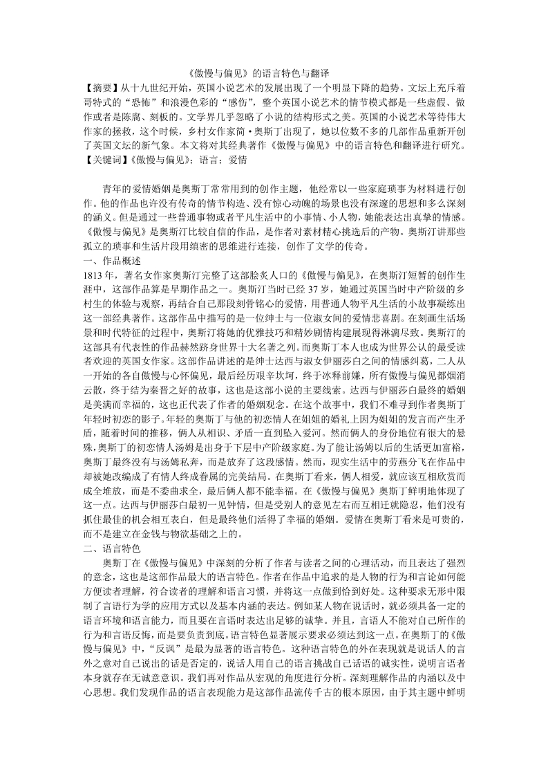 《傲慢与偏见》的语言特色与翻译【摘要】从十九世纪开始,英国小说艺术的发展出现了一个明显下降的趋势。文坛上充斥着哥特式的“恐怖”和浪漫色彩的“感伤”,整个英国小说艺术的情节模式都是一些虚假、做作或者是陈腐、刻板的。文学界几乎忽略了小说的结构形式之美。英国的小说艺术等待伟大作家的拯救,这个时候,乡村女作家简·奥斯丁出现了,她以位数不多的几部作品重新开创了英国文坛的新气象。本文将对其经典著作《傲慢与偏见》中的语言特色和翻译进行研究。【关键词】《傲慢与偏见》:语言:爱情青年的爱情婚姻是奥斯丁常常用到的创作主题,他经常以一些家庭琐事为材料进行创作。他的作品也许没有传奇的情节构造、没有惊心动魄的场景也没有深邃的思想和多么深刻的涵义。但是通过一些普通事物或者平凡生活中的小事情、小人物,她能表达出真挚的情感。《傲慢与偏见》是奥斯汀比较自信的作品,是作者对素材精心挑选后的产物。奥斯汀讲那些孤立的琐事和生活片段用缜密的思维进行连接,创作了文学的传奇。一、作品概述1813年,著名女作家奥斯汀完整了这部脍炙人口的《傲慢与偏见》,在奥斯汀短暂的创作生涯中,这部作品算是早期作品之一。奥斯汀当时己经37岁,她通过英国当时中产阶级的乡村生的体验与观察,再结合自己那段刻骨铭心的爱情,用普通人物平凡生活的小故事凝练出这一部经典著作。这部作品中描写的是一位绅士与一位淑女间的爱情悲喜剧。在刻画生活场景和时代特征的过程中,奥斯汀将她的优雅技巧和精妙剧情构建展现得淋漓尽致。奥斯汀的这部具有代表性的作品赫然跻身世界十大名著之列。而奥斯丁本人也成为世界公认的最受读者欢迎的英国女作家。这部作品讲述的是绅士达西与淑女伊丽莎白之间的情感纠葛,二人从一开始的各自傲慢与心怀偏见,最后经历艰辛坎坷,终于冰释前嫌,所有傲慢与偏见都烟消云散,终于结为秦晋之好的故事,这也是这部小说的主要线索。达西与伊丽莎白最终的婚姻是美满而幸福的,这也正代表了作者的婚姻观念。在这个故事中,我们不难寻到作者奥斯丁年轻时初恋的影子。年轻的奥斯丁与他的初恋情人在姐姐的婚礼上因为姐姐的发言而产生矛盾,随着时间的推移,两人从相识、矛盾一直到坠入爱河。然而两人的身份地位有很大的悬殊,奥斯丁的初恋情人汤姆是出身于下层中产阶级家庭。为了能让汤姆以后的生活更加官裕,奥斯丁最终没有与汤姆私奔,而是放弃了这段感情。然而,现实生活中的劳燕分飞在作品中却被她改编成了有情人终成眷属的完美结局。在奥斯丁看来,俩人相爱,就应该互相欣赏而成全堆放,而是不委曲求全,最后两人都不能幸福。在《傲慢与偏见》奥斯丁鲜明地体现了这一点。达西与伊丽莎白最初一见钟情,但是受别人的意见左右而互相迁就隐忍,他们没有抓住最佳的机会相互表白,但是最终他们活得了幸福的婚姻。爱情在奥斯丁看来是可贵的,而不是建立在金钱与物欲基础之上的。二、语言特色奥斯丁在《傲慢与偏见》中深刻的分析了作者与读者之间的心理活动,而且表达了强烈的意念,这也是这部作品最大的语言特色。作者在作品中追求的是人物的行为和言论如何能方便读者理解,符合读者的理解和语言习惯,并将这一点做到恰到好处。这种要求无形中限制了言语行为学的应用方式以及基本内涵的表达。例如某人物在说话时,就必须具备一定的语言环境和语言能力,而且要在言语时表达出足够的诚挚。并且,言语人不能对自己所作的行为和言语反悔,而是要负责到底。语言特色显著展示要求必须达到这一点。在奥斯丁的《傲慢与偏见》中,“反讽”是最为显著的语言特色。这种语言特色的外在表现就是说话人的言外之意对自己说出的话是否定的,说话人用自己的语言挑战自己话语的诚实性,说明言语者本身就存在无诚意意识。我们再对作品从宏观的角度进行分析。深刻理解作品的内涵以及中心思想。我们发现作品的语言表现能力是这部作品流传千古的根本原因,由于其主题中鲜明的反讽特征,使得这部作品在涵义上超越了一切通俗小说。奥斯丁在讲述剧情的时候,采用的就是反讽的语气。通过这种方式,对当时社会的价值观进行犀利的评价。作品所表现出来的价值观在那个时代无论是作者还是其他的人多数无法接受和理解,因此,作者要在作品中尽可能地与读者就这些理念进行沟通。在整个故事发展的过程中,同样也展现了反讽语言的艺术魅力。在描写爱情的小说中,传统上作者会设计一个完美的王子般的男主人公,然后再遇到一位同样完美无瑕的公主。两人一见钟情,然后经历种种磨难最终走到一起。但是在《傲慢与偏见》中,对于男女主人公,读者无法想象他们之间会产生爱情,也没有想到作者会是这样安排剧情的发展。奥斯丁在俩人情感发展的道路上设置了重重障碍。在主人公不断前进的脚步中,多次运用反讽的语言突出人物的行为以及性格特点。但是,读者可以通过反讽语言清楚地看到故事情节的展开。作品的层次感也因此而更加鲜明,主题更为集中。《傲慢与偏见》在语言运用上的一大特色就是反讽语言的运用。作者运用反讽语言对人物之间的关系以及人物的个性进行了巧妙地衬托。作品的主题也在这些关系中表现得更为明显。