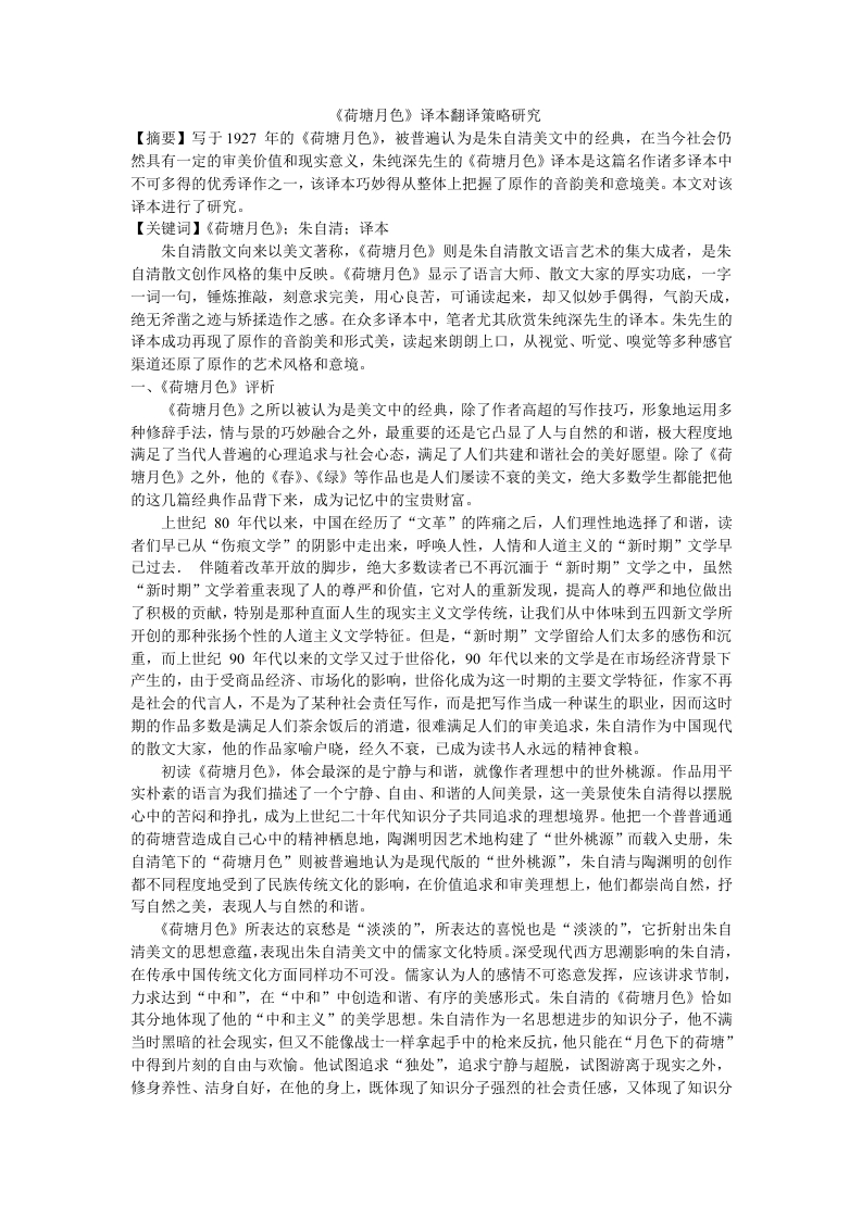 《荷塘月色》译本翻译策略研究【摘要】写于1927年的《荷塘月色》,被普遍认为是朱自清美文中的经典,在当今社会仍然具有一定的审美价值和现实意义,朱纯深先生的《荷塘月色》译本是这篇名作诸多译本中不可多得的优秀译作之一,该译本巧妙得从整体上把握了原作的音韵美和意境美。本文对该译本进行了研究。【关键词】《荷塘月色》:朱自清:译本朱自清散文向来以美文著称,《荷塘月色》则是朱自清散文语言艺术的集大成者,是朱自清散文创作风格的集中反映。《荷塘月色》显示了语言大师、散文大家的厚实功底,一字一词一句,锤炼推敲,刻意求完美,用心良苦,可诵读起来,却又以妙手偶得,气韵天成,绝无斧凿之迹与矫揉造作之感。在众多译本中,笔者尤其欣赏朱纯深先生的译本。朱先生的译本成功再现了原作的音韵美和形式美,读起来朗朗上口,从视觉、听觉、嗅觉等多种感官渠道还原了原作的艺术风格和意境。一、《荷塘月色》评析《荷塘月色》之所以被认为是美文中的经典,除了作者高超的写作技巧,形象地运用多种修辞手法,情与景的巧妙融合之外,最重要的还是它凸显了人与自然的和谐,极大程度地满足了当代人普遍的心理追求与社会心态,满足了人们共建和谐社会的美好愿望。除了《荷塘月色》之外,他的《春》、《绿》等作品也是人们屡读不衰的美文,绝大多数学生都能把他的这几篇经典作品背下来,成为记忆中的宝贵财富。上世纪80年代以来,中国在经历了“文革”的阵痛之后,人们理性地选择了和谐,读者们早己从“伤痕文学”的阴影中走出来,呼唤人性,人情和人道主义的“新时期”文学早己过去.伴随着改革开放的脚步,绝大多数读者己不再沉酒于“新时期”文学之中,虽然“新时期”文学着重表现了人的尊严和价值,它对人的重新发现,提高人的尊严和地位做出了积极的贡献,特别是那种直面人生的现实主义文学传统,让我们从中体味到五四新文学所开创的那种张扬个性的人道主义文学特征。但是,“新时期”文学留给人们太多的感伤和沉重,而上世纪90年代以来的文学又过于世俗化,90年代以来的文学是在市场经济背景下产生的,由于受商品经济、市场化的影响,世俗化成为这一时期的主要文学特征,作家不再是社会的代言人,不是为了某种社会责任写作,而是把写作当成一种谋生的职业,因而这时期的作品多数是满足人们茶余饭后的消遣,很难满足人们的审美追求,朱自清作为中国现代的散文大家,他的作品家喻户晓,经久不衰,己成为读书人永远的精神食粮。初读《荷塘月色》,体会最深的是宁静与和谐,就像作者理想中的世外桃源。作品用平实朴素的语言为我们描述了一个宁静、自由、和谐的人间美景,这一美景使朱自清得以摆脱心中的苦闷和挣扎,成为上世纪二十年代知识分子共同追求的理想境界。他把一个普普通通的荷塘营造成自己心中的精神栖息地,陶渊明因艺术地构建了“世外桃源”而载入史册,朱自清笔下的“荷塘月色”则被普遍地认为是现代版的“世外桃源”,朱自清与陶渊明的创作都不同程度地受到了民族传统文化的影响,在价值追求和审美理想上,他们都崇尚自然,抒写自然之美,表现人与自然的和谐。《荷塘月色》所表达的哀愁是“淡淡的”,所表达的喜悦也是“淡淡的”,它折射出朱自清美文的思想意蕴,表现出朱自清美文中的儒家文化特质。深受现代西方思潮影响的朱自清,在传承中国传统文化方面同样功不可没。儒家认为人的感情不可恣意发挥,应该讲求节制,力求达到“中和”,在“中和”中创造和谐、有序的美感形式。朱自清的《荷塘月色》恰如其分地体现了他的“中和主义”的美学思想。朱自清作为一名思想进步的知识分子,他不满当时黑暗的社会现实,但又不能像战士一样拿起手中的枪来反抗,他只能在“月色下的荷塘”中得到片刻的自由与欢愉。他试图追求“独处”,追求宁静与超脱,试图游离于现实之外,修身养性、洁身自好,在他的身上,既体现了知识分子强烈的社会责任感,又体现了知识分子的软弱性格与逃避现实的心态,他既不满现实,又不敢公开向当局挑战,这些正是儒家的“中和主义”对他的影响,他的人生态度必然影响他的散文创作,《荷塘月色》“哀而不伤”的情感表现也正是这种“中和主义”美学思想的体现。二、《荷塘月色》译本翻译策略1、再现原文的艺术美感《荷塘月色》是中国散文大家朱自清先生的名篇,“是梦娜丽莎微笑似的美文”[3)]。朱先生认为,散文就应该是画,是“以文字作画”(朱自清:《山野缀拾》),他的这篇散文就是“用文字作画”的范本。该篇散文文笔优美,寓情于景,情景交融,出神入化,宛如一幅逼真的山水名画。语言充满音乐美和绘画美,读起来令人心旷神怡。这篇文章很显然属于莱斯文本分类中的第二类,即“注重形式”的文本。要成功翻译这篇散文,译者必须要再现原文的艺术美感,“换一种文字作画”。朱纯深先生在翻译这篇文章时,是否注意保留原文的形式,留住原文的美了呢?朱先生的译文Moonlight Over the Lotus Pond在再现原文内容和形式方面达到了“化境”,读起来琅琅上口,使人感觉到是在读原汁原味的写景状物的英语散文。这篇译文具有很强的艺术美感,语言自然、准确、地道、活泼、鲜明、生动,在传达原文内容及形式信息方面,可谓恰到好处,完全符