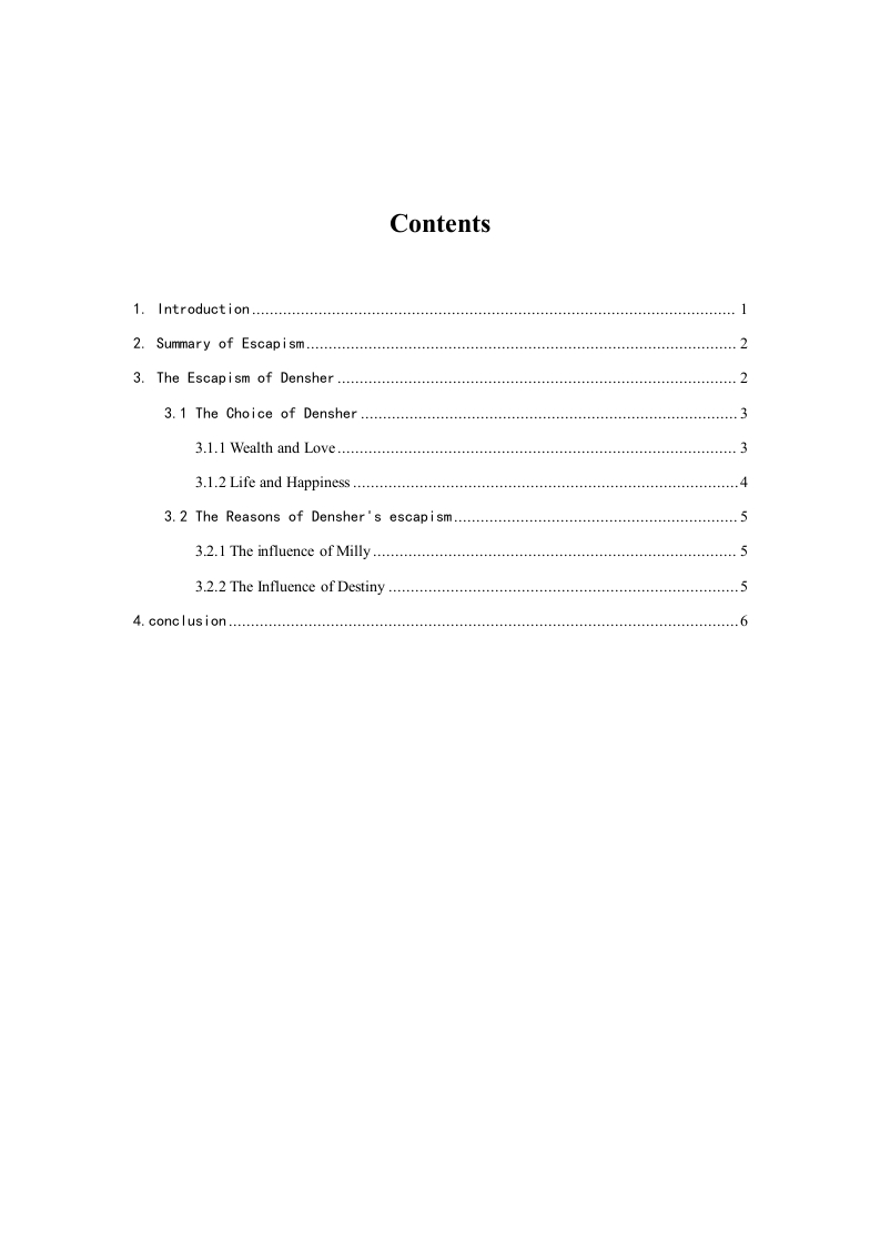 Contents1.l ntroduction12.Summary of Escapism.23.The Escapism of Densher...............3.1.2 Life and Happiness....3.2 The Reasons of Densher's escapism..........................53.2.2 The Influence of Destiny............561.IntroductionThe wings of the Dove is a famous movie directed by lan Softley.It was first released in theUnited States in November 7,1997.According to the novel of the same name by American writerHenry James,the film tells that Kate and Morton are truly devoted men and women,but they wantto cheat Millie's story in order to achieve the combination of two people.Kate Croy and Merton Densher are two betrothed Londoners who desperately want to marrybut have very little money.Kate is constantly put upon by family troubles,and is now living withher domineering aunt,Maud Lowder.Into their world comes Milly Theale,an enormously richyoung American woman who had previously met and fallen in love with Densher,although shehas never revealed her feelings.Her travelling companion and confidante,Mrs.Stringham,is anold friend of Maud.Kate and Aunt Maud welcome Milly to London,and the American heiressenjoys great social success.With Kate as a companion,Milly goes to see an eminent physician,Sir Luke Strett,becauseshe worries that she is suffering from an incurable disease.The doctor is noncommittal but Millyfears the worst.Kate suspects that Milly is deathly ill.After the trip to America where he had metMilly,Densher returns to find the heiress in London.Kate wants Densher to pay as much attentionas possible to Milly,though at first he doesn't quite know why.Kate has been careful to concealfrom Milly (and everybody else)that she and Densher are engaged.With the threat of serious illness hanging over her,Milly decides to travel to Venice with Mrs.Stringham.Aunt Maud,Kate and Densher follow her.At a party Milly gives in her Venice palazzo(the older Palazzo Barbaro,called "Palazzo Leporelli"in the novel),Kate finally reveals hercomplete plan to Densher:he is to marry Milly so that,after her presumably soon-to-occur death,he will inherit the money they can marry on.Densher had suspected this was Kate's idea,and hedemands that she consummate their affair before he will go along with her plan.Aunt Maud and Kate return to London while Densher remains with Milly.Unfortunately,thedying girl leams from a former suitor of Kate's about the plot to get her money.She withdrawsfrom Densher and her condition deteriorates.Densher sees her one last time before he leaves forLondon,where he eventually receives news of Milly's death.Milly does leave him a large amountof money despite everything.But Densher does not accept the money,and he will not marry Kateunless she also refuses the bequest.Conversely,if Kate chooses the money instead of him,Densher offers to make the bequest over to her in full.The lovers part on the novel's final pagewith a cryptic exclamation from Kate:"We shall never be again as we were!"2.Summary of EscapismGenerally,escapism meas not to be confused with Escapology,the art of escaping physicalmeans of restraint.Escapism is the avoidance of unpleasant,boring,arduous,scary,or banalaspects of daily life.It can also be used as a term to define the actions people take to help relievepersisting feelings of depression or general sadness.Entire industries have sprung up to foster a growing tendency of people to removethemselves from the rigors of daily life,especially into the digital world.Many activities that arenormal parts of a healthy existence (e.g.,eating,sleeping,exercise,sexual activity)can alsobecome avenues of escapism when taken to extremes or out of proper context;and as a result theword "escapism"often carries a negative connotation,suggesting that escapists are unhappy,withan inability or unwillingness to connect meaningfully with the world and to take necessary action.Indeed,the OED defined escapism as "The tendency to seek,or the practice of seeking,distractionHowever,many challenge the idea that escapism is fundamentally and exclusively negative.C.S.Lewis was fond of humorously remarking that the usual enemies of escape were jailers;andconsidered that used in moderation escapism could serve both to refresh and to expand theimaginative powers.Similarly J.R.R.Tolkien argued for escapism in fantasy literature as thecreative expression of reality within a secondary (imaginative)world,(but also emphasised thatthey required an element of horror in them,if they were not to be 'mere escapism').Terry Pratchettconsidered that the twentieth century had seen the development over time of a more positive viewof escapist literature.Apart from literature,music has been seen and valued as an artistic mediumof escape,too.3.The Escapism of DensherThough a journalist of Fleet Street,Merton Densher is still an outsider of British politesociety.Fleet Street,a street in the City of London,has been the home of British nationalnewspapers until the 1980s.To be a journalist of Fleet Street that has a position of eminence is anhonor to Merton.He has his migratory parents,one being a British chaplain and the other being acopyist.They make him spend his early years abroad,attending his Swiss schools and Germanuniversity.His foreign experiences enlarge his knowledge and foster his openness and are of greatbenefit to his job.Mrs.Lowder,the organizer of social activities,appreciates his frankness,eloquence and cleverness and often invites him to take part in parties of polite society,where hefalls in love with Kate at first sight.Unfortunately,though Mrs.Lowder likes Merton,she is tryingto prevent love affair between he and Kate.That is because Merton is not regarded by Mrs.Lowder as the right person for the husband of Kate due to his lack of money.Instead,Lord Mark,Mrs.Lowder thinks,is just the right person for Kate due to his brilliant future.Merton,an outsider of British polite society,wins Milly's high favor.Merton will not beaccepted by Mrs.Lowder,Kate's foster mother,and Mrs.Condrip,Kate's elder si