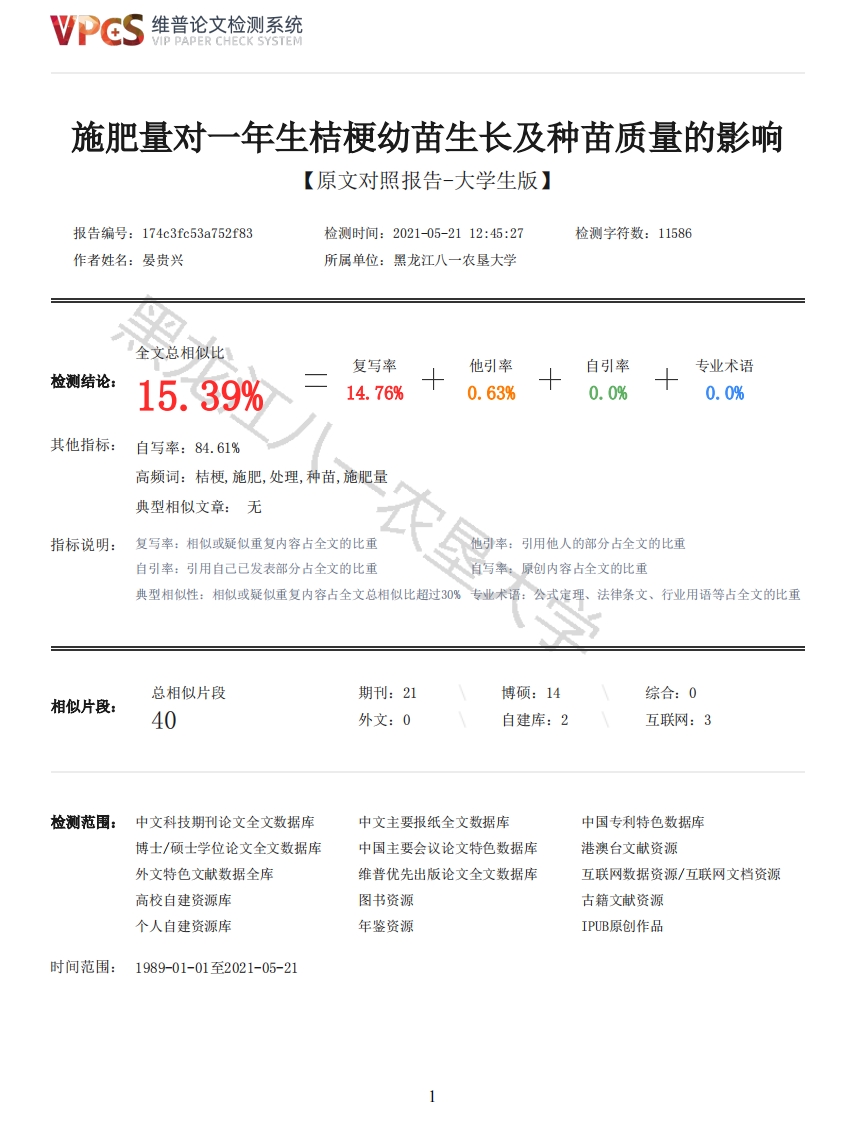 维普论文检测系统VIP PAPER CHECK SYSTEM施肥量对一年生桔梗幼苗生长及种苗质量的影响【原文对照报告-大学生版】报告编号:174c3fc53a752f83检测时间:2021-05-2112:45:27检测字符数:11586作者姓名:晏贵兴所属单位:黑龙江八一农垦大学全文总相似比复写率他引率自引率专业术语检测结论:15.39%14.76%0.63%0.0%0.0%其他指标:自写率:84.61%高频词:桔梗,施肥,处理,种苗,施肥量典型相似文章:无指标说明:复写率:相似或疑似重复内容占全文的比重引用他人的部分占全文的比重自引率:引用自己已发表部分占全文的比重自写率:原创内容占全文的比重典型相似性:相似或疑似重复内容占全文总相似比超过30%专业术语:公式定理、法律条文、行业用语等占全文的比重总相似片段期刊:21博硕:14综合:0相似片段:40外文:0自建库:2互联网:3检测范围:中文科技期刊论文全文数据库中文主要报纸全文数据库中国专利特色数据库博士/硕士学位论文全文数据库中国主要会议论文特色数据库港澳台文献资源外文特色文献数据全库维普优先出版论文全文数据库互联网数据资源/互联网文档资源高校自建资源库图书资源古籍文献资源个人自建资源库年鉴资源IPUB原创作品时间范围:1989-01-01至2021-05-21维普论文检测系统VIP PAPER CHECK SYSTEM原文对照颜色标注说明:■自写片段■复写片段(相似或疑似重复)引用片段(引用)■专业术语(公式定理、法律条文、行业用语等)摘要本文研究了不同施肥量条件下桔梗生长与种苗质量的关系。为提高桔梗的种苗质量,在N:P205:K20施用比例为1:0.3:0.5固定情况下设定4种(F0、F1、F2和F3)不同的施肥量,施肥量分别为0kg/667m、10kg/667m、20kg/667m和40kg/667m,分别对株高、根长、茎粗、侧根数量等相关指标的测定。结果表明,施肥对株高具有一定的影响,特别是对于桔梗生育后期影响达到了显著水平,同时施肥处理可以有效提高桔梗种苗质量级别。在这个试验中施肥对种苗的地下生长量根的生长(根长,根粗)以及上生长量茎的生长(茎长,茎粗),在不同的时期作用下都有显著的影响。为桔梗生产中确定一个合理的施肥量,以实现经济有效的提高桔梗的生长以及提升桔梗的种苗质量。关键词:桔梗:地下生长量:地上生长量:种苗质量AbstractThis article studied the relationship between Platycodon grandiflorum growth and seedlingquality under different fertilization conditions.In order to improve the seedling quality ofPlatycodon grandiflorum,four different fertilizer rates (F0,Fl,F2,and F3)were set under thefixed application ratio of N:P205:K20 of 1:0.3:0.5,and the fertilizer rates were 0 kg/667 squaremeters,10 kg/667 square meters,20 kg/667 square meters and 40 kg/667 square meters,respectivelyto determine plant height,root length,stem thickness,lateral root number and other relatedindicators.The results show that fertilization has a certain effect on plant height,especially theimpact on Platycodon grandiflorum in the late growth period reached a significant level,andfertilization treatment can effectively improve the quality of Platycodon grandiflorum seedlings.Inthis experiment,fertilization had a significant effect on the growth of the roots (root length,heel thickness)and the growth of the upper growth (stem length,stem thickness)of the seedlingsunder different periods of action.Determine a reasonable amount of fertilizer for the production ofPlatycodon grandiflorum in order to achieve economical and effective improvement of the growth ofPlatycodon grandiflorum and the quality of seedlings of Platycodon grandiflorum.Key words:Platycodon grandiflorum;underground growth;aboveground growth;seedling quality前言桔梗Platycodon grandif1f1orum(Jacq.)A.DC.为桔梗科桔梗属多年生草本植物,又名铃挡花、僧帽花、和尚帽子、灯笼棵、明叶菜、白药、土人参等,是一种传统中药。桔梗原产于中国、日本、朝鲜,现全国各地均有栽培【1】。桔梗以其地下根茎作为主要的入药部位:属于食药同源类经济作物。经济价值目前的主要开发方向比较倾向于药用价值以及食用价值两个方面。桔梗具有宣肺、祛痰、镇咳、散寒、消肿、排脓等功效【2】。目前,关于桔梗的研究主要集中在其化学成分、药理药效、种质资源、炮制方法、栽培技术【2-7】等方面,而有关施肥处理对桔梗幼苗生长及种苗质量影响的研究报道相对较少。为了提高幼苗生长及种苗质量,本实验就同浓度比例不同施肥量处理对桔梗地下生长量根的生长(根长,根粗)以及上生长量茎的生长(茎长,茎粗)影响情况进行了试2维普论文检测系统VIP PAPER CHECK SYSTEM验,为桔梗生产中确定一个合理的施肥量,以实现经济有效的提高桔梗的生长以及提升桔梗的种苗质量。桔梗的用途在随着研究和开发不断增加,而目前野生的桔梗产量明显市场供应不足,桔梗的人工种植也在世界各地都受到了重视。由于桔梗的种植因种植的地区较多,所以由于种植的地区的不同,收货年限会有一定的差异,一般情况下都是当年采收或者第二年采收,3年及其以上采收的根部纤维素会增多,会导致口感变差但其药用价值也会相对增加。所以3年及以上的桔梗基本都作用于药用一途。目前桔梗的种植技术还不是很完善,同时研究表明,桔梗中含有相关抗肿瘤作用机制的物质PD,PD的发现也为将来发展成为一种疗效显著的抗肿瘤药物奠定了基础从而D有望为SCLC的临床治疗带来曙光【8】。,同时PD能抑制癌物12-0-十四烷酰佛波醇-13-乙酯(TPA)诱导的腹腔巨噬细胞中PGE2产生[9]。从而提高桔梗的产量以及继续挖掘桔梗的价
