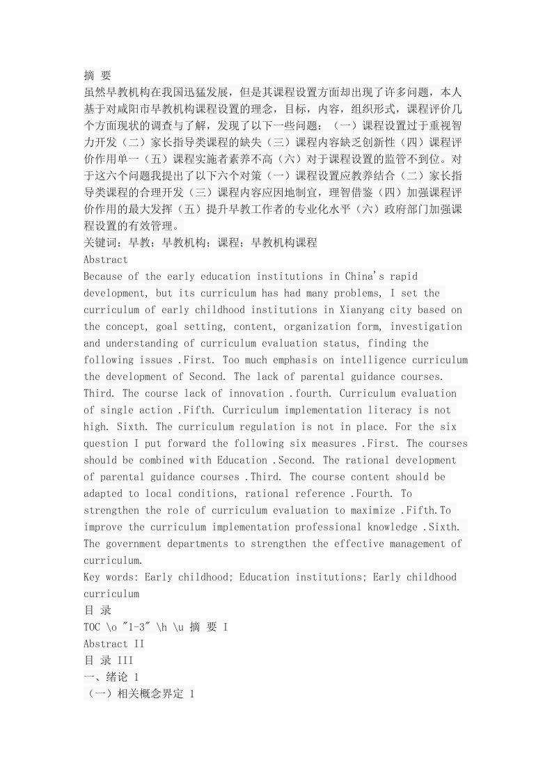 摘要虽然早教机构在我国迅猛发展,但是其课程设置方面却出现了许多问题,本人基于对咸阳市早教机构课程设置的理念,目标,内容,组织形式,课程评价几个方面现状的调查与了解,发现了以下一些问题:(一)课程设置过于重视智力开发(二)家长指导类课程的缺失(三)课程内容缺乏创新性(四)课程评价作用单一(五)课程实施者素养不高(六)对于课程设置的监管不到位。对于这六个问题我提出了以下六个对策(一)课程设置应教养结合(二)家长指导类课程的合理开发(三)课程内容应因地制宜,理智借鉴(四)加强课程评价作用的最大发挥(五)提升早教工作者的专业化水平(六)政府部门加强课程设置的有效管理。关键词:早教;早教机构:课程:早教机构课程AbstractBecause of the early education institutions in China's rapiddevelopment,but its curriculum has had many problems,I set thecurriculum of early childhood institutions in Xianyang city based onthe concept,goal setting,content,organization form,investigationand understanding of curriculum evaluation status,finding thefollowing issues First.Too much emphasis on intelligence curriculumthe development of Second.The lack of parental guidance courses.Third.The course lack of innovation.fourth.Curriculum evaluationof single action Fifth.Curriculum implementation literacy is nothigh.Sixth.The curriculum regulation is not in place.For the sixquestion I put forward the following six measures First.The coursesshould be combined with Education Second.The rational developmentof parental guidance courses Third.The course content should beadapted to local conditions,rational reference Fourth.Tostrengthen the role of curriculum evaluation to maximize.Fifth.Toimprove the curriculum implementation professional knowledge Sixth.The government departments to strengthen the effective management ofcurriculumKey words:Early childhood;Education institutions;Early childhoodcurriculum目录Abstract II目录III一、绪论1(一)相关概念界定11.早教12.早教机构13.课程14.早教机构课程1(二)研究意义和价值11.弥补当前有关早教课程方面的研究缺失。12.为涉及早教课程的人员提供指导。2(三)研究方法21.问卷法22.访谈法23.文献法24.观察法2(四)研究步骤31.准备阶段32.实施阶段33.结题阶段3(五)文献综述3二、咸阳市早教机构课程现状及问题4(一)咸阳市早教机构课程设置的基本情况51.咸阳市早教机构课程设置的理念52.咸阳市早教机构课程设置的目标63.咸阳市早教机构课程设置的内容74.咸阳市早教机构课程组织形式85.咸阳市早教机构课程设置的评价体系8(二)咸阳市早教机构课程设置的问题91.课程设置过于重智力开发92.家长指导类课程的缺失93.课程内容缺乏创新型104.课程评价作用单一105.课程实施者专业素养不高106.对于课程设置监管不到位11三、咸阳市早教机构课程设置的影响因素11(一)社会文化因素对于课程设置的影响11(二)教养人的价值取向对于课程设置的影响12(三)婴幼儿自身的发展特点对于课程设置的影响12四、咸阳市早教机构课程设置问题的对策12(一)课程设置应该教养结合12(二)家长指导类课程的合理开设12(三)课程内容应因地制宜,理智借鉴13(四)加强课程评价作用的最大发挥13(五)提升早教指导者的专业化水平13(六)政府部门加强课程设置的有效监管14结语15参考文献16附件一:关于早教机构课程设置的调查问卷(家长)17附件二:对早教师的访问内容19谢辞20一、绪论(一)相关概念界定1.早教一般指出生后到上小学前所接受到的教育,是根据一定的社会要求对在这个时期孩子的智力,体力,心理进行影响的一种活动若在此阶段及时进行教育,则会事半功倍,收效极佳:反之,忽视早期教育或早期教育不当,儿童心身发展就产生困难,严重者则不能发展,[1]。本篇论文中,我认为早期教育就是指在专门机构中对0-3岁婴儿的智力,体力和情绪进行教养的过程。2.早教机构早教机构就是指为从出生到上小学前的婴幼儿提供教育服务的,促进其体力,智力,心理和谐发展,为婴幼儿家长提供专门育儿知识指导的,具有一定规模,人数,资金,资质的服务场所。3.课程广义的课程是指学校为实现其培养目标,以学校教育人员作为实施者,学生作为接受者,选取能够促进学生德智体全面发展的教学内容以及实施它的进程,主要是各门学科和有目的、有计划的教育活动,狭义的课程是指某一门学科[2]4.早教机构课程通过查阅资料后我发现当前文献资料中几乎没有对早教机构课程的明确定义,所以本人结合对上述关于早教机构和课程概念的理解,对早教机构课程作出如下解释:早教机构课程是指在早教机构中实施的,旨在为家长提供各种育儿服务知识,为帮助0-3岁早期儿童德智体全面发展提供有益经验的各种活动的总和。(二)研究意义和价值如今早教市场极其火爆,而任何一个早教机构的课程设置理念,目标,内容,以及课程的组织与实施,课程的评价都是区别于其他早教机构的独特之处,更是家长所看重之处,也是早教机构立足于市场的重要原因。目前我国早教市场在课程方面的发展仍有欠缺,我的这篇论文将在理论与实践两个方面为早教课程提供指导。