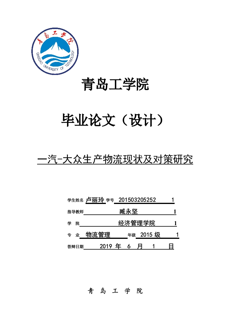 青岛工学院毕业论文(设计)一汽一大众生产物流现状及对策研究学生姓名卢丽玲学号201503205252指导教师学院经济管理学院专业物流管理年级2015级答辩日期2019年6月1青岛工学院完成日期:指导教师签字:评阅教师签字:答辩小组组长签字:答辩小组成员签字:摘要通过数据调查发现,在2018年一汽-大众汽车销售总量突破了205万辆。这些年来,一汽-大众得到了迅猛的发展,而主要得益于一汽-大众自动化生产基地、精益生产和零库存管理。在当前新的汽车市场和一汽-大众自身生产形式下,仍存在着生产过程稳定性低、装配车间入口拥挤、生产线不平衡的问题。与国际知名汽车厂商相比,在生产物流方面有较大提升空间。本文通过对一汽-大众的不足之处进行分析并找出相应的对策方案,并且在节约成本的基础上,尽可能的合理优化和配置资源,促使生产能够持续性、均衡性、以及协调性的进行,以消除制约企业发展的瓶预,使企业发展保持良性循环。关键词:物流;生产物流;一汽-大众I