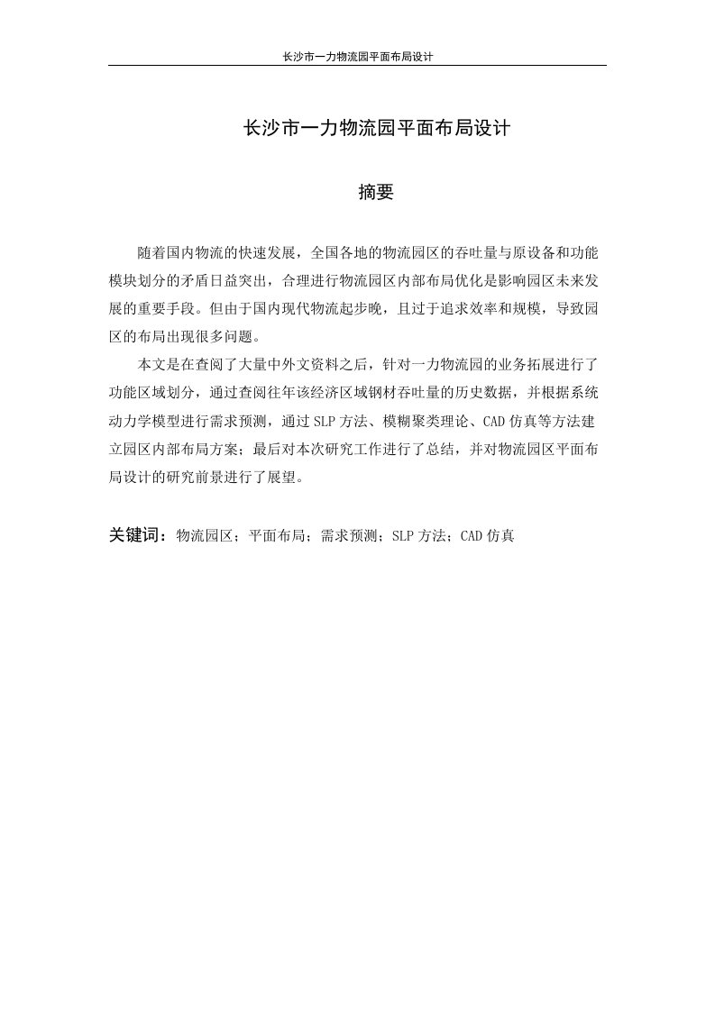 长沙市一力物流园平面布局设计长沙市一力物流园平面布局设计摘要随着国内物流的快速发展,全国各地的物流园区的吞吐量与原设备和功能模块划分的矛盾日益突出,合理进行物流园区内部布局优化是影响园区未来发展的重要手段。但由于国内现代物流起步晚,且过于追求效率和规模,导致园区的布局出现很多问题。本文是在查阅了大量中外文资料之后,针对一力物流园的业务拓展进行了功能区域划分,通过查阅往年该经济区域钢材吞吐量的历史数据,并根据系统动力学模型进行需求预测,通过SLP方法、模糊聚类理论、CAD仿真等方法建立园区内部布局方案:最后对本次研究工作进行了总结,并对物流园区平面布局设计的研究前景进行了展望。关键词:物流园区;平面布局;需求预测;SLP方法:CAD仿真长沙市一力物流园平面布局设计LAYOUT DESIGN OF CHANGSHA YILILOGISTICS PARKABSTRACTWith the rapid development of domestic logistics,the contradiction between thethroughput of logistics parks and the division of the original equipment and functionmodules is becoming more and more prominent in all parts of the country.Therational distribution of the logistics park is an important means to influence the futuredevelopment of the park.However,due to the late start of modern logistics in China,and too much pursuit of efficiency and scale,there are many problems in the layout ofthe park.In this paper,after consulting a large number of Chinese and foreign materials,this paper divides the functional area into the business development of a logistics park.Through consulting the historical data of the steel throughput in the economic regionin the past year,and according to the system dynamics model,the demand forecast ismade,and the methods of SLP,paste clustering and CAD simulation are established.Finally,the research work is summarized,and the prospect of the layout design oflogistics park is prospected.Key words:logistics park;plane layout;demand forecasting;SLP method;CADsimulation.长沙市一力物流园平面布局设计目录1.1设计概要...31.2设计需求...1.3设计依据342.一力物流园周边环境分析..2.1一力物流园介绍56882.2.2一力物流园区需求结构3.一力物流园区适园量预测..·.993.2天心区GDP与货运量预测...103.2.1天心区GDP预测..103.2.2天心区货运量预测...113.3一力物流园适园量分析....124.一力物流园功能区确定和规模测算131314141616265.1一力物流园区各功能区综合关系确定..·26