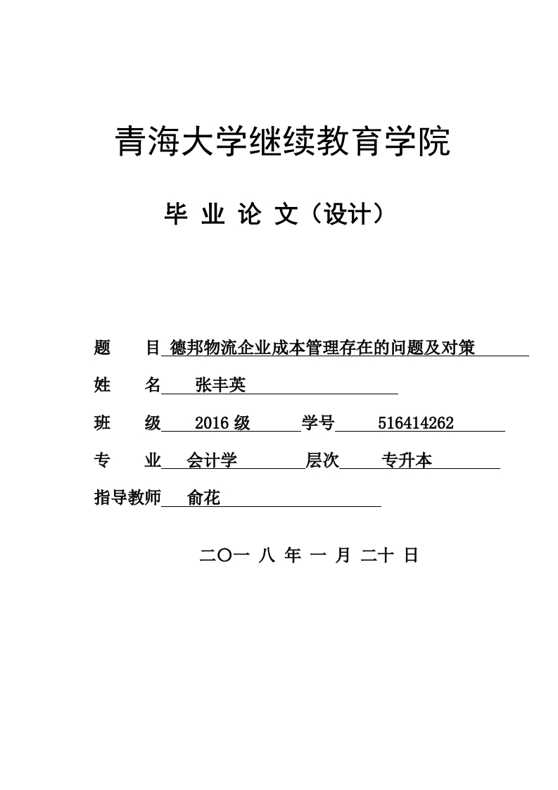 青海大学继续教育学院毕业论文(设计)题目德邦物流企业成本管理存在的问题及对策姓名张丰英班级2016级学号516414262专业会计学层次专升本指导教师俞花二Oー八年一月ニ十日青海大学成人本料毕业(设计)论文:德邦物流企业成本管理存在的问题及对策摘要在当前经济国际化趋势不断加强以及国内经济体制改革的背景下,物流行业发展面临着严峻的外部压力,控制、降低成本是物流行业提供市场占有率的重要途径。同时,在国外大型、成熟物流企业的竞争压力下,国内物流企业如何在市场竞争中突围面临着现实考验。成本管理与控制是企业经营管理的重要内容,通过采取有效措施降低经营服务成本,一方面能够促进整个社会物流成本的降低,另一方面也是物流企业自身良性发展的重要措施。基于此,本文从国内物流企业发展现状出发,在对成本管理与控制内涵进行概述的基础上,明确物流企业成本管理的必要性,并以德邦物流企业为案例对其成本管理与控制中存在的问题进行剖析,进而提出相应建议为该企业成本管理效率的提高提供可借鉴价值。关键词:物流企业:成本管理与控制:问题:对策AbstractUnder the current trend of continuous economic globalization and the reform of the domesticeconomic system,the development of the logistics industry is facing severe extemal pressure.Controllingand reducing costs are important ways for the logistics industry to provide market share.At the same time,under the competitive pressure of foreign large-scale and mature logistics companies,how domesticlogistics companies face the reality test in breaking through the market competition.Cost management andcontrol is an important part of business management.By taking effective measures to reduce businessservice costs,on the one hand,it can promote the reduction of logistics costs in the entire society.On theother hand,it is also an important measure for the healthy development of logistics enterprises.Based onthis,this article starts from the status quo of the development of domestic logistics enterprises,and on thebasis of summarizing the connotation of cost management and control,the necessity of cost management oflogistics companies is clarified,and the existence of Debon logistics companies in their cost managementand control exists.The analysis of the problems,and then put forward corresponding suggestions for thecompany's cost management efficiency to provide reference value.Key words:Logistics company;Cost management and control;Problems;Countermeasures