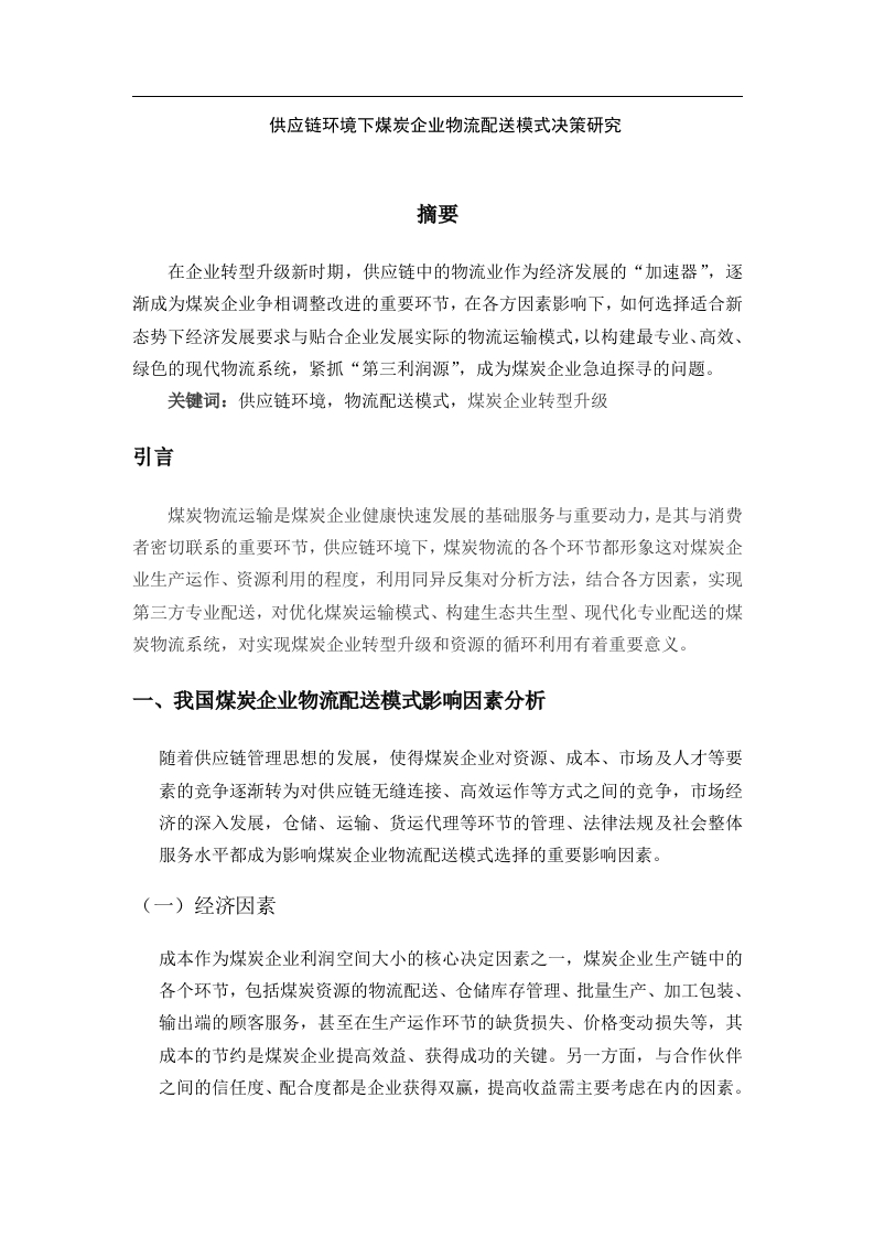 供应链环境下煤炭企业物流配送模式决策研究摘要在企业转型升级新时期,供应链中的物流业作为经济发展的“加速器”,逐渐成为煤炭企业争相调整改进的重要环节,在各方因素影响下,如何选择适合新态势下经济发展要求与贴合企业发展实际的物流运输模式,以构建最专业、高效、绿色的现代物流系统,紧抓“第三利润源”,成为煤炭企业急迫探寻的问题。关键词:供应链环境,物流配送模式,煤炭企业转型升级引言煤炭物流运输是煤炭企业健康快速发展的基础服务与重要动力,是其与消费者密切联系的重要环节,供应链环境下,煤炭物流的各个环节都形象这对煤炭企业生产运作、资源利用的程度,利用同异反集对分析方法,结合各方因素,实现第三方专业配送,对优化煤炭运输模式、构建生态共生型、现代化专业配送的煤炭物流系统,对实现煤炭企业转型升级和资源的循环利用有着重要意义。一、我国煤炭企业物流配送模式影响因素分析随着供应链管理思想的发展,使得煤炭企业对资源、成本、市场及人才等要素的竞争逐渐转为对供应链无缝连接、高效运作等方式之间的竞争,市场经济的深入发展,仓储、运输、货运代理等环节的管理、法律法规及社会整体服务水平都成为影响煤炭企业物流配送模式选择的重要影响因素。(一)经济因素成本作为煤炭企业利润空间大小的核心决定因素之一,煤炭企业生产链中的各个环节,包括煤炭资源的物流配送、仓储库存管理、批量生产、加工包装、输出端的顾客服务,甚至在生产运作环节的缺货损失、价格变动损失等,其成本的节约是煤炭企业提高效益、获得成功的关键。另一方面,与合作伙伴之间的信任度、配合度都是企业获得双赢,提高收益需主要考虑在内的因素。(二)管理因素企业良好的管理是打开行业发展“瓶颈”的重要推动力。故而管理者能否正确认识行业性质、把握企业运作特点,了解产品特性,洞悉顾客需求等管理要素至关重要。煤炭作为日常消费品,其运输环节使供应链上的重要节点,根据企业发展规模的大小、涵盖市场的范围选择合适的物流公司进行合作,能够大大减少物流运输的不专业性导致的利润损失,还可以提高顾客的满意度,提升企业的形象,进而推动企业增强竞争力。当然,对于自营物流配送模式的选择者,部分煤炭企业也可以获得对煤炭供应链上原料采购、生产加工、对外销售和煤炭回收利用的各环节的较强控制力。(三)社会因素我国煤炭资源十分丰富,随着环境友好型社会的创建,政府无力能源型企业的发展提出了经济效益与社会效益兼顾的要求。经济发展新态势下,许多相关法律法规陆续出台,对煤炭企业的发展提出了合理的限制,要求其重视环境保护,打造“绿色物流”。儿煤炭行业的物流水平也受于整个社会物流水平的制约与影响,社会物流中专业物流企业的发展,能够给煤炭企业提供更多高服务、专业化、抗风险能力强的外包业务的选择对象。二、基于各种影响因素的物流配送模式比较SPA(Set Pair Analysis)即集对分析法注重从同异反三层次全面的描述两事物间的关系,能够有效地兼顾所分析事物的同一性与差异性。笔者基于这一方法,并结合煤炭物流的各个影响因素,在复杂的市场环境中,选取了以下三种煤炭企业的物流配送模式加以比较分析。(一)自营物流配送模式自营物流配送对资金的要求很高,它需要建立独立的、专门的物流管理部门、信息处理部门以及库存管理部门等,构成属于自己的物流运输体系,实现煤炭资源的自主配送,故存在一定的管理难度,使得管理水平降低,另一方面,自身进行物流配送也使得运输过程中所造成的损失需自己承担,风险增强。但相对的,自营物流配送模式又有其自身的有事,例如,对生产链上的各个环节控制权也会加强,包括产品的运输装卸、商业机密信息的保密、销售环节的服务水平等,能够与企业的发展战略相符,使煤炭物流配送与企业生产运作更为密切的配合。(二)第三方物流配送模式“第三方“顾名思义,非自身建立专业物流体系,而是将物流的全部配送交于专门的物流企业对消费者进行服务,这种模式能够最大化的实现企业资源的优化组合,降低库存成本与物流风险,使得核心业务的投入更加专注,同时有利于建立与合作伙伴般的告诉新人,使得服务更具专业化、灵活性、多样性,最大程度的提高顾客的消费价值。当然,第三方的物流由于不属于企业内部生产运作的组成部分,受到管理者沟通、工作人员信息传递等因素的影响和限制,煤炭资源和产品的配送会在一定程度上无法保证信息的有效、及时传递,与此同时,企业商业机密泄露的可能性也会因为合作伙伴的原因而增加。(三)共同物流配送模式共同物流配送模式的重点在于选择该模式的煤炭企业需要具有十分强的资金支持与生产运作协调能力,既能够有效地构建属于自己的物流运输配送体系,又能够清楚的认识自身物流发展中的不足之处,并将不完善的部分外包给专门的物流运输企业,实现库存管理成本、物流运输成本的降低与人员管理投入的减少,且有效地保证商业信息不被泄露,增强渠道优势,拓宽市场范围,提高顾客了解度与满意度,获得与其他企业的竞争点。另一方面,由于煤炭企业自身拥有较为完善的物流配送系统,与合作伙伴的信任基础较弱,十分容易产生利益联盟的解体,不能很好