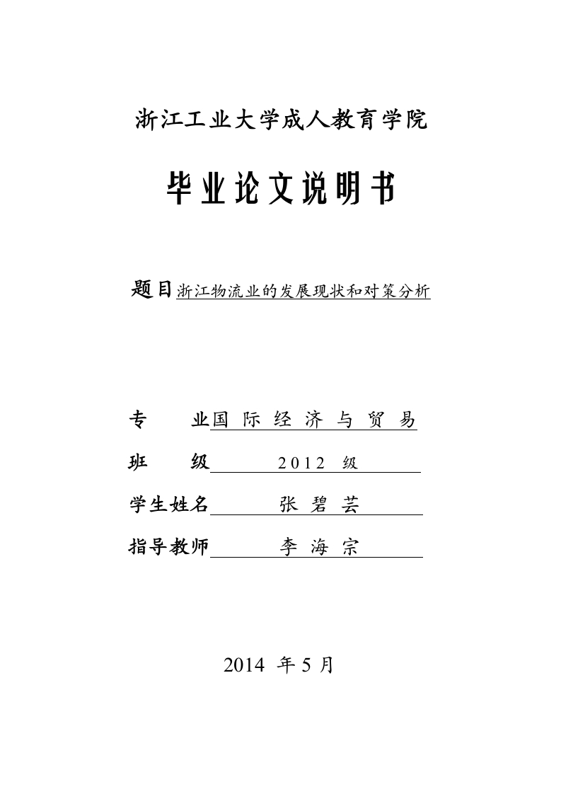 浙江工业大学成人教育学院毕业论文说明书题目浙江物流业的发展现状和对策分析专业国际经济与贸易班级2012级学生姓名张碧芸指导教师李海宗2014年5月摘要浙江省是中国经济发展较为迅速的省份之一。经济发展离不开物流业的发展,目前浙江省物流业增加值和主要港口货物吞吐量稳步增长,但同比增速逐年趋缓,物流成本压力大,外包成为趋势,物流设施初具规模。浙江物流业的发展受限,在于现代物流观念不强,物流政策法规不完善,物流信息化、标准化建设水平低,人才匮乏。因此需针对性地加强统筹规划、完善相关政策法规体系,加强物流基建、加快物流信息化进程,建立人才保障机制、保障现代物流体系可持续发展。【关键词】浙江省;物流业;发展现状;制约因素;对策建议目录一、浙江省物流业发展现状(一)物流业增加值稳步增长.(二)主要港口货物吞吐量稳步增长(三)物流成本压力巨大.(四)物流设施初具规模二、浙江省物流业发展的制约因素分析3(一)现代物流观念不强.3(二)物流政策法规不完普(三)物流市场环境不规范…3(四)物流信息化、标准化建设水平低.(五)物流专业人才匮乏…4三、浙江物流业发展存在问题分析(一)缺乏完普法规政策.(二)管理观念落后….5(三)物流人才培养不重视..................(四)物流基础技术发展落后(五)第三方企业的干扰四、浙江物流业发展的对策建议1完普物流业政策法规体系…2.修订落实现代物流业相关政策.3积极促进制造业与物流业联动发展4.鼓励培育物流企业做大做强5.推进建设重点物流园区.(二)管理观念方面.1.民营物流企业未形成现代物流观念2.加强物流基础设施建设.83.培有自主物流品牌…8(三)人才方面…1建立物流人才保障机制2.重视对物流专业人才的培养83.培养引进高素质物流人才…(四)技术方面…1.加快物流整合和物流技术应用2.物流网络建设.(五)外资第三方物流企业的涌入主要参考文献致谢…