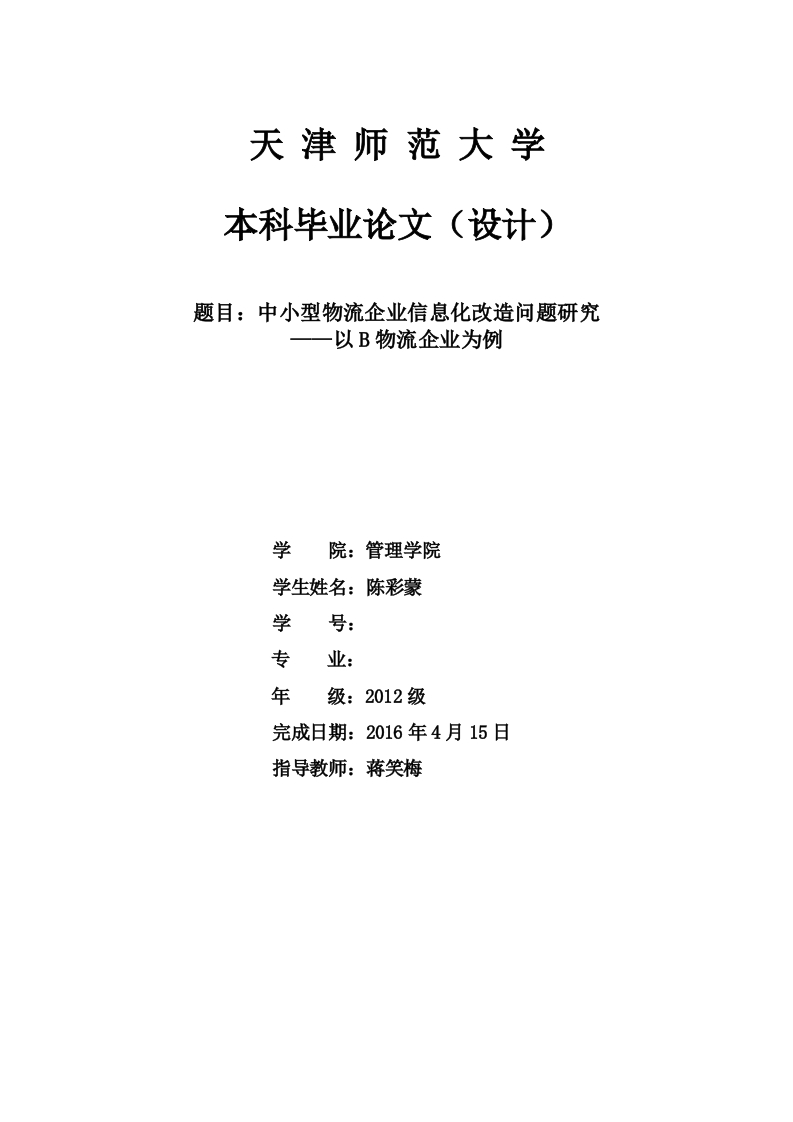 天津师范大学本科毕业论文(设计)题目:中小型物流企业信息化改造问题研究—一以B物流企业为例学院:管理学院学生姓名:陈彩蒙学号:专业年级:2012级完成日期:2016年4月15日指导教师:蒋笑梅中小型物流企业信息化改造问题研究一一以B物流企业为例中小型物流企业信息化改造问题研究以B物流企业为例摘要:信息技术在我国国民经济不断发展及信息化进程加快的现在,对推动企业发展的作用越来越重要。目前信息化已成为现代物流的重要发展趋势,信息技术在物流领域的应用已深化到战略层面,成为各国衡量物流发展水平的重要指标。我国物流产业的信息化起步较晚,总体水平也比较低,其中中小型物流企业的信息化已是我国物流业信息化发展的首要瓶颈。本文以一家典型的中型物流企业一一B物流公司为例,就中小型物流企业信息化改造进行了研究。在本篇论文中,笔者从我国国内中小型物流企业信息化的现状出发,指出我国中小型物流企业信息化存在问题,比如信息化基础比较薄弱、信息化投入比较少、信息系统不晚上以及信息化管理人才缺失和思路混乱。笔者更以B物流企业信息化升级改造方案分析了B物流企业信息化改造中的组织与业务流程重构,并依据其各个阶段的实施过程的出其实施效果,从这里以小见大,提出了对我国中小型物流企业信息化改造的建议,如寻求政府的金融支持、加强物流企业的信息标准化、加快物流信息技术人才的培养与引进、加强物流信息化系统改造和创建物流企业技术环境。笔者希望本篇论文可以对国内中小型物流企业的信息化提供一些借鉴意义。关键词:物流企业:信息化;问题Small and Medium Logistics Enterprise InformationReconstruction-A Case B Logistics EnterprisesABSTRACT:Information technology in the continuous development of ournational economy and information technology to speed up the process now,topromote enterprise development role more important.Currently informationtechnology has become an important trend in the development of modern logistics,中小型物流企业信息化改造问题研究一一以B物流企业为例information technology applications in the field of logistics has been to deepen thestrategic level,an important indicator of countries to measure the level of logisticsdevelopment.Information logistics industry in China started late,the overall level isrelatively low,in which small and medium logistics enterprise information is theprimary bottleneck of China Logistics Information Development.In this paper,atypical medium-sized logistics enterprises--B logistics companies,for example,onsmall and medium logistics enterprise information system has been studied.In this paper,the author from the current situation of the domestic small andmedium sized logistics enterprises in information technology,points out problems ofsmall and medium logistics enterprise information,such as information technologyfoundation is weak,less investment in information technology,information systems,and information is not in the evening Lack of management talent and ideas confusion.I prefer to B logistics enterprise information technology upgrading program analyzesthe B logistics enterprise information system in organization and business processreengineering,and according to its various stages of the implementation process ofthe implementation of its effects,from here to Seeing proposed for our small andmedium sized logistics enterprises in the information technology of therecommendations,such as seeking financial support from the government tostrengthen the standardization of information logistics enterprises,speed up thelogistics information technology,personnel training and the introduction andstrengthening logistics information systems transformation and create a logisticsenterprise technology environments.I hope this paper can be domestic small andmedium logistics enterprise information to provide some reference.Key words:Logistics enterprises;information;problem