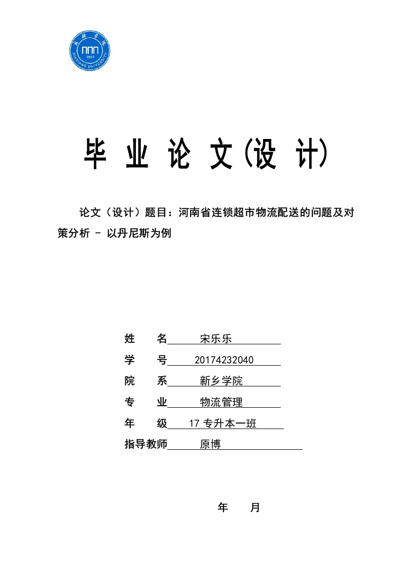 毕业论文(设计)论文(设计)题目:河南省连锁超市物流配送的问题及对策分析一以丹尼斯为例姓名宋乐乐学号20174232040院系新乡学院专业物流管理年级17专升本一班指导教师原博年月新乡学院本科毕业论文(设计)目录3ABSTRACT第一章绪论.5第一节研究背景5第二节研究意义…第三节国内外研究现状.….5一、国外研究现状二、国内研究现状第二节主要研究内容以及研究方法8一、主要研究内容8二、研究方法…8第二章概述.10第一节连锁超市.10第二节物流配送模式…10第三节连锁超市物流配送的特点…11第三章丹尼斯物流配送现状分析12第一节公司简介…第二节丹尼斯连锁超市物流配送模式分析.….12第四章丹尼斯物流配送存在的问题.13第一节退货率居高不下….13第二节配送技巧不足..13第三节库存利用率低.14第四节专业人员缺乏,员工素质低第五章完善丹尼斯物流配送相关问题建议…15第一节减少退货率…15第二节提高信息化和现代化水平第三节提高库存利用率.15新乡学院本科毕业论文(设计)第四节提高丹尼斯连锁超市物流配送人员业务素养.16一、建立有效的选人、用人、留人机制…16二、建立务实的员工统一培训制度16三、建立科学的绩效评价系统.16四、建立合理的薪酬体系17总结…参考文献致谢.2