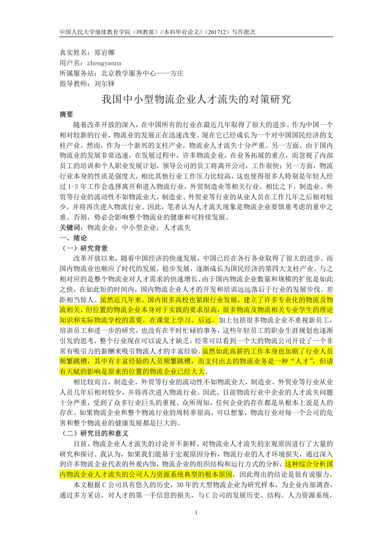 中国人民大学继续教有学院(网教部)∥本科毕业论文∥(201712)写作批次真实姓名:郑岩娜用户名:zhengyanna所属服务站:北京教学服务中心一一方庄指导教师:刘尔铎我国中小型物流企业人才流失的对策研究摘要随着改革开放的深入,在中国所有的行业在最近几年取得了很大的进步。作为中国一个相对较新的行业,物流业的发展正在迅速改变。现在它己经成长为一个对中国国民经济的支柱产业。然而,作为一个新兴的支柱产业,物流业人才流失十分严重。另一方面,由于国内物流业的发展非常迅速,在发展过程中,许多物流企业,在业务拓展的重点,而忽视了内部员工的培训和个人职业发展计划,领导公司的员工将离开公司,工作很快:另一方面,物流行业本身的性质是强度大,相比其他行业工作压力比较高,这也使得很多人特别是年轻人经过1-3年工作会选择离开和进入物流行业,外贸制造业等相关行业。相比之下,制造业、外贸等行业的流动性不如物流业大,制造业、外贸业等行业的从业人员在工作几年之后相对较少,并将再次进入物流行业。因此,笔者认为人才流失现象是物流企业要慎重考虑的重中之重。否则,势必会影响整个物流业的健康和可持续发展。关键词:物流企业:中小型企业:人才流失一、绪论(一)研究背景改革开放以来,随着中国经济的快速发展,中国已经在各行各业取得了很大的进步。而国内物流业也顺应了时代的发展,稳步发展,逐渐成长为国民经济的第四大支柱产业。与之相对应的是整个物流业对人才需求的快速增长。由于国内物流企业数量和规模的扩张是如此之快,在如此短的时间内,国内物流企业人才的开发和培训远远落后于行业的发展步伐。差距相当惊人。虽然近几年来,国内很多高校也紧跟行业发展,建立了许多专业化的物流及物流相关,但位置的物流企业本身对于实践的要求很高,很多物流及物流相关专业学生的理论知识和实际物流学校的需要,在课堂上学习。后远,加上包括很多物流企业不重视新员工,培训员工和进一步的研究,也没有在平时忙碌的事务,这些年轻员工的职业生涯规划也逐渐引发的思考,整个行业现在可以说人才缺乏,经常可以看到一个大的物流公司开设了一个非常有吸引力的薪酬来吸引物流人才的丰富经验。虽然如此高薪的工作本身也加剧了行业人员频繁跳槽,其中有丰富经验的人员频繁跳槽,而支付出去的物流业务是一种“人才”,但请有天赋的影响是原来的位置的物流企业己经大大。相比较而言,制造业、外贸等行业的流动性不如物流业大,制造业、外贸业等行业从业人员几年后相对较少,并将再次进入物流行业。因此,目前物流行业中企业的人才流失问题十分严重,受到了众多行业巨头的重视。众所周知,任何企业的存在都是从根本上说是人的存在。如果物流企业和整个物流行业的周转率很高,可以想象,物流行业对每一个公司的危害和整个物流业的健康发展都是巨大的(二)研究目的和意义目前,物流企业人才流失的讨论并不新鲜。对物流业人才流失的宏观原因进行了大量的研究和探讨。我认为,如果我们能基于宏观原因分析,物流行业的人才环境损失,通过深入到许多物流企业代表的外观内饰,物流企业的组织结构和运行方式的分析,这种综合分析国内物流企业人才流失的公司人力资源系统典型的根本原因,因此得出的结论是很有说服力。本文根据C公司具有悠久的历史,30年的大型物流企业为研究样本,为企业内部调查,通过多方采访,对人才的第一手信总的损失,与C公司的发展历史、结构、人力资源系统,中国人民大学继续教有学院(网教部)∥本科毕业论文∥(201712)写作批次及时掌握公司的大脑排水管位于核心问题,其次是一套完善的人才保留计划系统的设计与实现系统,以确保公司在未来降低人才流失率。最终期望有利于国民经济的支柱产业物流业的健康有序发展。二、对中国物流业的发展和物流企业人才流失分析(一)对中国物流业的发展现状根据2011个数据的毕马威,著名的咨询公司,物流业在中国每100元GDP18元。物流业所占比重如此之大。据国家发改委统计,1~2011年10月,社会物流总费用为6兆4000亿元,同比增长18.7%。增长趋势预计将持续很长时间。改革开放以来,中国的物流企业发展有国有企业、民营企业的垄断,在鼎立的野蛮生长的三个阶段,国有民营企业现状。改革开放初期,随着对外开放程度的逐步提高,物流业也迎来了蓬勃发展的活力。交通运输和海上运输等物流龙头企业,是在国家交通部有关部门的基础上建立起来的。最早成立的几家中国的物流企业基本都是中央国有企业,属于行业中的垄断地位,该公司刚刚完成一些必要的物流运输功能,由于缺乏竞争,经营效率相对较低,但不可否认的是,他们承担着许多国家级运输任务。随着改革开放的进一步深入,国内的物流市场开始对一些民营企业开放,民营企业的效率和客户服务意识使国有物流企业早期尤其是第三方物流企业开始感受到竞争的压力,追求与生俱来的,在这一时期,中国进入了改革后,开放的黄金发展期,制造业的繁荣带动了物流业的快速增长迅速,由于物流服务需求市场,民营物流企业的发展也可以用来形容野蛮生长阶段比,国有物流公司也出现了市场份额再次下降,这一阶段的步伐是国有物流企业己经开始进入市场阶段。最后,随着外资物流企业的进