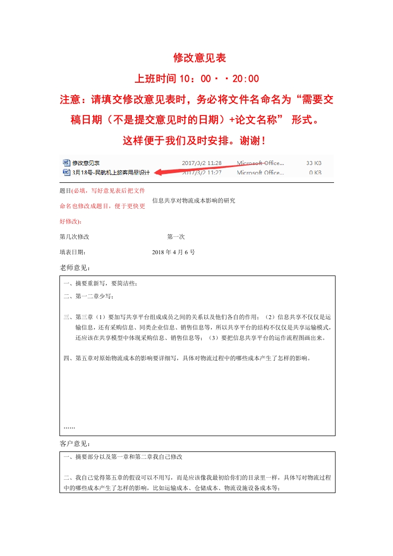 修改意见表上班时间10:00··20:00注意:请填交修改意见表时,务必将文件名命名为“需要交稿日期(不是提交意见时的日期)+论文名称”形式。这样便于我们及时安排。谢谢!2017/3/211:28Microseft-Office...则3月18号-民航机上旅客用品设计趣目(必填,写好意见表后把文件信息共享对物流成本彩响的研究命名也修改成题目,便于更快更好修改):第几次修改第一次填表日期:2018年4月6号老师意见:一、摘要重新写,要简洁些:二、第一二章少写:三、第三章(1)要加写共享平台组成成员之间的关系以及他们各自的作用:(2)信息共享不仅仅是运输信息,还有采购信息、同类企业信息、销售信息等,所以共享平台的结构不仅仅是共享运输模式,还应该在共享模型中体现采购信息、销售信息等:(3)要把信息共享平台的运作流程图画出来。四、第五章对原始物流成本的彩响要详细写,具体对物流过程中的哪些成本产生了怎样的影响。客户意见:一、摘要部分以及第一章和第二章我自己修改二、我自己觉得第五章的假设可以不用写,而是应该像我最初给你们的目录里一样,具体写对物流过程中的哪些成本产生了怎样的影响,比如运输成本、仓储成本、物流设施设备成本等:三、麻烦根据老师给的意见认真修改,因为初稿你们花了两天不到的时间写好,拿到之后,我看了,句子之间有的衔接不上,还有的就完全不符合文章内容的就直接粘贴过来了,我自己进行了小小的修改,然后才上传的,现在麻烦代写老师根据我自己论文老师的意见仔细修改,谢谢。改稿日期要求交稿日期:2018年4月9号补充意见:我的论文题目是“信息共享对物流成本影响的研究”,4月9号晚上我需要上传,麻烦4月9号晚上六点前给我修改须知:1.因修改需要根据意见查阅相关资料,修改论文内容一般四天左右,毕业论文旺季时间需五天左右,格式小问题可以加快,硕士博士毕业论文内容一周左右,如需要加急修改,请和客服详谈。2笼统的意见,恕不修改。您要说出详细修改的意见哦,否则我们也不清楚您的想法。2.请不要将意见一点一点的提出来,请全部整理好以后,一次性发给我们,单独的意见不予受理。3.在与初衷无明显出入、不改变题目、文章整体思路和大框架的前提下,免费修改。换题目、大修改视为重写,不予免费。4.凡在成文后换题、追加、细化写作要求,属买家本身的责任,恕不免费修改,敬请谅解。