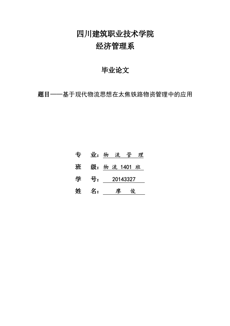四川建筑职业技术学院经济管理系毕业论文题目一一基于现代物流思想在太焦铁路物资管理中的应用专业:物流管理班级:物流1401班学20143327姓名:廖俊【摘要】物质资源的管理对企业的各项工作能够按期完成、成本是否合理和经济效益的高低有着至关重要的作用。从这个程度上来说,作为建筑管理企业行为的物资管理工作,不仅仅是建筑管理企业物资部门的专业管理,同时还应该是企业的决策领导所关注的项目。需要各个岗位的员工共同的努力与监管才能有效的构件现代化的物资管理。本文论述了现代化的物流思想和物资管理理论,并对太焦铁路中的物资管理的现状和供应链的特征及要求进行了分析,提出了相应的意见。【关键词】:建筑企业,物资管理,现代物流,供应链及库存目录11.1现代物流的基本概念和理论....2太焦铁路物资管理现状及存在问题.·2.1太焦铁路物资管理的现状....22.2物资管理存在的问题..34总结6