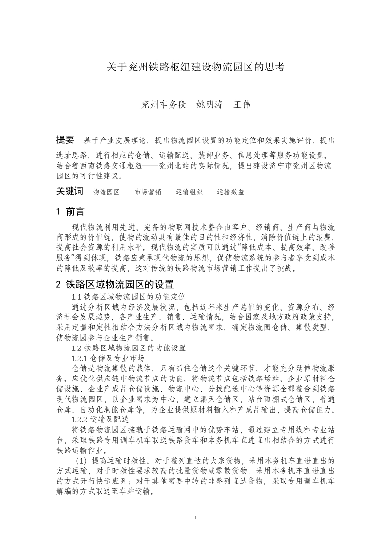 关于兖州铁路枢纽建设物流园区的思考兖州车务段姚明涛王伟提要基于产业发展理论,提出物流园区设置的功能定位和效果实施评价,提出选址思路,进行相应的仓储、运输配送、装卸业务、信息处理等服务功能设置。结合鲁西南铁路交通枢纽一兖州北站的实际情况,提出建设济宁市兖州区物流园区的可行性建议。关键词物流园区市场营销运输组织运输效益1前言现代物流利用先进、完备的物联网技术整合由客户、经销商、生产商与物流商形成的价值链,使物的流动具有最佳的目的性和经济性,消除价值链上的浪费,提高社会资源的利用水平。现代物流的实质可以通过“降低成本、提高效率、改善服务”得到体现,铁路应秉承现代物流的思想,促使物流系统的参与者享受到成本的降低及效率的提高,这对传统的铁路物流市场营销工作提出了挑战。2铁路区域物流园区的设置1.1铁路区域物流园区的功能定位通过分析区域内经济发展状况,包括近年来生产总值的变化、资源分布、经济社会发展趋势,各产业生产、销售、运输情况,结合国家及地方政府政策支持,采用定量和定性相结合方法分析区域内物流需求,确定物流园仓储、集散类型,使物流园参与企业生产销售。1.2铁路区域物流园区的功能设置1.2.1仓储及专业市场仓储是物流集散的载体,只有抓住仓储这个关键环节,才能充分延伸物流服务。应优化供应链中物流节点的功能,将物流节点包括铁路场站、企业原材料仓储设施、企业产成品仓储设施、物流中心、分拨配送中心等资源全部整合到铁路现代物流园区,以企业需求为中心,建立漏天仓储区,站台雨棚式仓储区,普通仓库、自动化职能仓库等,为企业提供原材料输入和产成品输出,提高仓储能力。1.2.2运输及配送将铁路物流园区接轨于铁路运输网中的优势车站,通过建立专用线和专业站台,采取铁路专用调车机车取送铁路货车和本务机车直进直出相结合的方式进行铁路运输作业。(1)提高运输时效性。对于整列直达的大宗货物,采用本务机车直进直出的方式运输,对于时效性要求较高的批量货物或零散货物,采用本务机车直进直出的方式开行快运班列;对于其他需要中转的非整列直达货物,采取专用调车机车解编的方式取送至车站运输。(2)满足配送需求。采取物流总包、组建汽车运输车队、接取送达服务队等形式,开展铁路运输以外的短途运输业务,如生产配送、商超配送、电商配送、区域分拨等。1.2.3装卸业务根据物流需求合理配备一定数量的集装箱门吊、集装箱正面吊、装载机、叉车、集装笼、输送机等装卸机具,整合铁路专业装卸人员资源,组建专业装卸队伍,提供专业包装业务,大力发展集装化物流。借助集装箱和企业自备箱的优势,开展铁路、公路、水路多式联运,托盘、集装笼在园区或随车循环使用,提高集装化水平和作业效率1.2.4信息化服务借助互联网的信息集成和共享功能,建立集“价格指数平台、供需信息平台、电子交易平台、物流信息平台、物流园生产信息平台、综合信息平台”于一体的物流园综合信息平台,链接“全国物流信息网”和“中国铁路95306网?对外设门户网站,研发手机APP客服平台。物流园综合信息平台贯穿整个供应链过程,集市场信息、商品交易、运输组织、仓储配送及配套功能于一体,高效运转,集约管理。1.3运作模式铁路运输部门作为运营主体,对园区进行统一管理运营。铁路部门对客户实行物流总包,从运输、装卸、仓储到配送的全过程服务均有铁路部门统一负责。实现供应链始端客户到终端客户的全程物流服务。铁路部门建立运输车队或引入第三方物流企业合作,或者二者相结合的方式开展公路运输和短途配送业务;装卸、搬运业务由铁路部门总包或租赁的装卸机具完成铁路与港口、口岸合作,争取地方政府的支持,引入银行保险等企业未客户提供金融、保险业务。3物流园区效果评价物流业与农业、工业及服务业的关联紧密,对区域国民经济和社会发展的辐射作用巨大,物流业已经成为关乎国民经济健康发展的战略性新兴产业。可以从产业环境、产业能力、产业绩效三个维度评价物流园区的经营效果。3.1产业环境分为硬件环境和软件环境。重点涉及基础设施、人力保障和资本供给等基本环境条件,基础设施包括铁路公路线路里程、港口吞吐能力等;人力保障和资本供给包括人力资源的投入水平和投入力度,物流业固定资产的投资额和投资力度。3.2产业能力包括产业规模、产业发展能力2个方面。产业规模是产业能力和发展水平的基本特征,可以根据物流业产值、货运业务量和货物周转量3个指标体现。物流业产值代表物流业产出价值的规模大小。产业发展能力是指产业在生存的基础上不断扩大积累而形成的发展潜能。根据物流业投资增长能力、货物运输增长能力和货物周转增长能力3个指标反映。3.3产业绩效产业绩效是在一定投入的约束下,产业在一定时期内生产经营活动的最终成果及其对经济社会发展的贡献,集中反映产业的投入产出效率。体现在产出水平、产出效应和产业贡献方面,主要包括产品价值、产值增长率、人均创造产值、单位产值流通额等。4济宁市兖州区建设物流园区的构想3.1充州北站货运概况3.1.1货场兖州北站货场面积18万m2,货物仓库8座,地面硬化面积12万m2,仓库(含货棚)面积1.18万m2。办理