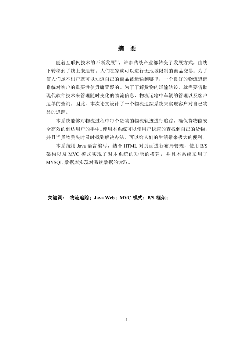 摘要随着互联网技术的不断发展,许多传统产业都转变了发展方式,由线下转移到了线上来运营。人们在家就可以进行无地域限制的商品交易。为了使人们足不出户就可以知道自己的商品被运输到哪里,一个良好的物流追踪系统对客户的重要性使毋庸置疑的。为了了解货物的运输轨迹,就需要借助现代软件技术来管理随时变化的物流信息,物流运输中车辆的管理以及客户运单的查询。因此,本次论文设计了一个物流追踪系统来实现客户对自己物品的追踪。本系统能够对物流过程中每个货物的物流轨迹进行追踪,确保货物能安全高效的到达用户的手中。使用本系统可以使用户快速的查找到自己的货物,并且当货物丢失时及时找到解决办法,可以给人们的生活带来极大的便利。本系统用Java语言编写,结合HTML对页面进行布局管理,使用B/S架构以及MVC模式实现了对本系统的功能的搭建,并且本系统采用了MYSQL数据库实现对系统数据的读取。关键词:物流追踪;Java Web;MVC模式;B/S框架;AbstractWith the continuous development of Internet technology,many traditional industries have changed the development mode,from offline to online operation.People can trade goods at home without geographical restrictions.In order to make people know where their goods are transported without leaving home,the importance of a good logistics tracking system to customers is beyond doubt.In order to understand the transportation track of goods,we need to use modern software technology to manage the changing logistics information at any time,the management ofvehicles in the logistics transportation and the query of customers'waybills.Therefore,this paper designs a logistics tracking system to achieve customer trackingof their own goods.The system can track the logistics track of each goods in the logistics process,to ensure that the goods can reach the user's hands safely and efficiently.Using this system,users can quickly find their own goods,and find solutions in time whenthe goods are lost,which can bring great convenience to people's life.The system is written in Java language,combined with HTML to manage thelayout of the page,uses B/S architecture and MVC mode to build the function ofthe system,and uses MYSQL database to read the system data.Key Words:Keywords logistics tracking;Java Web;MVC mode;B/S framework;目录摘要Abstract…第1章绪论…51.1系统开发背景…1.2系统的国内外研究历史与现状1.3系统开发技术介绍.61.3.1JS技术1.3.2 MYSQL数据库系统61.4系统开发的意义….61.5本文的结构安排第2章系统分析2.1系统需求分析…82.2系统功能分析.…92.3系统可行性分析..102.3.1经济可行性102.3.2技术可行性.….102.3.3操作可行性.2.3.4法律可行性…第3章系统设计…3.1系统架构与设计模式113.1.1B/S系统架构3.1.2MVC设计模式3.2系统功能模块设计….113.3系统数据库的设计…123.3.1数据库实体…123.3.2数据库概念设计….133.3.3数据库逻辑结构设计第4章系统的实现…224.1系统设置.224.2客户服务244.3仓库管理274.4综合查询.29