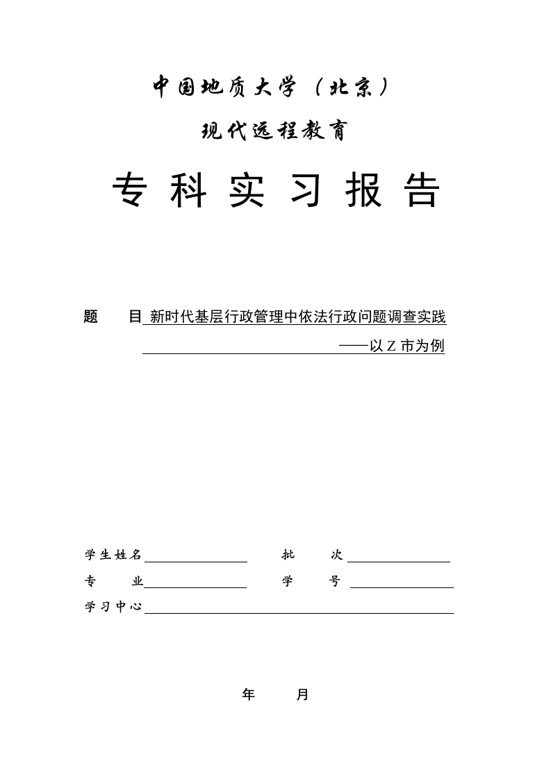 中国地质大学(北京)现代远程教育专科实习报告题目新时代基层行政管理中依法行政问题调查实践一以Z市为例学生姓名批次专业学号学习中心年月摘要健康的行政沟通对政府职能的顺利行使大有裨益。行政沟通高效或低效,会直接关系到政策信息上传和发布的高效或低效。不仅如此,公众是否可以顺利地表达自己的利益和需要也与行政沟通的效果有着密不可分的联系。认为行政沟通障碍被妥善处理掉的程度是决定政府行政效率的一个关键因素,这一想法是正确的。本文主要论述了行政沟通的广泛意义,即行政部门与外部环境之间的相关政策建议的制定和实施。政策之所以能比较有效地实施并促使社会进程有序发展,靠的是影响、协调、交流和意见反馈。行政沟通的各种需求,存在于地方政府每日的行政管理活动中。但是,由于我国当前经济水平的快速发展,地方政府的行政沟通存在着一些障碍,如信息失真、信息不对称、组织结构不合理等。为了解决上述问题,本文以Z市为例进行探究,出相应的策略,即要完善行政组织体系,实现行政传播媒体和信息的多元化,加强电子政务建设和其他解决办法。【关键词】:依法行政;行政执法;监督机制1绪论1.1研究背景及意义根据古今中外的经验,要成为一个富裕民主的国家,首先要成为法治化的国家:要成为一个自由平等的社会,首先要成为法治化的社会:要成为一个诚实友善的政府,首先要成为一个法治化的政府。以此,法律是一个的重中之重,要建设成社会主义的现代化社会就必须坚持依法治国。但是,在这个严肃的情况下,许多执法人员在工作过程中无视国家法律法规,徇私舞弊,违法执法。这种情况违背了依法执政的理念。在此情况下,长此以往,会伤害人民群众的切身利益,会造成政府部门的失信于民,导致政府公信力下降。所以,依法治国是不可违背的国家制度。1.2研究内容及方法本文是对基层政府部门依法行政过程中出现的问题进行的探究,以Z市为例进行分析。文章主要采用了文献资料法以及案例分析法两种研究方法,在查阅相关资料的基础上,了解依法行政的相关理论,为后文的研究莫定了理论基础:另外,采用案例分析的方法,以Z市为例进行分析,使文章更加具有说服力。2依法行政的内涵及必要性分析2.1依法行政的内涵依法行政是依法治国基本方略的重要内容,是指行政机关必须根据法律法规的规定设立,并依法取得和行使其行政权力,对其行政行为的后果承担相应的责任的原则。。其中包括三项要求:首先,行政机关的权利必须由法律规定,这是依法行政的先决条件:其次,行政机关在行使权利时必须要依据法律法规,既不能违反实体规则也不能违反程序规则,这是依法行政的关键所在:最后,依法行政是依法治国基本方略的重要内容,是指行政机关必须根据法律法规的规定设立,并依法取得和行使其行政权力,对其行政行为的后果承担相应的责任的原则。2.2我国依法行政的必要性随着人们对依法治国的认识不断深刻。现代政府也不断改变着对社会的管理方式,让管理方式更加符合时代,可以说,这是现代政府对管理方式的一次革命。随着依法治国政策的不断落实,依法行政的步伐也越走越快,方针政策在我国的不断的实行和不断落实,在此情况下,长此以往,不仅有利于提高政府公信力,让人民群众更加拥戴政府,还利于保护人民群众的财产安全和政治权利,而且依法行政的实施也对我国大力推进政府职能的转变和行政管理体制的改革有重要的现实意义,同时也必将对经济、社会、文化和生态的全面协调发展产生重大促进作用。第一,依法行政是依法治国政策的重要组成部分。为了实现小康社会,为了社会的长治久安,促进经济的发展。用法律来衡量一切行为,约束社会的歪风邪气,使得国家快速,安全的发展变得十分重要,所以执法治国就是我们应该长久坚持的国家政策。一个国家没有完善的法律,就无法在动乱的现在长久存在,所以,只有坚持行政,才是正确的治国之道。第二,依法行政是保护人民群众的个人财产不被侵袭和保护人民群众的合法权利的必要条件,依法行政决定了法律与行政的关系,重点强调的是行政服从意识和尊从法律的意识,但它的实际意义是保护普通群众和其他人员的既得利益。