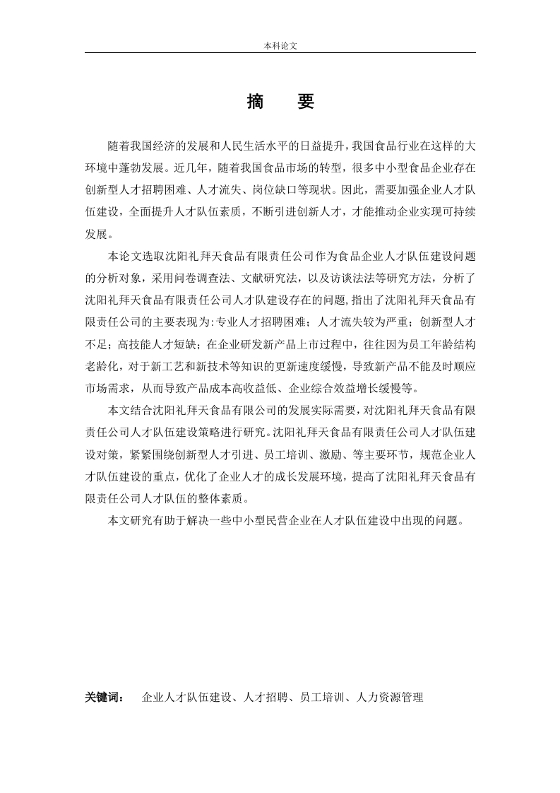本科论文摘要随着我国经济的发展和人民生活水平的日益提升,我国食品行业在这样的大环境中蓬勃发展。近几年,随着我国食品市场的转型,很多中小型食品企业存在创新型人才招聘困难、人才流失、岗位缺口等现状。因此,需要加强企业人才队伍建设,全面提升人才队伍素质,不断引进创新人才,才能推动企业实现可持续发展。本论文选取沈阳礼拜天食品有限责任公司作为食品企业人才队伍建设问题的分析对象,采用问卷调查法、文献研究法,以及访谈法法等研究方法,分析了沈阳礼拜天食品有限责任公司人才队建设存在的问题,指出了沈阳礼拜天食品有限责任公司的主要表现为:专业人才招聘困难:人才流失较为严重:创新型人才不足:高技能人才短缺:在企业研发新产品上市过程中,往往因为员工年龄结构老龄化,对于新工艺和新技术等知识的更新速度缓慢,导致新产品不能及时顺应市场需求,从而导致产品成本高收益低、企业综合效益增长缓慢等。本文结合沈阳礼拜天食品有限公司的发展实际需要,对沈阳礼拜天食品有限责任公司人才队伍建设策略进行研究。沈阳礼拜天食品有限责任公司人才队伍建设对策,紧紧围绕创新型人才引进、员工培训、激励、等主要环节,规范企业人才队伍建设的重点,优化了企业人才的成长发展环境,提高了沈阳礼拜天食品有限责任公司人才队伍的整体素质。本文研究有助于解决一些中小型民营企业在人才队伍建设中出现的问题。关键词:企业人才队伍建设、人才招聘、员工培训、人力资源管理本科论文AbstractWith the development of China's economy and the improvement of people'sliving standard,China's food industry is booming in this environment.In recent years,with the transformation of China's food market,many small and medium-sized foodenterprises have difficulties in recruiting innovative talents,brain drain and jobgap.Therefore,it is necessary to strengthen the construction of talent team,comprehensively improve the quality of talent team,and constantly introduceinnovative talents,so as to promote the sustainable development of enterprises.This paper takes Shenyang Sunday Food co.,LTD.as the analysis object offood enterprise talent team construction problems,using questionnaire,literaturestudy,research methods of observation and interview method,analyzes the ShenyangSunday food co.,LTD.The problems existing in the talent team construction,pointsout the Shenyang Sunday food co.,LTD.The main performance is:professional talentrecruitment difficulties;The brain drain is serious;Lack of innovative talents;Ashortage of highly skilled people;In the process of launching new products,it is oftenbecause of the aging age structure of employees and the slow updating speed of theknowledge of new processes and new technologies that new products fail to meet themarket demand in time,which leads to high product cost and low revenue and slowgrowth of comprehensive benefits.Based on the development practice of Shenyang Sunday food co.,LTD.,thispaper studies the talent team construction strategy of Shenyang Sunday food co.,LTD.Food co.,LTD.Shenyang Sunday talent team construction countermeasures,closely around the innovative talents,staff training,motivation,such as the main link,standardize the focus of the enterprise talent team construction,to optimize thegrowth of the enterprise talent development environment,improve the ShenyangSunday food co.,LTD.The overall quality of the contingent of talent.Key words:Enterprise talent team building;Recruitment;staff training;humanresources management本科论文目录摘Abstract.........第1章绪论1.1研究背景及目的...1.1.1研究背景....1.1.2研究目的...21.2国内外研究现状..1.2.1国外研究现状21.2.2国内研究现状..31.3研究内容与研究框架.41.3.1研究内容...41.3.2研究框架....61.4研究思路与方法..7(1)文献研究法。。。7(2)调查研究法...7(3)访谈法..7第2章相关概念和理论..·882.2人才激励理论..91011第3章现状及存在问题.·1212123.3人才队伍建设存在问题..143.3.1企业缺乏对员工合理的人力资源规划..........143.3.2企业内部人才培训体系不完善.…·143.3.3企业青年人才数量短缺,员工年龄结构偏大..15