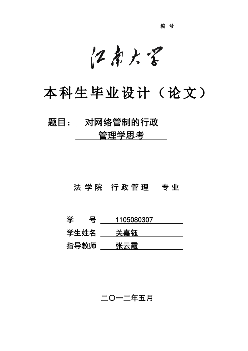 编号本科生毕业设计(论文)题目:对网络管制的行政管理学思考法学院行政管理专业学号1105080307学生姓名关嘉钰指导教师张云霞二O一二年五月对网络管制的行政管理学思考摘要随着信息技术与互联网的快速发展,网络对公众的影响力不断增强。互联网以其便捷、高效的信息传播速度为人们带来便利的同时,也使负面信息的传播更为广泛。由于人们在互联网上可以高效地进行信息的交流与沟通,网络已经成为舆情多发地,只有政府对网络管制适当,才不会激发群体事件,才能促进社会的稳定。如何对网络进行有效的管制成为我国政府急需解决的问题,在新形势下,政府网络管制势在必行,但是我国政府在网络管制中存在一些问题,由于监管机构众多,责任不明确;网络管制立法的实用性有待提高:网络管理方式过于强硬,有失科学等问题影响了网络管理的效果。网络管理是一项事关全局的大事,需要全社会、各部门加强协调,共同努力,加强网络管制要与时俱进,不断创新管制方法。政府要意识到网络舆情管理的重要性,完善良网络管理的立法与方式,从思想源头上进行网络管理,努力形成正气上扬的舆论氛围,从而使网络真正成为社情民意的直通车,为和谐社会建设发挥应有的作用。关键词:网络管制:行政管理学:以人为本:对策江南大学学士学位论文ABSTRACTWith the rapid development of IT and the Internet,the Internet is its convenient,efficientinformation propagation speed is convenient,but also the spread of negative information morewidely.Efficiently on the Internet for the exchange of information and communication,thenetwork has become the public opinion of multiple,only the government is appropriate fornetwork control,does not inspire mass incidents in order to promote social stability.Howeffective control over the network to become an urgent problem of our government,in the newsituation,the government network control is imperative,but our government there are someproblems in the network control,influence the effect of network management,I think that thestrengthening of networks control to be progressive and innovative control methodsWith the rapid development of the Internet,the network of public influence is growing.Networkmanagement is a matter of the overall situation of the whole society,the various departments tostrengthen coordination and joint efforts.Government to be aware of the importance of Internetpublic opinion management,network management,efforts to form public opinion atmosphere ofrighteousness rising from the ideological source,allowing the network to truly become a societyand public opinion of the train,and play its due role for the building of a harmonious society.Keywords:Network control:Administrative Sciences:People-oriented:Countermeasure