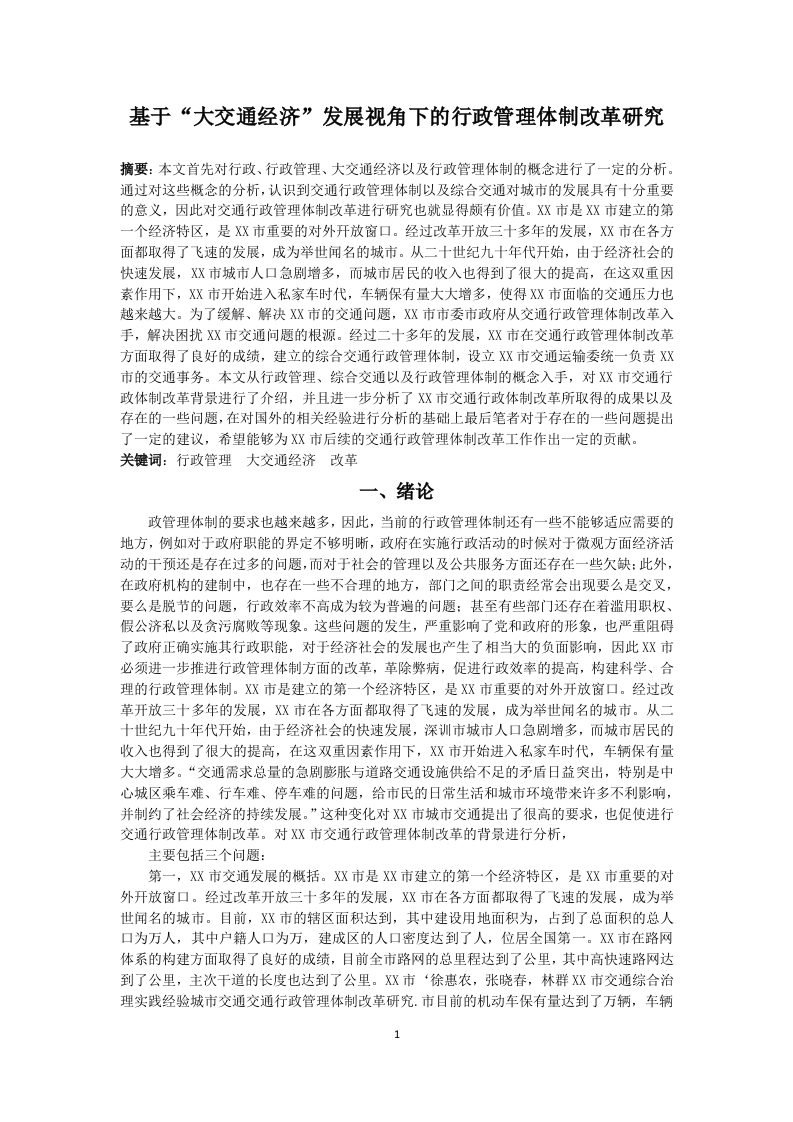 基于“大交通经济”发展视角下的行政管理体制改革研究摘要:本文首先对行政、行政管理、大交通经济以及行政管理体制的概念进行了一定的分析。通过对这些概念的分析,认识到交通行政管理体制以及综合交通对城市的发展具有十分重要的意义,因此对交通行政管理体制改革进行研究也就显得颜有价值。XX市是XX市建立的第一个经济特区,是XX市重要的对外开放窗口。经过改革开放三十多年的发展,XX市在各方面都取得了飞速的发展,成为举世闻名的城市。从二十世纪九十年代开始,由于经济社会的快速发展,XX市城市人口急剧增多,而城市居民的收入也得到了很大的提高,在这双重因素作用下,XX市开始进入私家车时代,车辆保有量大大增多,使得XX市面临的交通压力也越来越大。为了缓解、解决XX市的交通问题,XX市市委市政府从交通行政管理体制改革入手,解决困扰XX市交通问题的根源。经过二十多年的发展,XX市在交通行政管理体制改革方面取得了良好的成绩,建立的综合交通行政管理体制,设立XX市交通运输委统一负责XX市的交通事务。本文从行政管理、综合交通以及行政管理体制的概念入手,对XX市交通行政体制改革背景进行了介绍,并且进一步分析了XX市交通行政体制改革所取得的成果以及存在的一些问题,在对国外的相关经验进行分析的基础上最后笔者对于存在的一些问题提出了一定的建议,希望能够为XX市后续的交通行政管理体制改革工作作出一定的贡献。关键词:行政管理大交通经济改革一、绪论政管理体制的要求也越来越多,因此,当前的行政管理体制还有一些不能够适应需要的地方,例如对于政府职能的界定不够明晰,政府在实施行政活动的时候对于微观方面经济活动的干预还是存在过多的问题,而对于社会的管理以及公共服务方面还存在一些欠缺:此外,在政府机构的建制中,也存在一些不合理的地方,部门之间的职责经常会出现要么是交叉,要么是脱节的问题,行政效率不高成为较为普遍的问题:甚至有些部门还存在着滥用职权、假公济私以及贪污腐败等现象。这些问题的发生,严重影响了党和政府的形象,也严重阻碍了政府正确实施其行政职能,对于经济社会的发展也产生了相当大的负面影响,因此XX市必须进一步推进行政管理体制方面的改革,革除弊病,促进行政效率的提高,构建科学、合理的行政管理体制。XX市是建立的第一个经济特区,是XX市重要的对外开放窗口。经过改革开放三十多年的发展,XX市在各方面都取得了飞速的发展,成为举世闻名的城市。从二十世纪九十年代开始,由于经济社会的快速发展,深训市城市人口急剧增多,而城市居民的收入也得到了很大的提高,在这双重因素作用下,XX市开始进入私家车时代,车辆保有量大大增多。“交通需求总量的急剧膨胀与道路交通设施供给不足的矛盾日益突出,特别是中心城区乘车难、行车难、停车难的问题,给市民的日常生活和城市环境带来许多不利影响,并制约了社会经济的持续发展。”这种变化对XX市城市交通提出了很高的要求,也促使进行交通行政管理体制改革。对XX市交通行政管理体制改革的背景进行分析,主要包括三个问题:第一,XX市交通发展的概括。XX市是XX市建立的第一个经济特区,是XX市重要的对外开放窗口。经过改革开放三十多年的发展,XX市在各方面都取得了飞速的发展,成为举世闻名的城市。目前,XX市的辖区面积达到,其中建设用地面积为,占到了总面积的总人口为万人,其中户籍人口为万,建成区的人口密度达到了人,位居全国第一。XX市在路网体系的构建方面取得了良好的成绩,目前全市路网的总里程达到了公里,其中高快速路网达到了公里,主次干道的长度也达到了公里。XX市‘徐惠农,张晓春,林群XX市交通综合治理实践经验城市交通交通行政管理体制改革研究.市目前的机动车保有量达到了万辆,车辆的密度达到了辆公里,这一密度属于全国最高的密度。在公共交通体系方面,XX市目前构建了三个层次的公交线网,拥有三家特许进行公共交通运营的企业,分别是巴士、东部和西部公交线路:目前拥有条运营线路,公交车的保有数量达到了台。公共交通平均每日的客运量达到了万人次,公共交通对于民众出行的分担率达到。通过这一数据可以看到,XX市在公共交通方面取得了较为成熟的发展。第二,改革前XX市交通行政管理体制的情况。在进行交通行政管理体制改革之前,XX市在交通行政管理方面设置的权力主体比较多,具体来说,包括以下几点:(市政府办公厅下设交通综治办,专门负责在交通方面的综合协调工作。交通综治办是隶属于市政府办公厅的一个职能部门,其基本职责就是负责在交通方面的综合协调工作,也就是说与交通有关的各项工作,交通综治办都可以进行管理。(市轨道交通运输办公室。市轨道交通运输办公室专门负责在轨道交通运输方面的建设和协调工作,处理与轨道交通建设相关的事项。(市发展和改革局,负责交通发展规划以及重大政策的制定工作。市发展和改革局在交通运输方面的职能就是研究提出现代物流发展的战略、规划,协调流通体制改革的重大问题。(市规划局。市规划局主要负责在交通规划以及城市道路立项等方面的职责。(市城管局。市城管局负责城市道路的管理、养护以及执法工作。市交通警察局。市交通警察局主要负责交通标志、标线等交