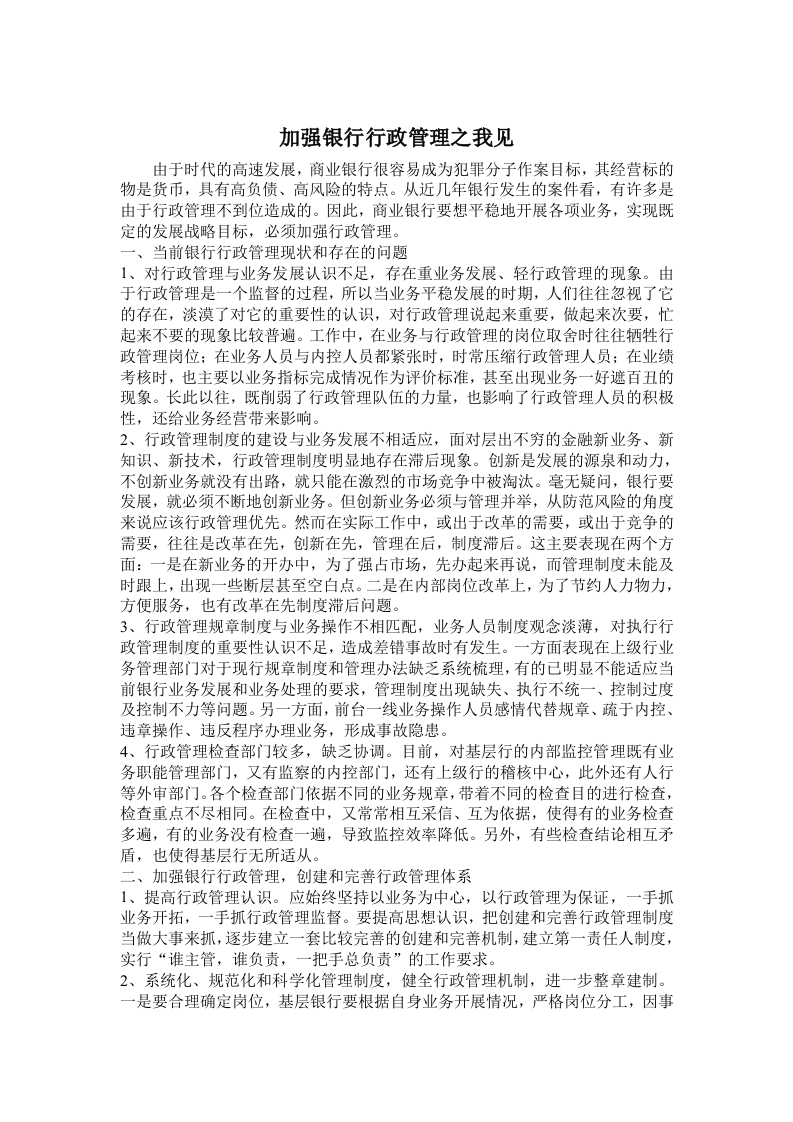 加强银行行政管理之我见由于时代的高速发展,商业银行很容易成为犯罪分子作案目标,其经营标的物是货币,具有高负债、高风险的特点。从近几年银行发生的案件看,有许多是由于行政管理不到位造成的。因此,商业银行要想平稳地开展各项业务,实现既定的发展战略目标,必须加强行政管理。一、当前银行行政管理现状和存在的问题1、对行政管理与业务发展认识不足,存在重业务发展、轻行政管理的现象。由于行政管理是一个监督的过程,所以当业务平稳发展的时期,人们往往忽视了它的存在,淡漠了对它的重要性的认识,对行政管理说起来重要,做起来次要,忙起来不要的现象比较普遍。工作中,在业务与行政管理的岗位取舍时往往牺牲行政管理岗位:在业务人员与内控人员都紧张时,时常压缩行政管理人员:在业绩考核时,也主要以业务指标完成情况作为评价标准,甚至出现业务一好遮百丑的现象。长此以往,既削弱了行政管理队伍的力量,也影响了行政管理人员的积极性,还给业务经营带来影响。2、行政管理制度的建设与业务发展不相适应,面对层出不穷的金融新业务、新知识、新技术,行政管理制度明显地存在滞后现象。创新是发展的源泉和动力,不创新业务就没有出路,就只能在激烈的市场竞争中被淘汰。毫无疑问,银行要发展,就必须不断地创新业务。但创新业务必须与管理并举,从防范风险的角度来说应该行政管理优先。然而在实际工作中,或出于改革的需要,或出于竞争的需要,往往是改革在先,创新在先,管理在后,制度滞后。这主要表现在两个方面:一是在新业务的开办中,为了强占市场,先办起来再说,而管理制度未能及时跟上,出现一些断层甚至空白点。二是在内部岗位改革上,为了节约人力物力,方便服务,也有改革在先制度滞后问题。3、行政管理规章制度与业务操作不相匹配,业务人员制度观念淡薄,对执行行政管理制度的重要性认识不足,造成差错事故时有发生。一方面表现在上级行业务管理部门对于现行规章制度和管理办法缺乏系统梳理,有的已明显不能适应当前银行业务发展和业务处理的要求,管理制度出现缺失、执行不统一、控制过度及控制不力等问题。另一方面,前台一线业务操作人员感情代替规章、疏于内控、违章操作、违反程序办理业务,形成事故隐患。4、行政管理检查部门较多,缺乏协调。目前,对基层行的内部监控管理既有业务职能管理部门,又有监察的内控部门,还有上级行的稽核中心,此外还有人行等外审部门。各个检查部门依据不同的业务规章,带着不同的检查目的进行检查,检查重点不尽相同。在检查中,又常常相互采信、互为依据,使得有的业务检查多遍,有的业务没有检查一遍,导致监控效率降低。另外,有些检查结论相互矛盾,也使得基层行无所适从。二、加强银行行政管理,创建和完善行政管理体系1、提高行政管理认识。应始终坚持以业务为中心,以行政管理为保证,一手抓业务开拓,一手抓行政管理监督。要提高思想认识,把创建和完善行政管理制度当做大事来抓,逐步建立一套比较完善的创建和完善机制,建立第一责任人制度,实行“谁主管,谁负责,一把手总负责”的工作要求。2、系统化、规范化和科学化管理制度,健全行政管理机制,进一步整章建制。一是要合理确定岗位,基层银行要根据自身业务开展情况,严格岗位分工,因事设岗,因岗定人,对于一些不相容的岗位,必须实行岗位分离,以达到相互制约,预防风险的目的。上级行也可以在调查研究的基础上,根据不同业务特点,业务规模大小,提出多种不同岗位设置方案供基层参考,加强岗位设置的指导。二是要明晰职责,要明确各岗位或员工在业务操作中的责权划分以及应承担的责任,使每一项业务环节都纳入控制过程。三是要建立规章制度,坚持实行制度在先、学习紧随其后、业务最后开办的模式,根据“授权有限、相互牵制”的原则,按照全面、具体、精炼、有针对性、便于操作的要求,不断完善制度。要按照业务的项目建立健全制度与操作规程,避免不同管理部门在同一业务不同环节上制度与操作规范的脱节或者矛盾。四是要建立管理流程,建立以市场为导向的新业务流程和管理流程,突出行政管理的中心环节和重点部位,以推动基层行经营管理的明晰化、规范化和科学化。3、实行行政管理制约制度,杜绝任何个人包办业务处理的全部环节,达到有效控制。在会计结算业务和出纳业务中,实行证、章、压(押)三分管,电子联行业务必须经办、复核、授权三分开,相互监督,确保银行资金安全。信贷业务要坚持审贷分离,不折不扣地执行信货经营、审批和监管三分离的制度,明确各环节的责任,推行信贷第一责任人、经营主责任人、审批主责任人制度。信用卡、营业网点、会计账务等岗位要建立全方位的双人复核制度,资金计划、人事行政等岗位也要按照内部牵制、授权有限的要求,建立相互制约的工作流程。4、加强行政管理的督查机制。业务管理部门与内控检查部门应转变监督观念,变被动为主动,强化过程的监督,不仅需要检查各项业务的操作是否合规,更重要的是防患于未然,将稽核的关口前移,从查弊到防范的转移,对业务中有倾向性的问题及时作出分析、判断,并提出切实可行的整改措施和建议。要充分利用现有各种业务的信息资料,开展非现场业务监控,通过不