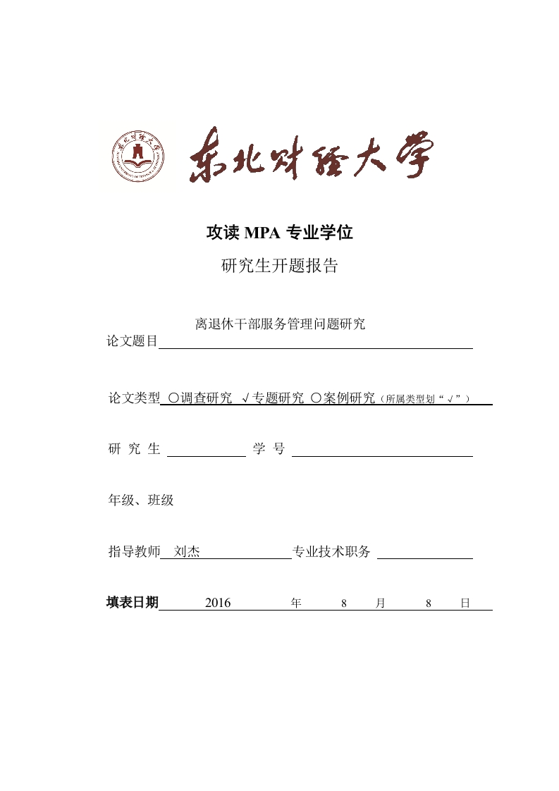 攻读MPA专业学位研究生开题报告离退休干部服务管理问题研究论文题目论文类型○调查研究√专题研究O案例研究(所属类型划“√”)研究生学号年级、班级指导教师刘杰专业技术职务填表日期2016年8月日离退休干部管理服务工作是一项复杂的社会工作,涉及面广,政策性强,离退休干部管理服务工作质量的优劣,不仅关系到离退休职工晚年的幸福生活,也直接关系到社会的繁荣稳定。党的十八届三中全会作出了全面深化改革的重大决定,吹响了全面深化改革的进军号,新一轮改革,是以完善和发展中国特色社会主义制度、推进国家治理体系和治理能力现代化为总目标,以经济体制改革为重点,以系协调推进经济体制、政治体制、文化体制、社会体制、生态文明体制和党的建设制度改革为重要内容的全面性、系统性、整体性改革,涉及领域多、范围广、困难度大。新时期离退休人员结构发生重大变化,离退休干部的思想状况也日趋活跃和复杂,对政治参与和精神文论化方面的需求更加突出:活动方式更加多样化,人户分离、居所多变、文外出频繁等情况逐步增多。上述这些变化,决定了我们不能再简单地沿选袭过去的办法,必须根据新形势、新情况,及时调整工作思路,使离退题休干部工作管理服务工作转型发展,在制定政策、改进服务、加强管理实等方面考虑得更加周全细致,把离退休干部工作做得更实更好。全面做离退休干部管理服务工作工作,具有非常重要的意义。第一,用是适应离退休干部工作自身变化的内在需要。随着经济社会快速发展和价我国人口老龄化程度日益加深,离休干部占比很小并呈现加速减少的趋值势,退休干部数量每年大幅增长,离退休干部队伍在思想观念、活动方理式、服务管理等方面也出现了很多新情况新问题,离退休干部工作中许论多问题还需回答与规范。第二,这是主动适应协调推进“四个全面”战意略布局和人口老龄化的新形势新要求,我国目前已经进入人口老龄化加义速发展时期。2015年我国老年人口达1.94亿,,2016年将达到2.16亿,占总人口的16%以上。离退休干部约占老龄人口总数的1/10,是老年人群体的优秀代表和骨干力量。习近平同志指出,“紧密结合我国经济社会发展要求和人口老龄化进程加快的客观实际,及时研究面临的新情况新问题,积极探索做好老干部工作的新途径新方法,健全完善老干部工作的体质、机制和制度,为走出一条中国特色老龄事业发展道路提供可借鉴的经验,这对于我国老龄事业长远健康发展是具有重大意义的”。三、是实现干部新老交替,保持干部队伍旺盛、生机与活力的重要措施:是激发广大在职干部积极性的重要手段:是废除领导职务终身制,实现国家长治久安的重要保证:是社会主义制度优越性的体现。国内研究现状国内研究老干部管理主要集中在一是对中共中央领导人的讲话、国家的法律法规、中共中央国务院及有关部门相关政策文件进行介绍和阐释的等。这些研究工作主要是对部分政策文件进行了汇编,这为相关方面的研究提供了很重要的资料参考。我国学者认为,我国实行干部退休制度20多年了,近几年离休干部人数大量减少,退休干部大量增长,加强对退休干部服务与管理工作的主体地位日益凸显,预计每年有350-450名千部将退休,年递增2.7-3.5%。学者们主要提出如何加强对干部退休制度的落实,如何以科学发展观为统领,跟上时代前进的步伐,使老干部工作及时转移到主要为退休干部服务与管理的轨道上来等问国题,其中对退休干部特别是普通退休干部的政治待遇落实多数难以到位的问题内尤为关键。由于绝大多数退休干部在职时关心党和国家的大事,热心参与政治外活动,所以退休后最在乎政治待遇的落实。基于此,我国学者对离退休干部管理服务工作的问题做了较为深入的研研究,也为我的论文打下了十分扎实的研究基础。究国外研究综述现离退休干部制度是具有典型的中国特色的制度,国外学者虽有基于中国国状情对离退休干部制度开展论述和研究,但文献数量较小,其主要原因是由于国外学者没有经历过中国离退休干部制度的演变过程,也无法对此作出十分详尽与的分析和研究。但是笔者从中国知网上搜索了相关外文文献,收集了一些国外发在养老模式、社区家庭养老方面的理论研究资料。同时将其与国外公职人员的展退休养老制度进行比较研究。其中对国外公职人员退休后的生活保障、政治保趋障等方面进行了资料搜集。然而,鉴于不同的政治体制和历史文化背景,每个国家的公职人员退休养老体制也各不相同,退休后的安置原则与方式、给予的势基本待遇基本保持一致,而退休养老的目的也都为了切实贯彻废止职务终身制,那么老弱病残群体也就必须退休,提供其相应的待遏,。纵观国外养老制度方面,大致可分为自保公助型、福利国家型和国家保险型立种:若从养老模式上分,又有居家养老、互助养老、机构养老等多种形式,不过还是社会化养老服务模式为方向和基准。总的来说,国外公职人员退休之后,都不再凭借曾经的公职人员的特殊身份来继续明显抢占其他社会资源,统一被纳入社会养老保障制度范围内,逐渐由单位人变为社会人,逐渐与其他社会老人群体同化,生产生活也从此社区化、社会化,这其中,有着许多值得我们学习的地方。