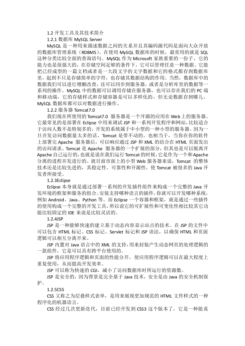 1.2开发工具及其技术简介1.2.1数据库MySQL ServerySQL是一种用来描述数据之间的关系并且其编码源代码是面向大众开放的数据库管理系统(RDBMS)。在使用MySQL数据库的时候,最常用的就是SQL这种分类比较全面的查询语句。ysQL作为Microsoft家族重要的一份子,它的能力也是很强大的,在存储空间足够的条件下,它可以管理任意一种数据。它能把已经成型的一篇文档或者是一大段文字的文字数据和它的格式都存到数据库里,起到不只是存储简单的字符,也存储其数据结构的作用。当然,数据库中的数据我们可以进行增删改查,还可以同步到服务器,或者是分析库里的数据等一系列的操作。MySQL中的数据可以调用存储在服务器,也可以存在我们的PC端和移动端,它的存储样式和存储容器是可以多样化的,但无论数据存到哪儿,MySQL数据库都可以对数据进行操作。1.2.2服务器Tomcat7.0我们现在所使用的Tomcat?7.0服务器是一个开源的应用在Web上的服务器。它最常见的是部署在Eclipse中用来调试JSP和一系列开发程序和网站,比较适合于访问人数不是特别多的,开发的系统属于中小型的一种小型的服务器。因为一旦并发访问数据量太多的话,Tomcat是带不动的。也相当于,当你在你的软件上部署完Apache服务器后,可以响应通过SP和ML的结合在HTML页面发出的访问请求。Tomcat是Apache服务器的一个扩展的部分,但其也是可以脱离开Apache自己运行的,也就是说在我们运行Tomcat的时候,它是作为一个和Apache分离的进程并发进行的。就目前市面上的小型Web服务器来说,Tomcat的整体技术还是比较先进的,其稳定性、可靠性和开源性,使Tomcat被很多的Java开发者所接受。1.2.3EclipseEclipse本身就是通过部署一系列的开发插件组件来构成一个完整的Java开发环境的框架和服务的组合。安装支持哪种语言的插件,你就可以开发哪种系统,例如Android、Java、Python等。而Eclipse一个容器和框架,就是通过一些插件的使用构成一个完整的开发工具,所以说它的可扩展性和可变化性相比较其它功能比较固定的IDE来说是比较灵活的。1.2.4JSPJSP是一种能够快速的建立基于动态内容显示站点的技术。在SP的文件中可以包含HTML标记、CSs标记、Servlet标记和JSP语法,以确保HTML和页面逻辑可以相互分离开来。JSP内置对Java语言中的ML的支持,用来封装产生动态网页的处理逻辑的款组件,它是可以具有跨平台使用的。JSP将应用程序逻辑和页面的性能分开,使应用程序逻辑可以在最大程度上重复使用,从而提高开发效率。JSP可以称为快速的CGl,减小了访问数据库时所运行的资源数JSP是安全的,因为背景是完全基于Java技术,安全是由Java的安全机制保护。CSS又称之为层叠样式表单,是用来展现更加规范的HTML文件样式的一种程序化的机器语言。CSS经过几次更新迭代,目前已经开发到CSS3这个版本了,它是一种能真正实现网页的界面布局显示和所需功能内容完全分离的一种可以设计多种样式的程序语言。CSS相较于HTML来说,前者能够对网页对象的一些布局,排版等信息精确到像素级别,并且可以任意切换你的文本显示的字体和字号,能够更方便编辑和修改样式,也能够与网页进行交互,实现文本展示的最高体现,是目前最容易被使用不同编程语言的人所接受的一种设计语言。1.2.6JavaScriptJavaScript是一种将代码直接编译的脚本语言,它可以支持源代码,动态代码和代码性比较弱的语言。JavaScript引擎由于它的直译性,被一些浏览器当作翻译器的脚本语言被我们的客户端或者说网页端所使用。由于其支持动态代码,也常常被用来提高HTML网页的动态性。JavaScript语言使用基本表达式和算术运算符作为它基本的组成架构方式。1.2.7SSH框架SSH是现在所流行的web开发程序的集成框架的其中一个,它使用struts+-spring+hibernate这几个框架的集合进行开发。SSH作为一种多框架的集成框架,能够帮助使用SSH的开发人员搭建结构,而且复用性较好,一个系统的SSH框架可以再次使用,用于新的程序的框架,这样复用框架方便web的维护。Struts是整个系统的架构,使用Spring进行MNC分离,利用Hibernate操作数据库对数据进行支持,三者统一协调。