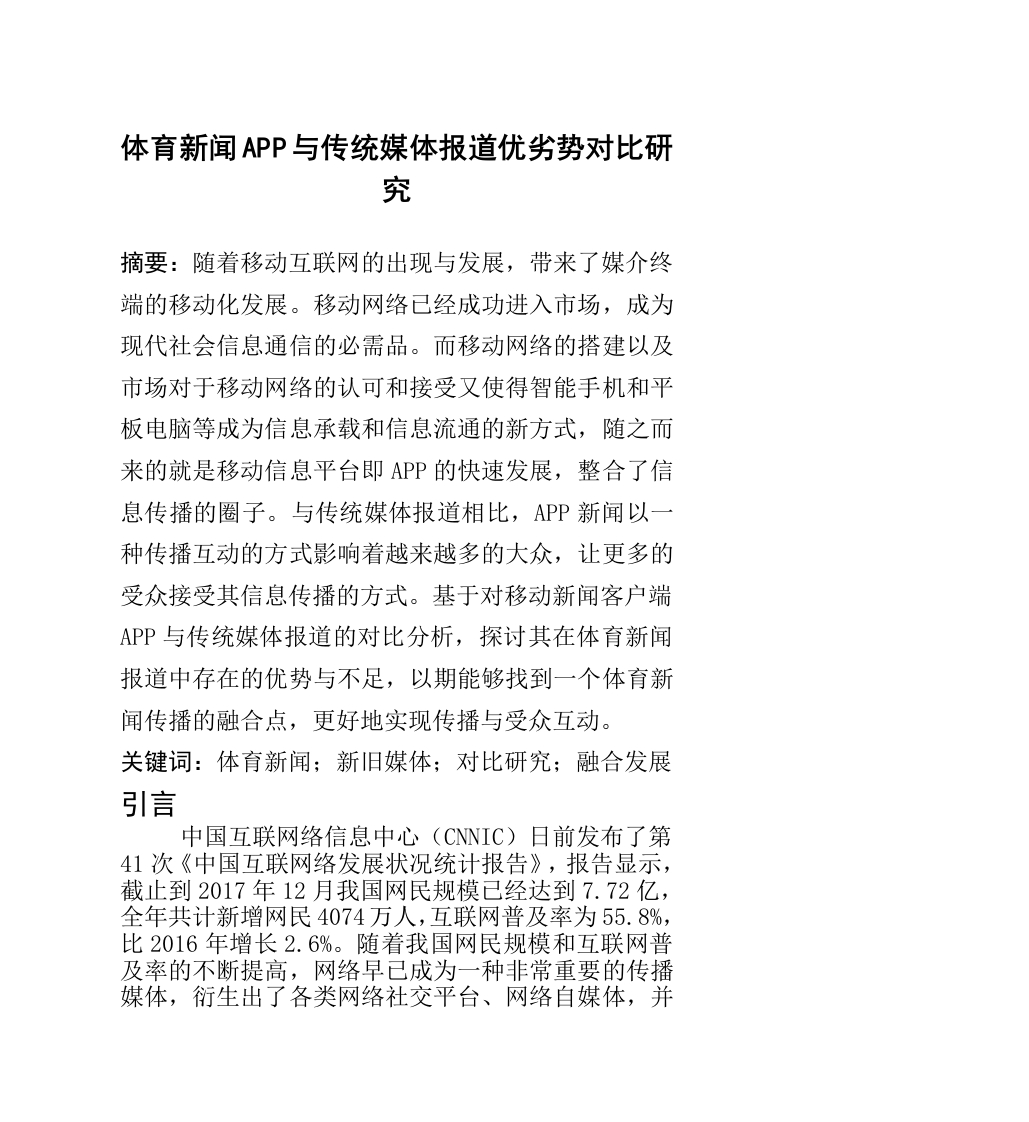 体育新闻APP与传统媒体报道优劣势对比研究摘要:随着移动互联网的出现与发展,带来了媒介终端的移动化发展。移动网络已经成功进入市场,成为现代社会信息通信的必需品。而移动网络的搭建以及市场对于移动网络的认可和接受又使得智能手机和平板电脑等成为信息承载和信息流通的新方式,随之而来的就是移动信息平台即APP的快速发展,整合了信息传播的圈子。与传统媒体报道相比,APP新闻以一种传播互动的方式影响着越来越多的大众,让更多的受众接受其信息传播的方式。基于对移动新闻客户端APP与传统媒体报道的对比分析,探讨其在体育新闻报道中存在的优势与不足,以期能够找到一个体育新闻传播的融合点,更好地实现传播与受众互动。关键词:体育新闻;新旧媒体;对比研究;融合发展引言中国互联网络信息中心(CNNIC)日前发布了第41次《中国互联网络发展状况统计报告》,报告显示,截止到2017年12月我国网民规模已经达到7.72亿,全年共计新增网民4074万人,互联网普及率为55.8%,比2016年增长2.6%。随着我国网民规模和互联网普及率的不断提高,网络早已成为一种非常重要的传播媒体,衍生出了各类网络社交平台、网络自媒体,并且提高了受众用户个人的参与度。传统媒体的网络转型,在短短几年内,把人际传播与大众传播统一到了起,催生出了一个多元化媒介环境,对于传统媒体来说既是机遇又是挑战。反观,传统媒体至今依然有着其存在的权威性,传统媒体在转播权以及深度报道等方面是新媒体不可比拟的,但是新媒体更好地迎合了受众的认知需求,更加适应新时期多元煤介下受众接受信息的传播特点。因此分析新媒体代表的新闻APP与传统媒体在体育新闻报道中的优势与不足,以更好地融合报道,对推动体育新闻发展有着重要的意义。一、体育新闻APP的兴起与发展(一)体育新闻APP的界定体育新闻APP的发展首先得益于移动互联网技术的发展,同时受众开始形成移动社交化的传播行为习惯,以手机为核心的移动新媒体成为社会信息传播过程中的重要载体。APP(Application)本身是指手机应用软件,体育新闻APP则是专门以生产体育新闻内容为主并未受众提供其他体育社交相关服务的APP,例如论坛开发。批注a2小:查找并用角标的形式注明这个定义的出处!(二)体育新闻APP的兴起与发展体育新闻APP是我国网络体育新闻发展的产物,也1批注3删除是受众需求的社交产物。我国网络体育新闻兴起于20世纪90年代,在我国介入互联网之后,网络体育新闻才开始有了迅速的发展,各大门户网站开始专门设立体育新闻专栏,对体育新闻展开不同形式的报道。目前我国体育网站分类较多,新闻APP仅仅是网络体育新闻报道的一个传播渠道,是针对于移动社交用户而专门设定的APP,主要应用于手机客户端,数量众多,但是发展较为完善的有新浪体育、虎扑体育等。以虎1批注4删除扑体育为例,2004年到2006年是它的初创阶段,这个阶段主要是以提供独家的新闻内容为主,在新闻质量上较好,例如翻译BA的外媒咨询。到2007年开始进行内容扩张,逐渐形成自己的栏目特色,也逐渐形成自己的体育营销。2012年开始开发手机APP业务,不断整合营销,最终投资产业项目。虎扑体育是众多体育新闻APP中发展较为成功的APP之一。随着互联1批注5,网的发展以及受众的需求变化,虎扑体育新闻报道的内容也不断扩展,同时开发新业务,由此形成了现如今“百家争鸣,百花齐放”的市场格局。二、体育新闻APP与传统媒体报道的优势与劣势(一)体育新闻APP报道的优势1.信息资源容量大新闻APP虽然在版块设置上有限,客户端展示的页面有限,但是其存在的超链接,因其容量超大并且为广大用户提供着超级多的体育赛事以及附带信息,随时可以更新内容。不但丰富新闻题材,还能够网罗,1批注6丰富调至题材后面各类体育新闻于客户端内。以虎扑体育为例,目前虎扑体育作为我国专业体育网站领域中较为成功的网站,日均PV(页面浏览量)超过1亿。此外,根据比达咨询(BigData-Research)数据中心监测数据显示,2016年体育新闻资讯类APP活跃用户数方面,新浪体育活跃用户609万,排名第一,虎扑体育以231.5万人排名第三,正因为新浪体育和虎扑体育为用户提供了丰富的信息,使得用户的活跃度不断提升。2.体育信息的互动优势在传统媒体时代,作为广大民众,被动接受媒体信息,无法与媒体之间进行互动,即使存在意见和分歧,也没有有效的表达途径。自媒体的发展,APP用