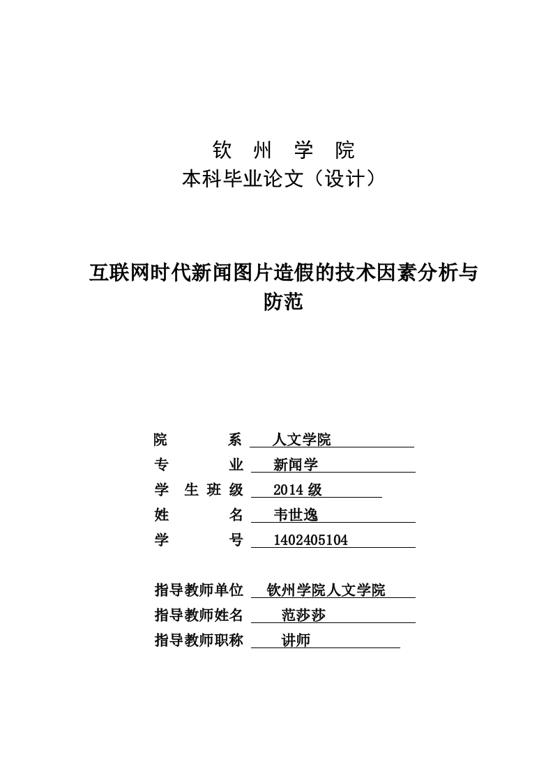 钦州学院本科毕业论文(设计)互联网时代新闻图片造假的技术因素分析与防范院系人文学院专业新闻学学生班级2014级姓名韦世逸学号1402405104指导教师单位软州学院人文学院指导教师姓名范莎莎指导教师职称讲师2018年4月互联网时代新闻图片造假的技术因素分析与防范新闻学专业2014级韦世逸指导教师范莎莎摘要互联网的普及,为图片造假现象的产生创造了相应的沃土,越来越多的互联网新闻当中出现了不同程度的图片造假现象,严重威胁着新闻的真实性。在这样的背景下开展相关的课题,针对互联网新闻中屡禁不止的造假现象进行研究势在必行。本文主要以最近频发的新闻图片造假现象为研究对象,同时从网络上找到很多的假图片作为研究案例,将其中涉及到的技术细节一一披露,在此基础上简要介绍新闻图片技术造假的整体水平,全面分析影响该技术形成的具体因素,找到其成因。笔者在此文中为大家简要介绍些许识别图片真假的常识,希望提高读者的鉴别水平,同时一定程度打击愈发严重的图片造假行为,积极营造一个图片真实的互联网世界,优化网络氛围。关键词:互联网新闻图片造假;造假技术因素:识别方法;应对策略:PS技术Analysis And Prevention Of the Technology Factor Of news PictureFraud In The Internet Age.Journalism,Grade 2014 Wei ShiyiSupervisor Fan ShashaAbstractPictures with the popularity of the Internet,fraud is becoming more and moreserious in the spread of the Internet,Internet news photos of fraud also seriously affect theauthenticity of the news,makes news authenticity challenged,it seriously affected thenetwork as the media credibility.Therefore,the research on Internet news image fraud hasgreat theoretical and practical significance.Based on the multiple occurrences of newspictures in the Internet fraud phenomenon as the research object,and the case study of a lotof fake pictures on the network,analyzing the characteristics of the study the spread ofnetwork news images,the basic situation of fraud,news pictures technology factors ofInternet news photos of fraud technical factors detailed analysis,and discusses its causesand try to put forward feasible methods to help people identify fake news pictures,InternetShiJia news photos didn't place in the Internet,in order to have a real Internet world,purifynetwork environment.Keywords:Fake Internet news pictures.,technical factors,recognition method,coping strategies,PS technology