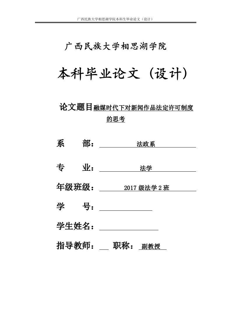 广西民族大学相思湖学院本科生毕业论文(设计)广西民族大学相思湖学院本科毕业论文(设计)论文题目融媒时代下对新闻作品法定许可制度的思考系部:法政系专法学年级班级:2017级法学2班学号:学生姓名:指导教师:一职称:副教授广西民族大学相思湖学院本科生毕业论文(设计)目录1Abstract.......2前言1问题的提出.…2融媒体时代和新闻作品著作权2.1融媒体时代的概述62.2新闻作品的概述.·3融媒体时代下法定许可制度之困境3.1报刊转载法定许可引进网络领域的曲折历程83.2报刊转载法定许可制度引入网络领域惹争议84融媒时代下的法定许可制度需完普105融媒时代浪潮下利益冲突的解决建议115.1完善著作权法定许可制度115.2完善法定许可获酬机制..115.3完善新闻作品授权的形式,125.4明确法定许可相关主体的权利和义务125.5增强版权意识、鼓励创作12结论131415广西民族大学相思湖学院本料生毕业论文〔设计)摘要新闻作品作为新闻行业的核心内容产物,对于整个新闻行业的发展都有着至关重要的作用,但随着网络技术的快速变革,加之我国著作权法律修改的时间周期过长等原因,使得融媒体时代快速发展的同时,新闻作品的著作权保护却显得较为落后。各个媒体的新闻作品,如今不仅仅是通过电视、报纸或者广播等传统媒介的方式传播但推动作品传播的同时,种种恶劣的现象致使新闻作品的版权侵权问题越来越严重。新闻转载行为需要进行严格限制,新闻作品版权人的合法权益需要科学保护,以及法定许可制度需要完善,本文将通过对新闻作品转载开放许可的有关制度进行学习并研究,根据其困境和问题提出相关建议,实现版权市场良好有序运行的目标。关键词:版权:新闻作品:法定许可